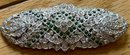 A large ART DECO brooch, with a geometric pattern in clear and emerald colored paste stones. Roughly 100 years old but presents quite well. Missing several diminutive stones, but in very good overall condition for age.