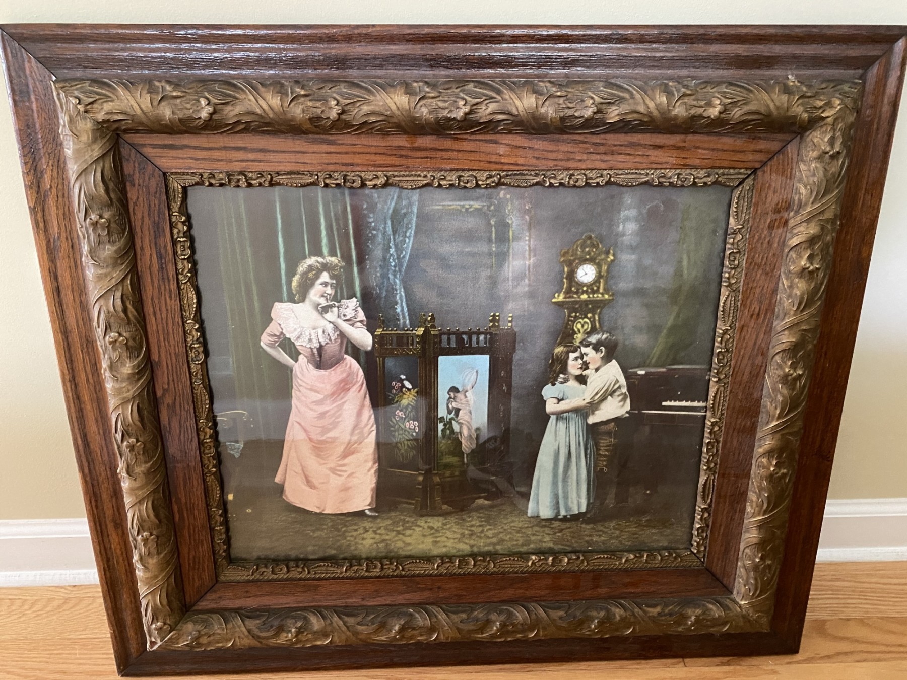 We often perceive the past in black and white – after all, the vast majority of photographs from the 1910s through in to the 1930s and 40s are monochrome. Yet a color photography process called the Autochrome Lumière was patented in 1903 and remained in use until the end of the l930's. I believe that this is that process. This photo was the owner"s grandmother's wedding gift . This frame is stunning. it mesures 30 x 16 1/2