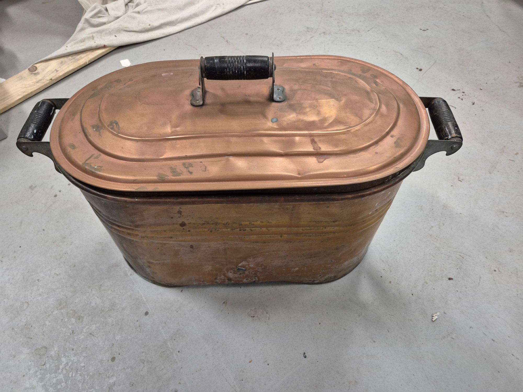 Large antique late 19th century solid copper wash basin/tub, with original fitted lid. It is in good overall condition, with light expected soft dents in spots. A fantastic country primitive, which has many practical uses even today.