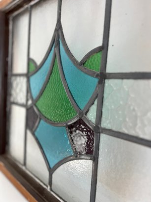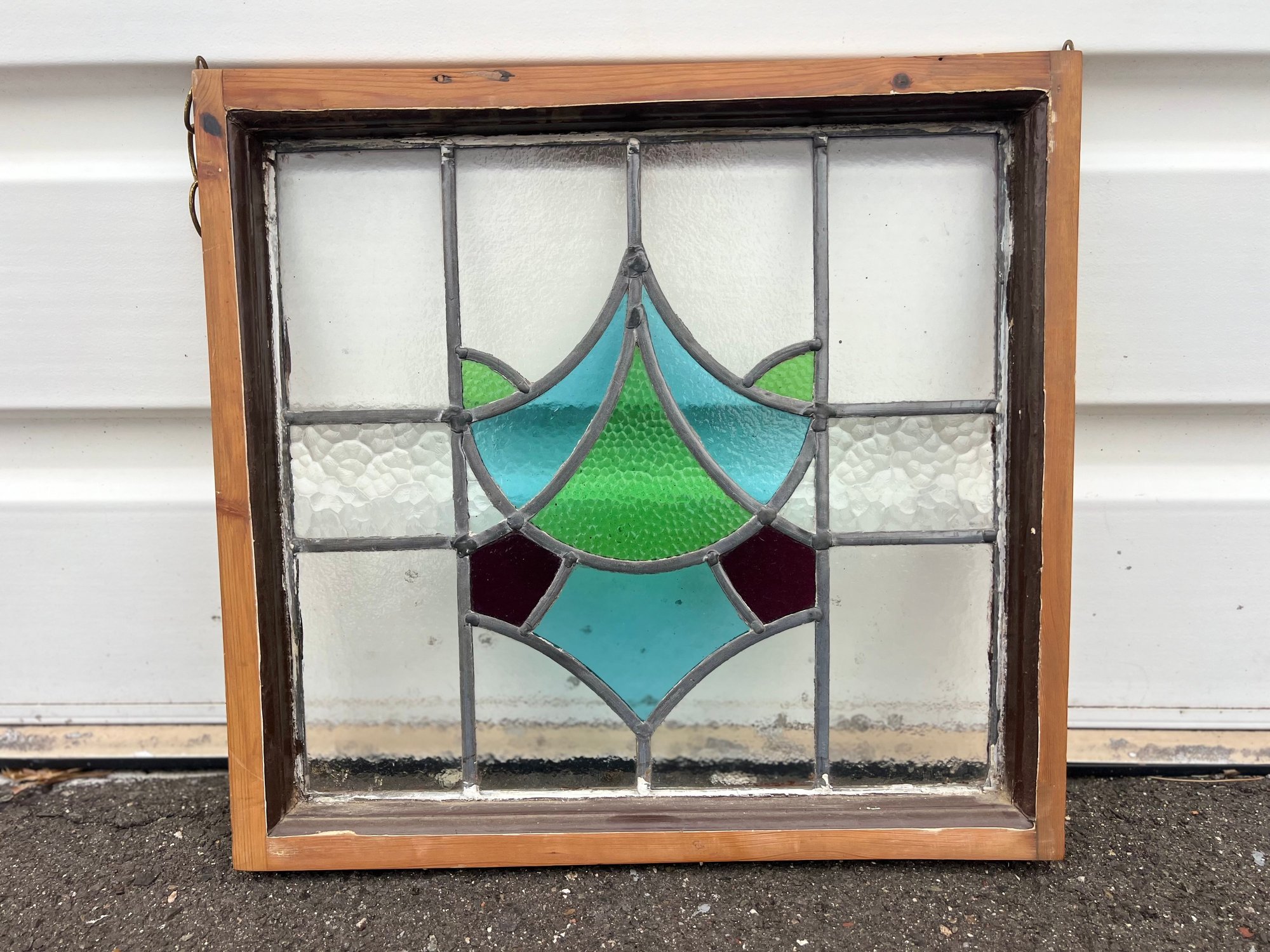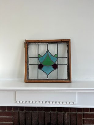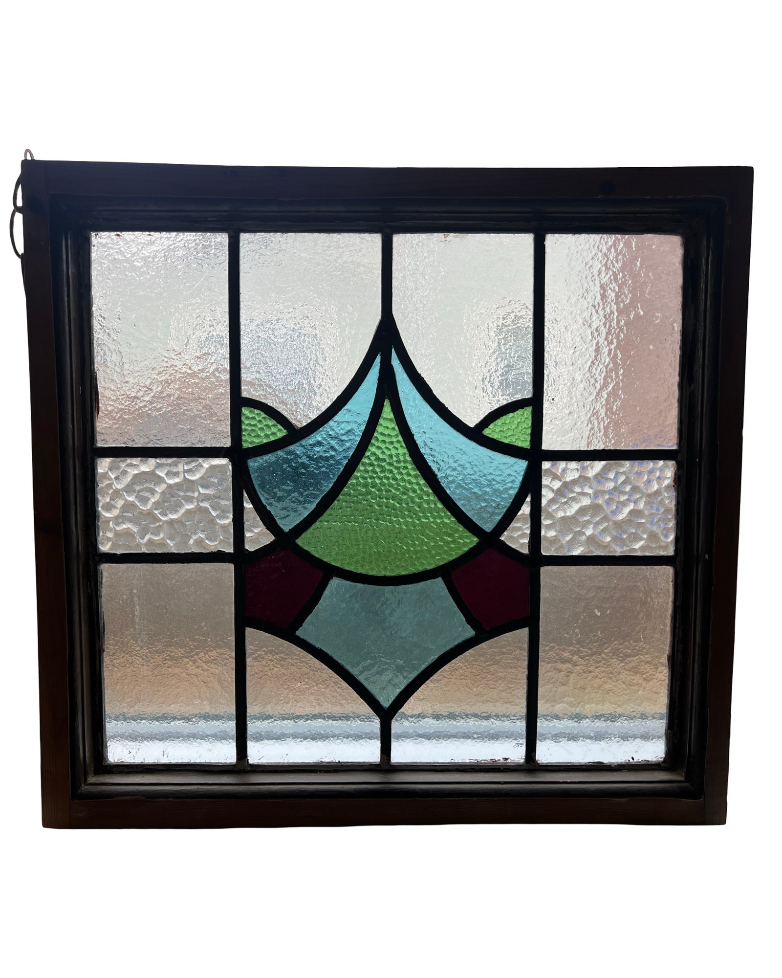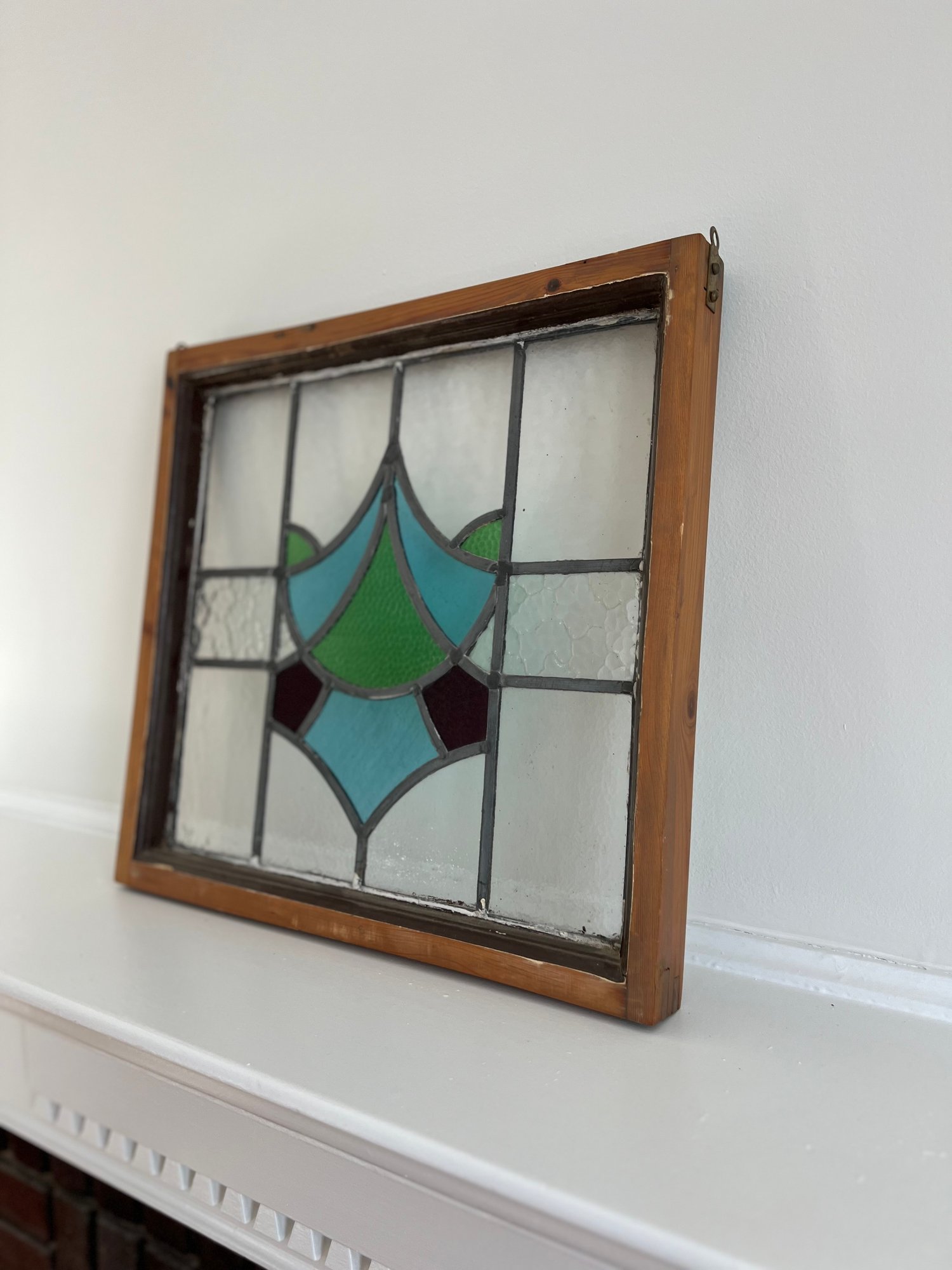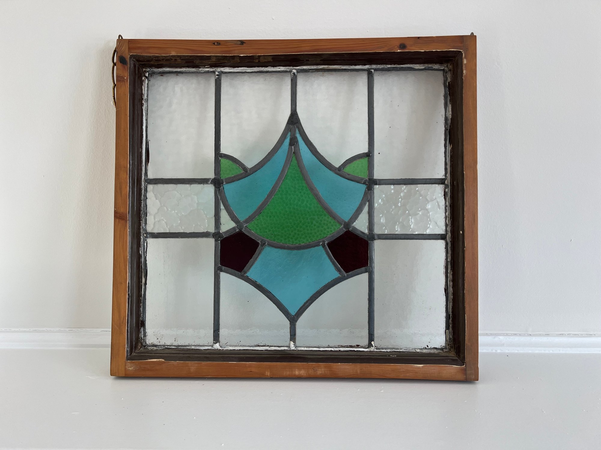 Set within its original wooden frame, this panel has strong architectural presence and reflects the craftsmanship typical of period English stained glass work. Pieces like this were commonly used in transoms, stair landings, or interior windows and are now highly sought after as architectural antiques and decorative collectibles.