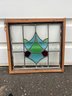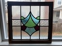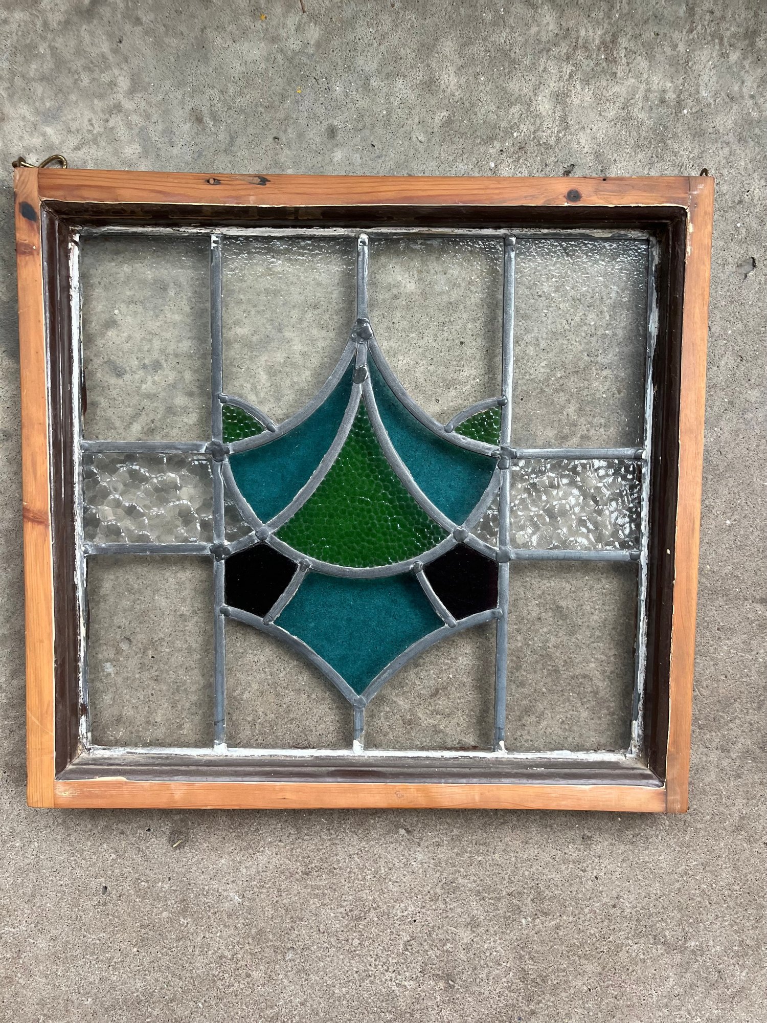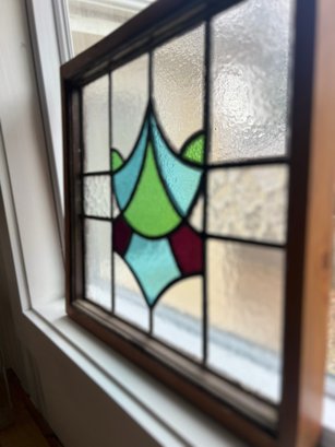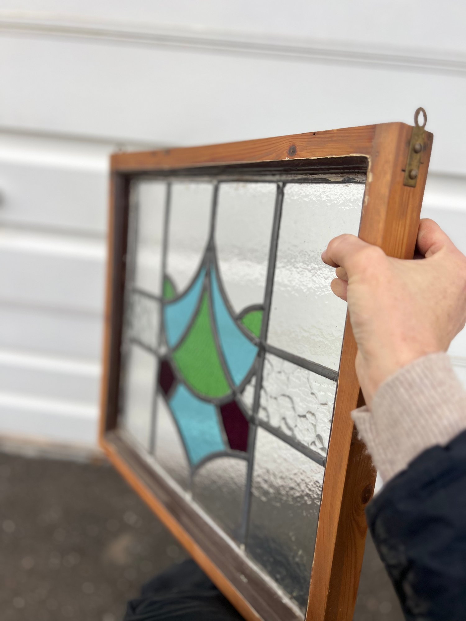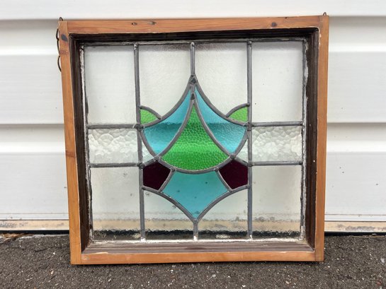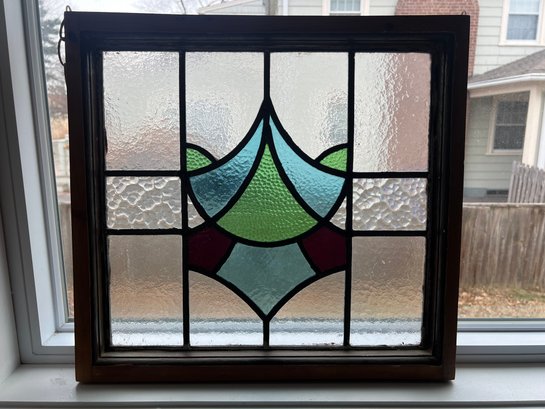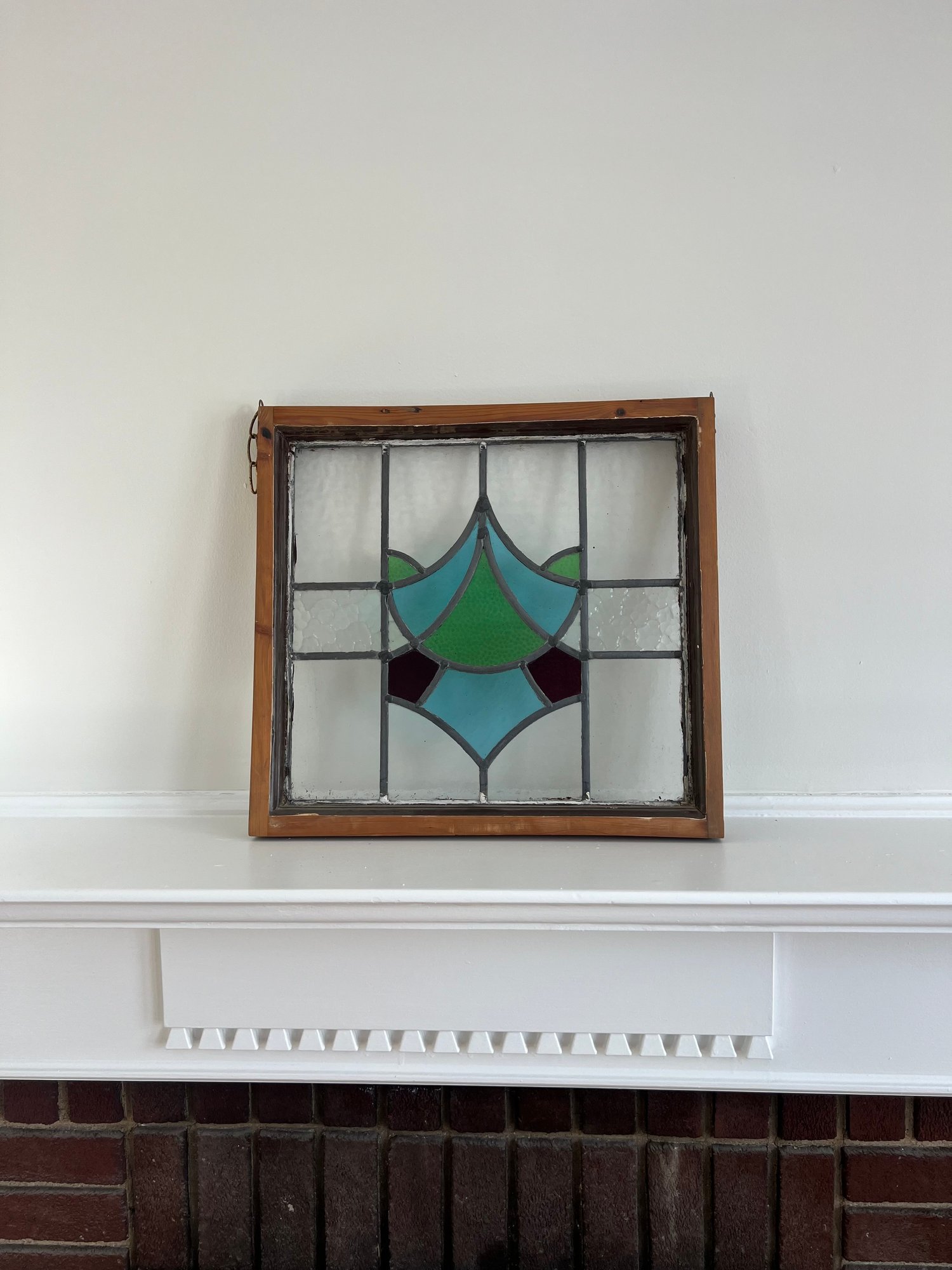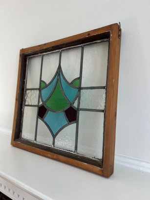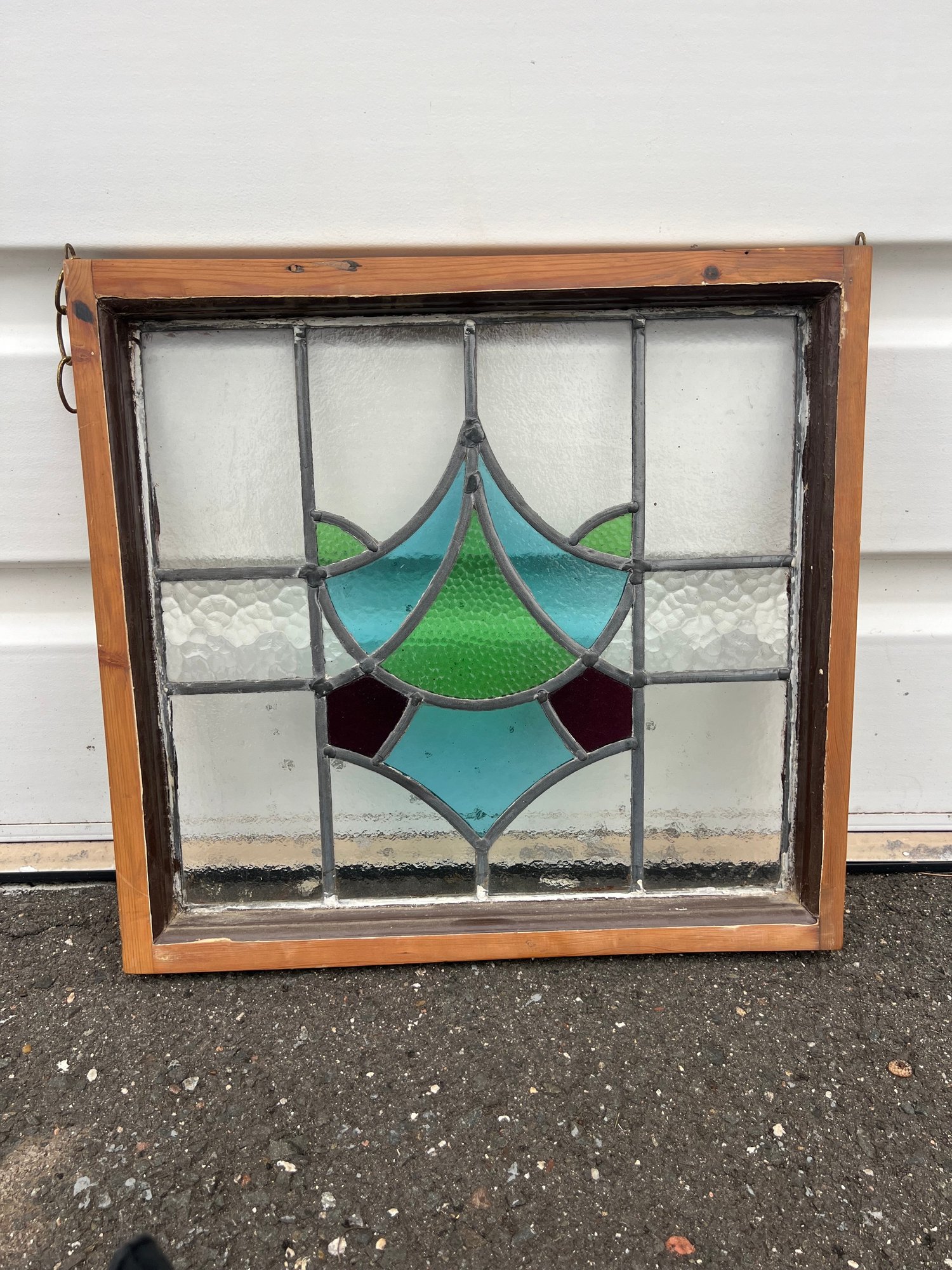 Set within its original wooden frame, this panel has strong architectural presence and reflects the craftsmanship typical of period English stained glass work. Pieces like this were commonly used in transoms, stair landings, or interior windows and are now highly sought after as architectural antiques and decorative collectibles.