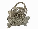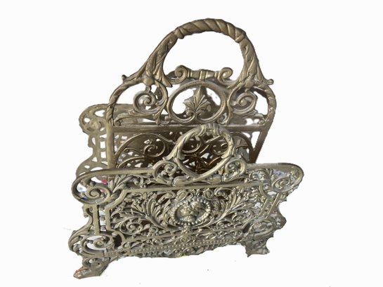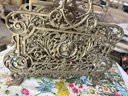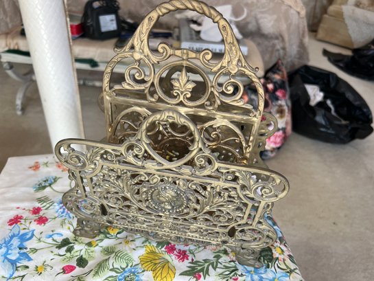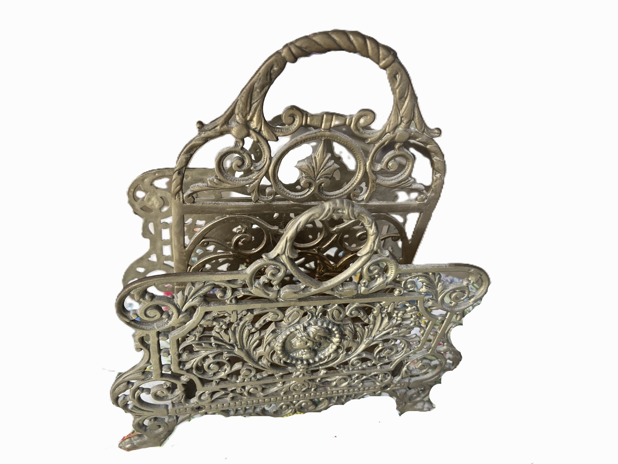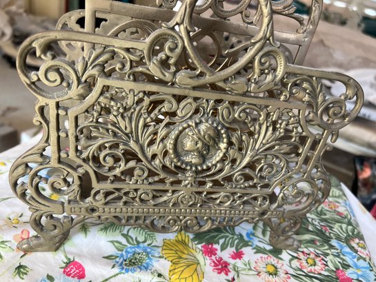Antique very ornate solid brass filigree letter or newspaper stand with a handle and a cartouche featuring a woman's face.