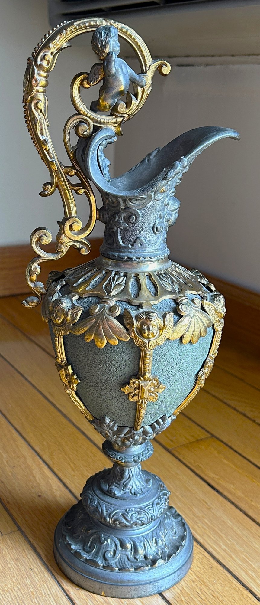 Stunning antique ewer, featuring a figural putti seated on the handle, green-man figure inside the spout, maiden below spout, and gold gilt applied decoration with winged cherubs. It is dated on the underside to 1894, so a true antique example. VERY ornate. Condition is good throughout. Stands 14.5".