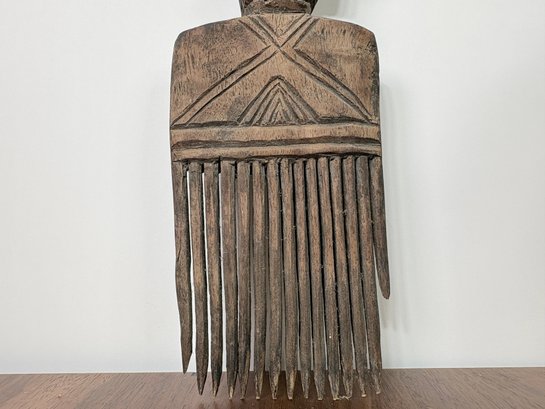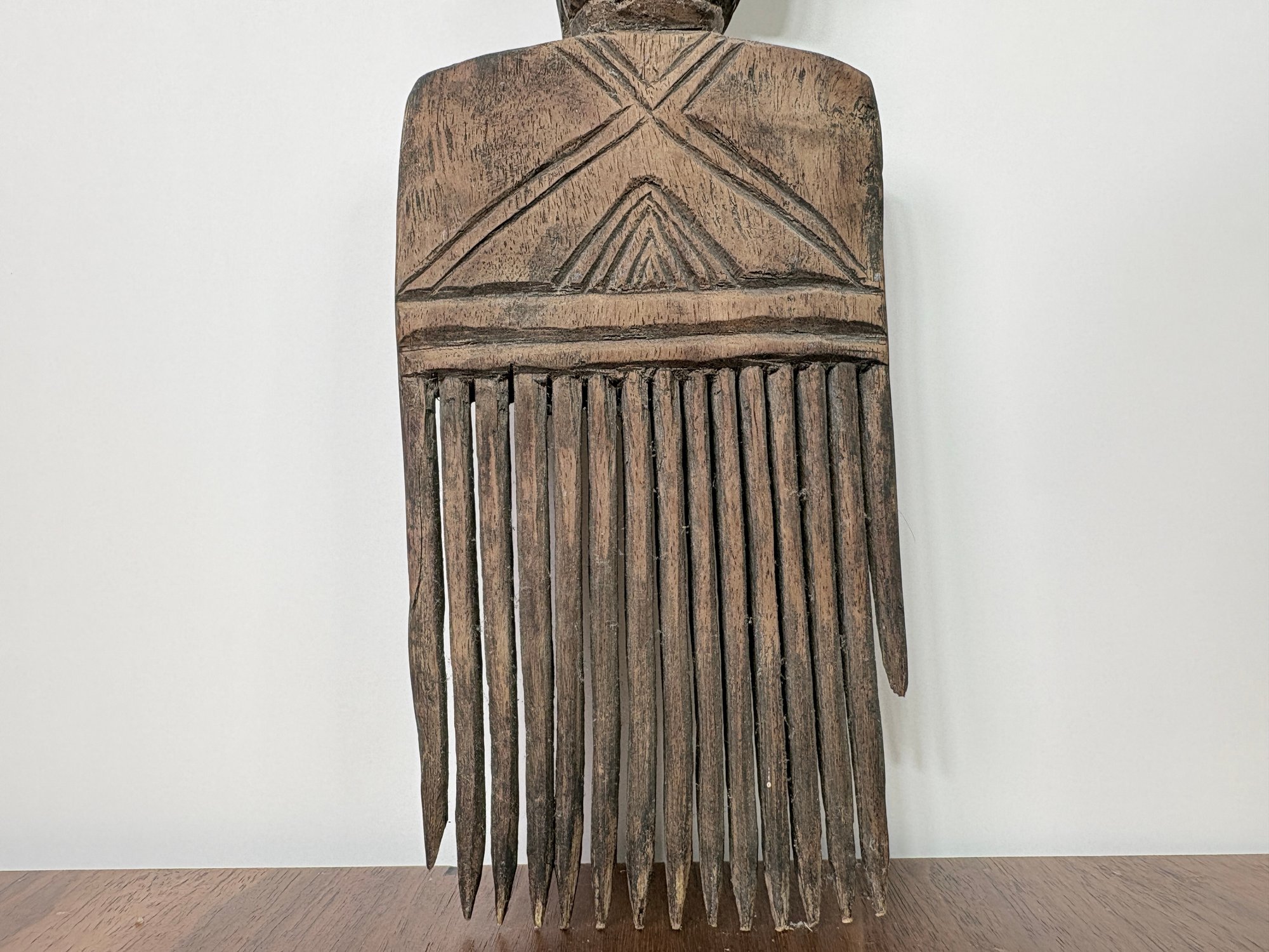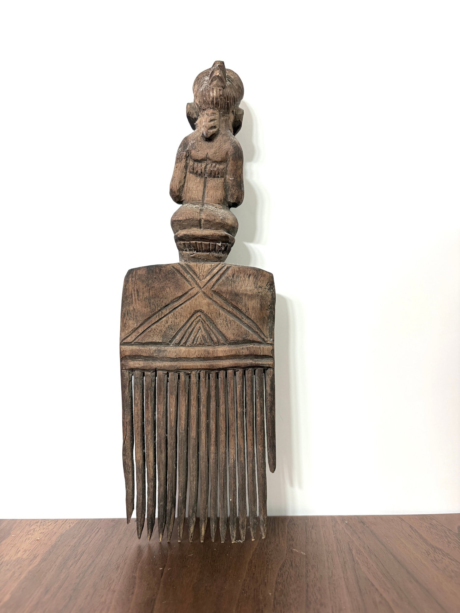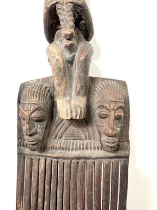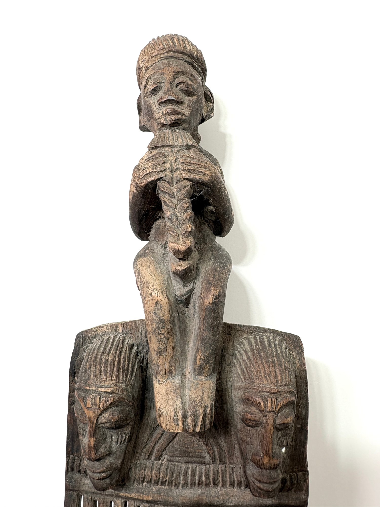 An amazing Old and rare wood comb with a standing figure with flanking busts decorated with geometric carvings. The Akan speaking women of Ghana include the Anyu, Baule, and Fante. All these women use wooden hair combs both for combing hair and for decoration and adornment. Combs are obtained as gifts from admirers or presented at marriage.Large bridal combs were prestigious and used to adorn the home. Depending on a woman's wealth or beauty she might own three or four.