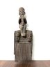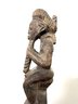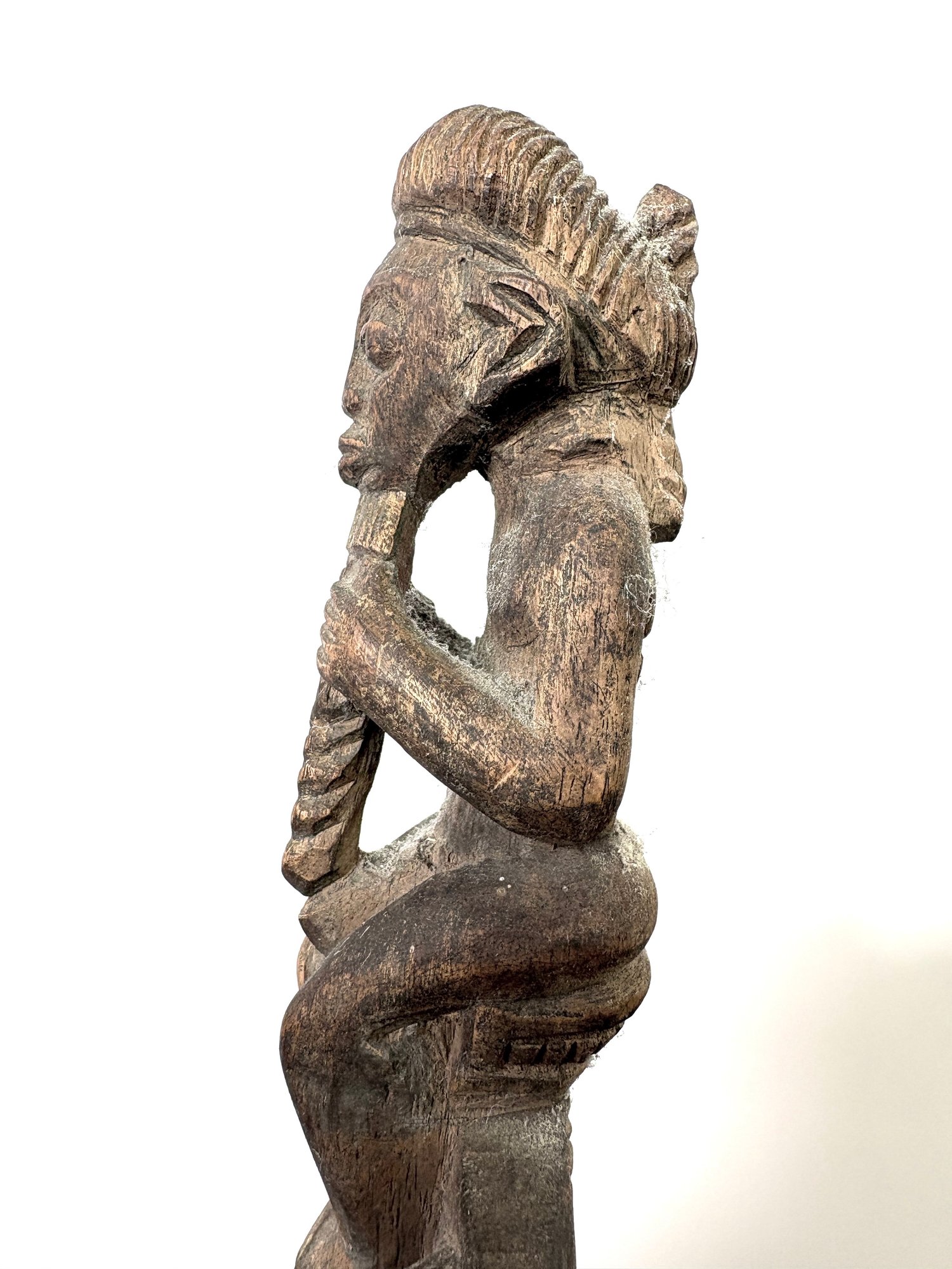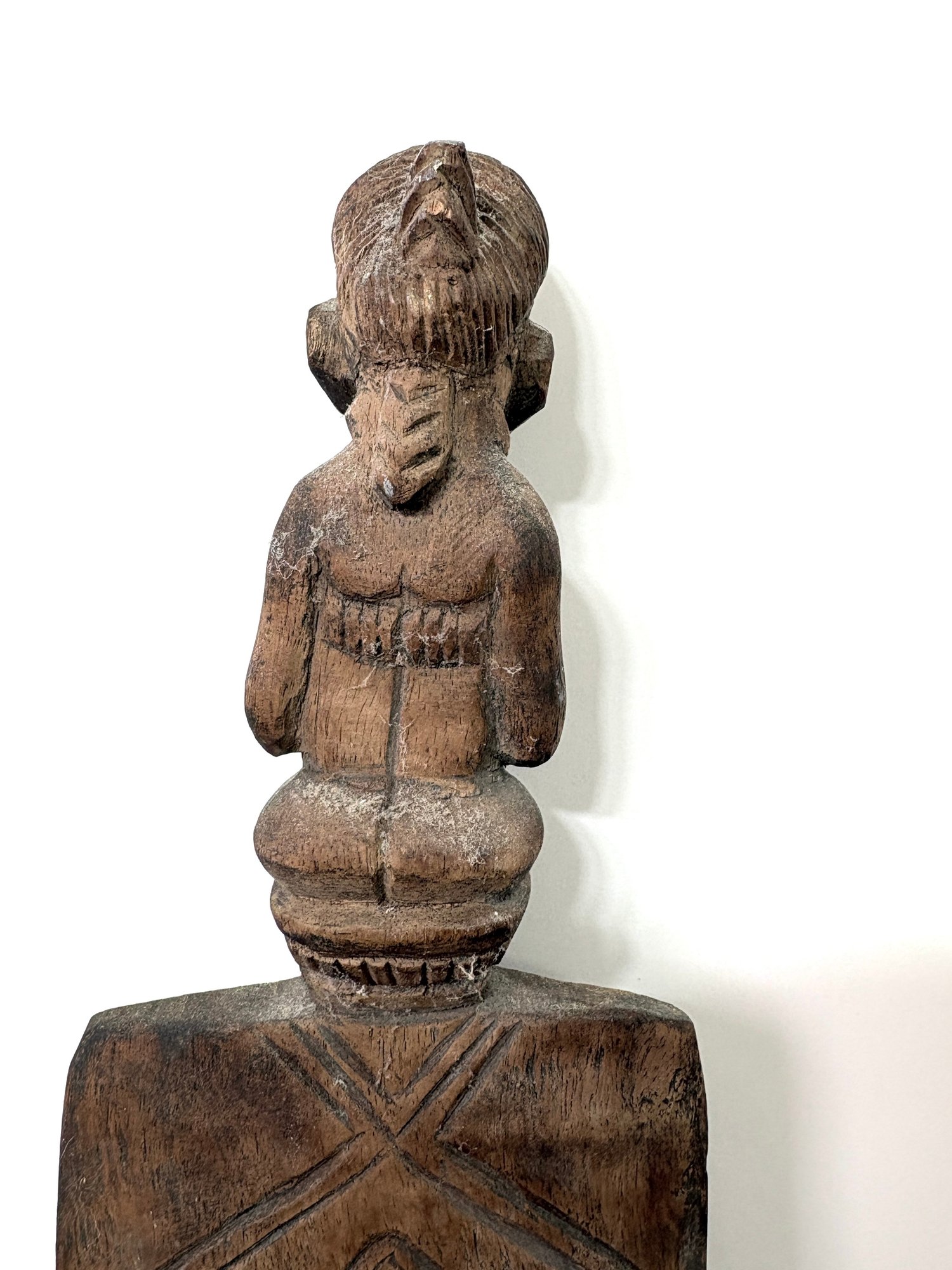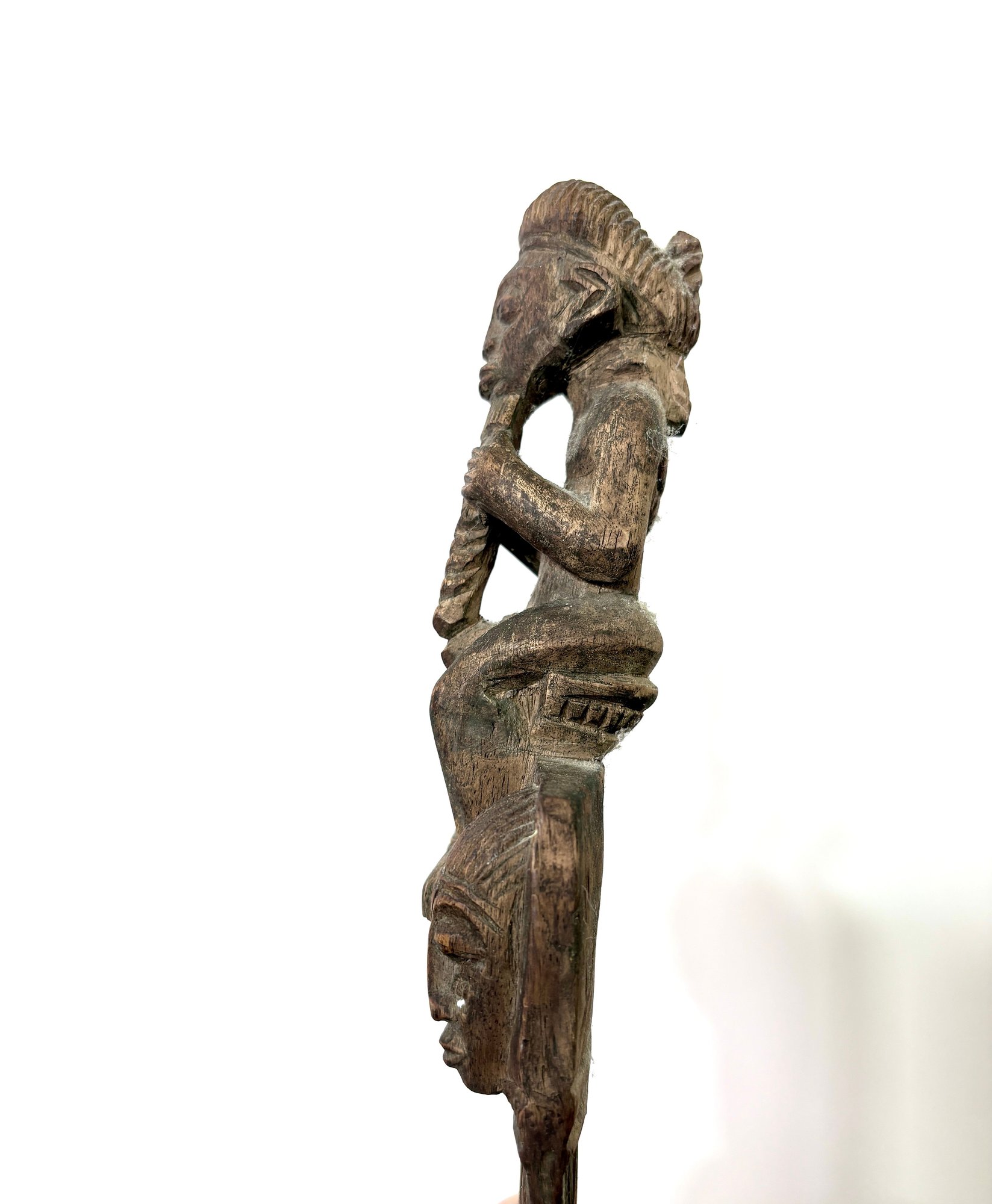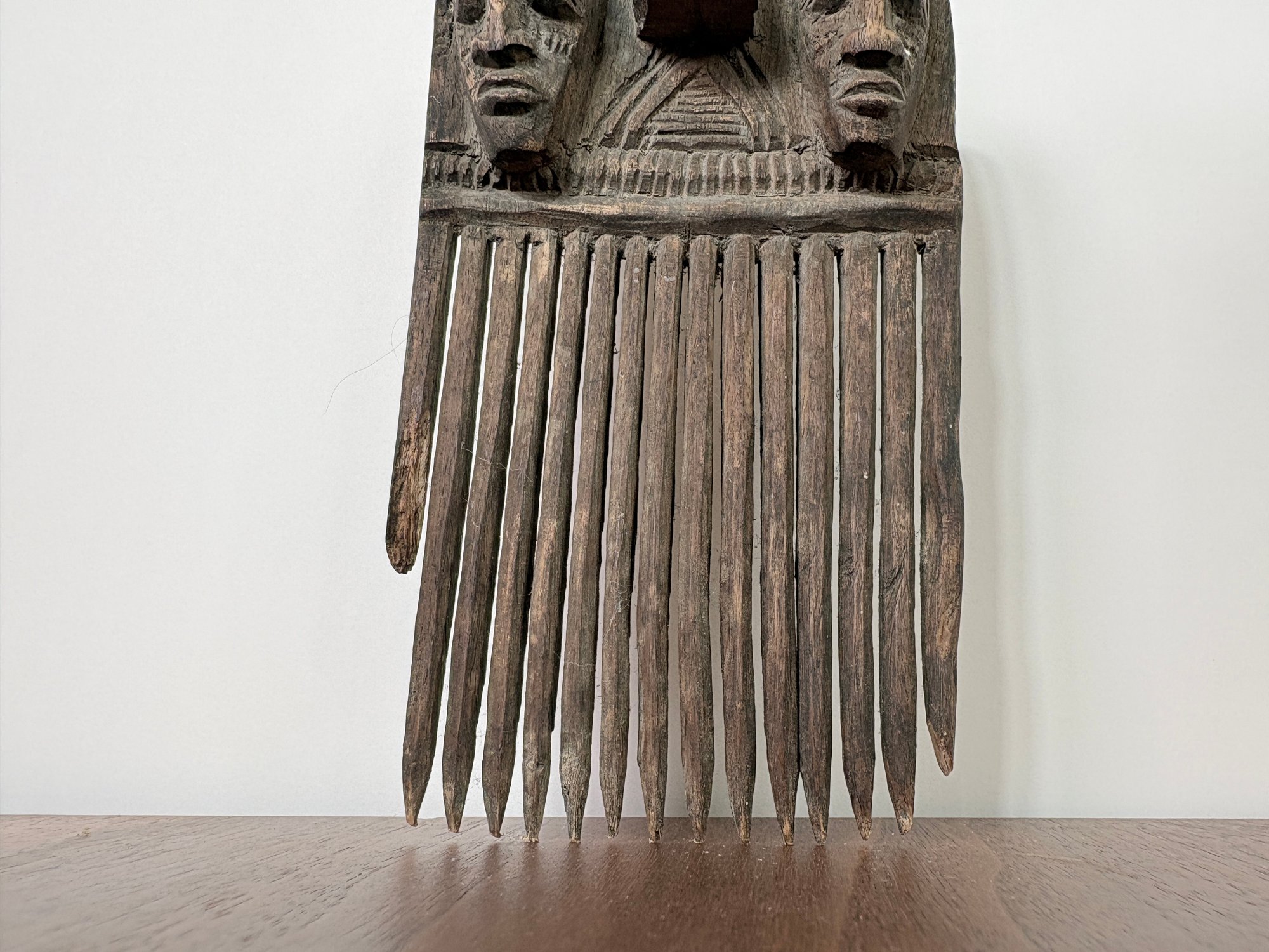 An amazing Old and rare wood comb with a standing figure with flanking busts decorated with geometric carvings. The Akan speaking women of Ghana include the Anyu, Baule, and Fante. All these women use wooden hair combs both for combing hair and for decoration and adornment. Combs are obtained as gifts from admirers or presented at marriage.Large bridal combs were prestigious and used to adorn the home. Depending on a woman's wealth or beauty she might own three or four.