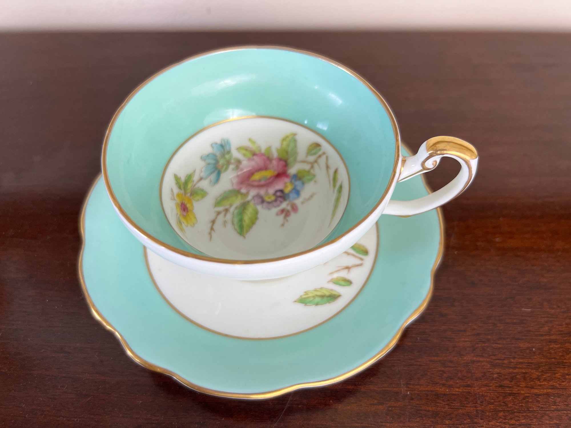 Antique soft teal blue teacup and saucer hand-painted with a floral design signed A. Taylor, stamped Foley Bone China Made in England on the underside.