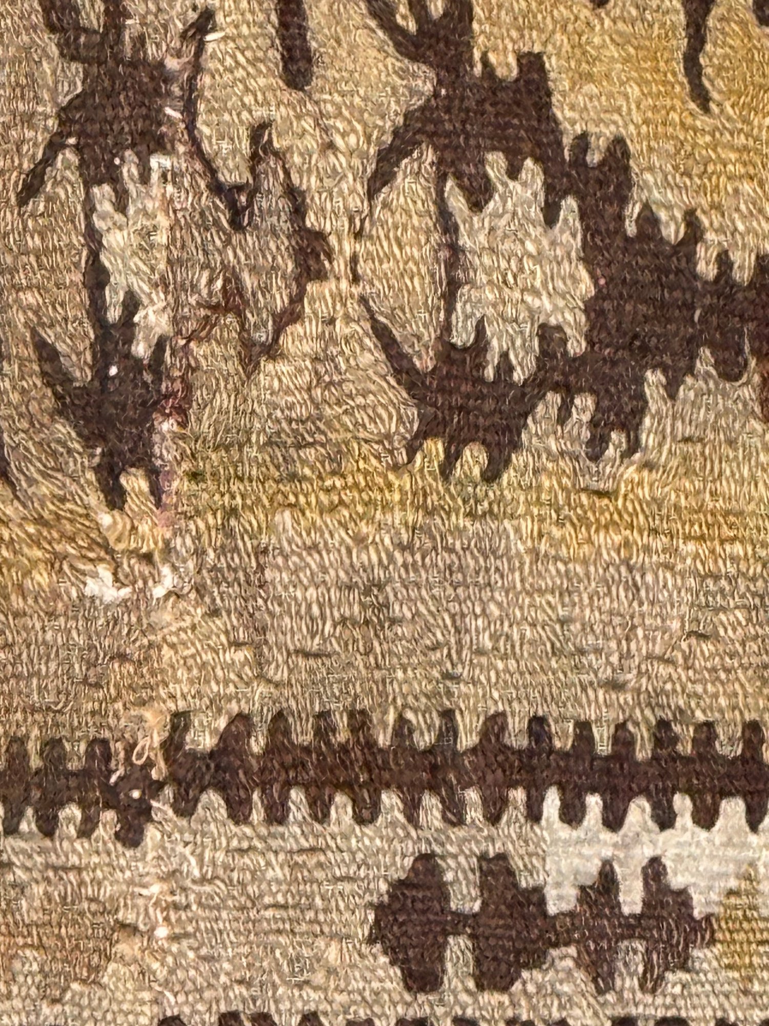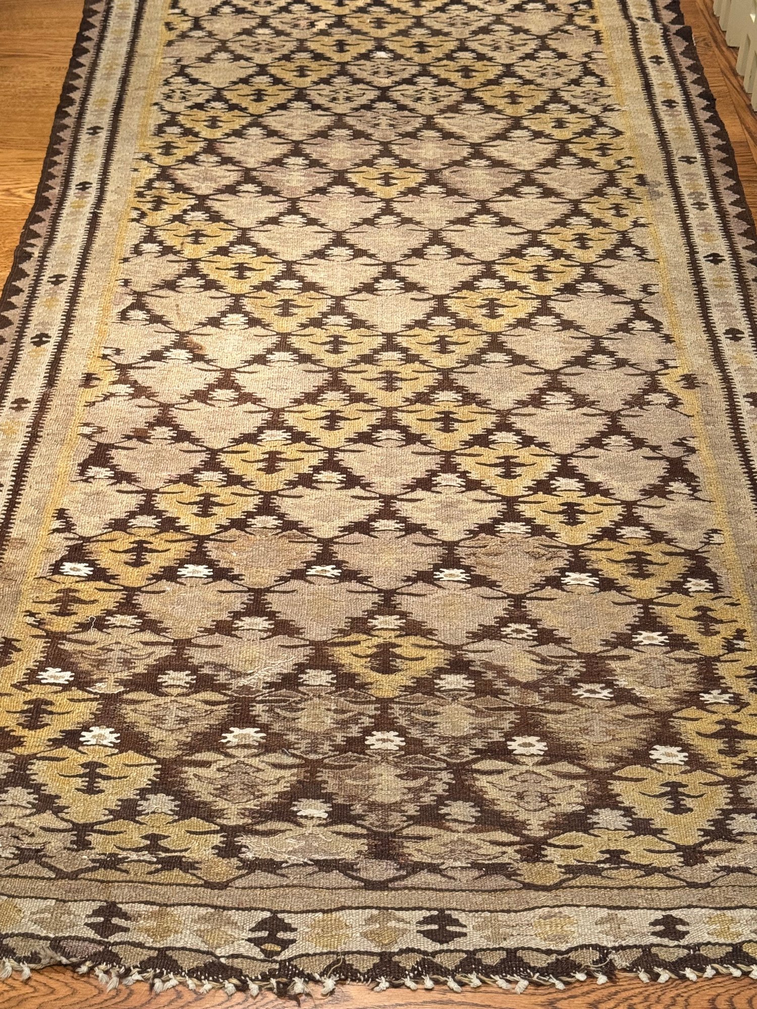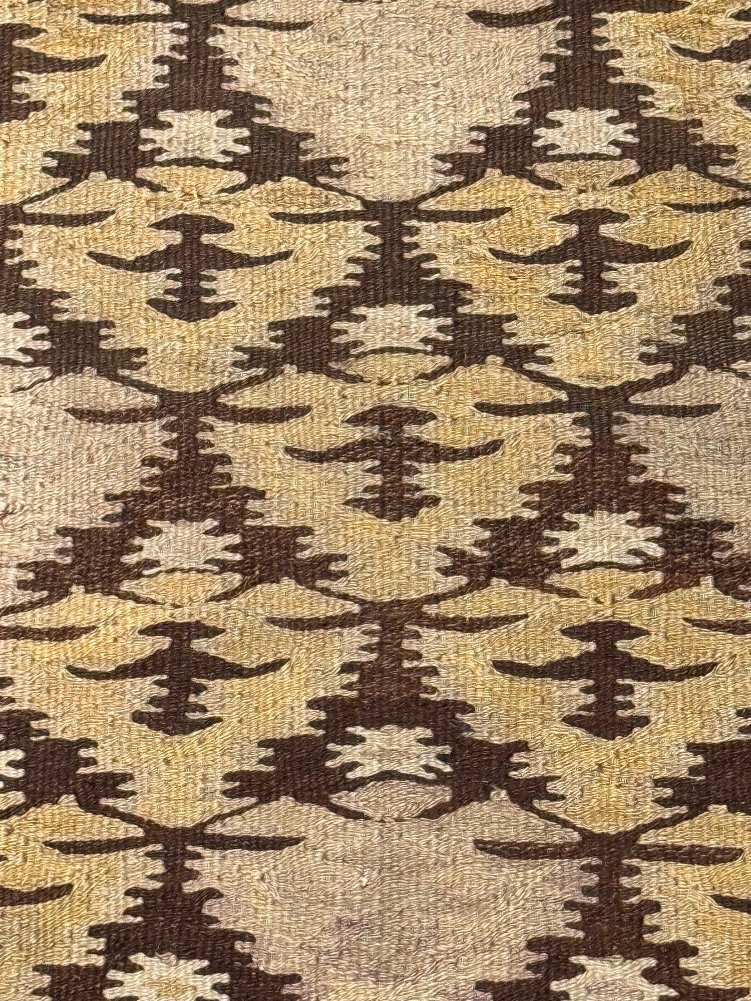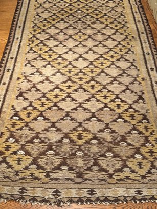 Beautifully patterned wool flat weave kilim carpet possibly from Zarand region of Iran. In neutral beige and brown tones with yellow highlights. In good condition. Size 8'4" x 43 W