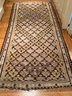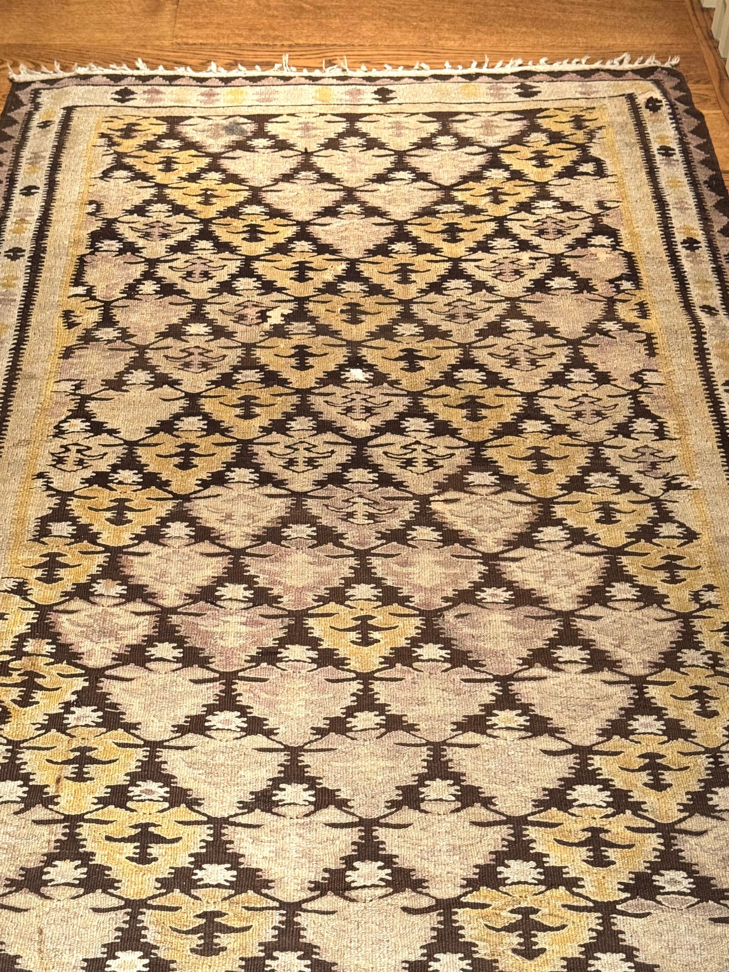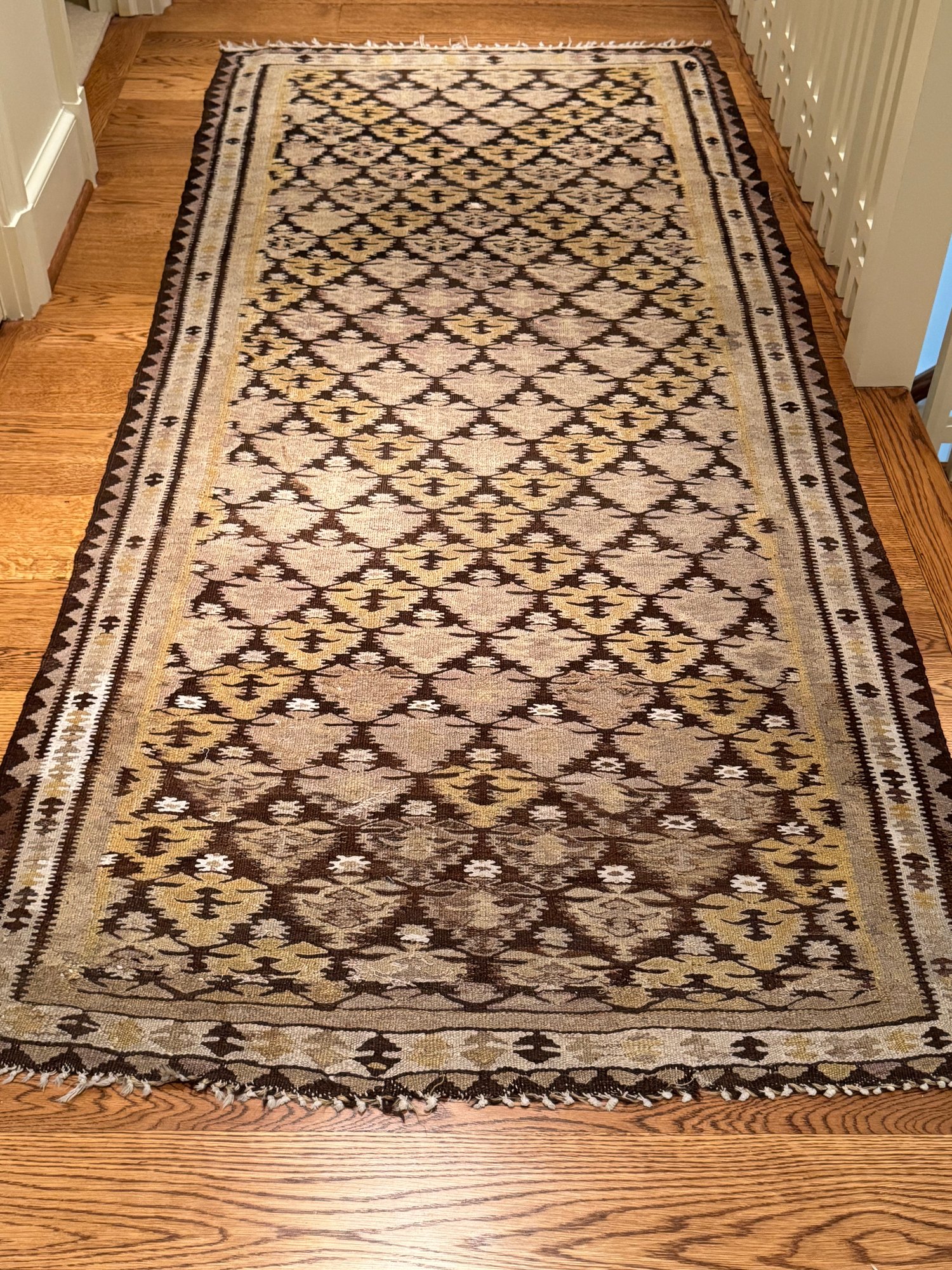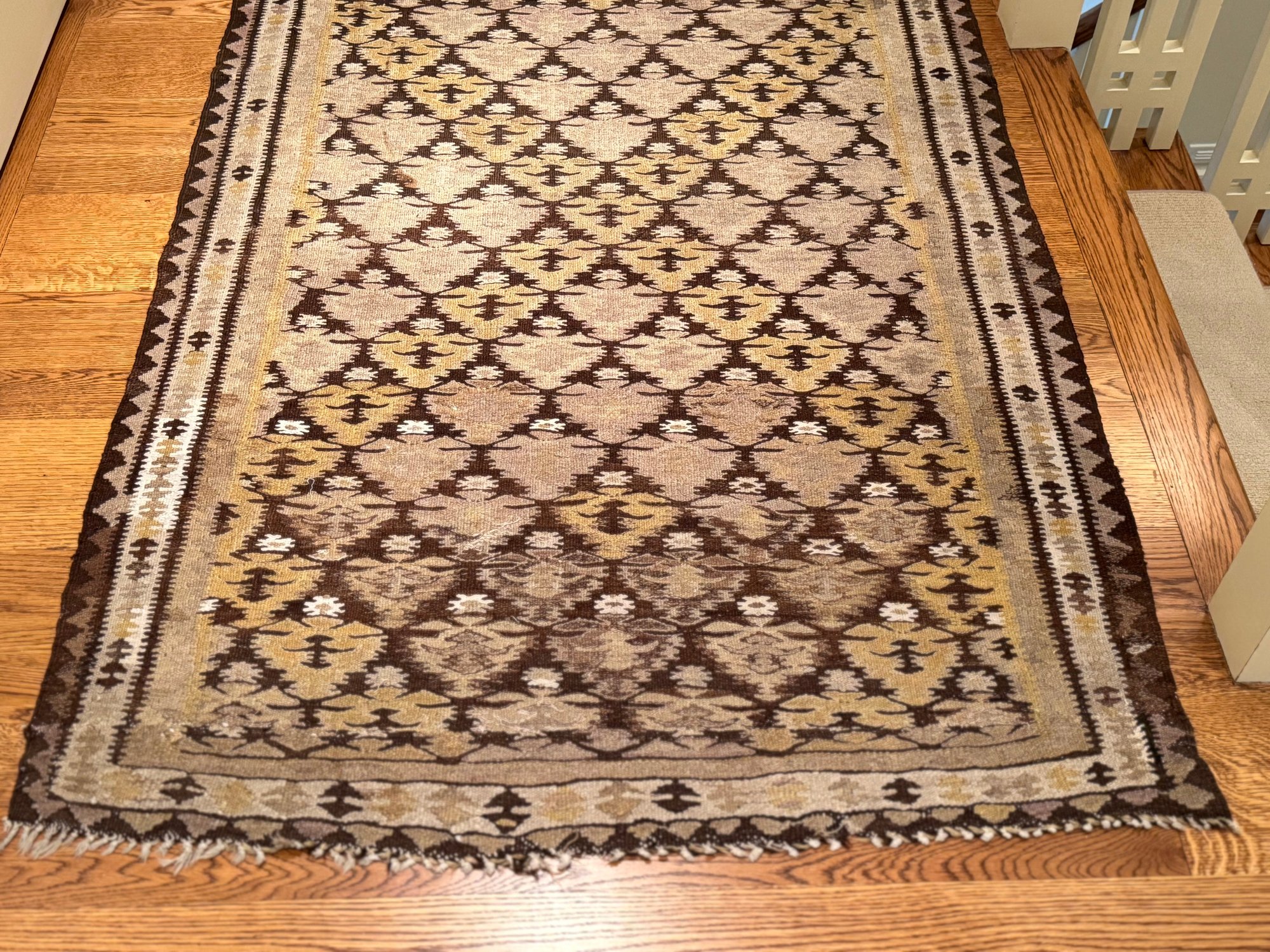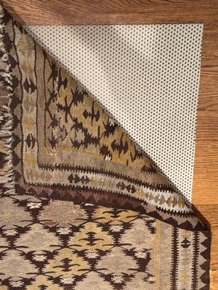Beautifully patterned wool flat weave kilim carpet possibly from Zarand region of Iran. In neutral beige and brown tones with yellow highlights. In good condition. Size 8'4" x 43 W