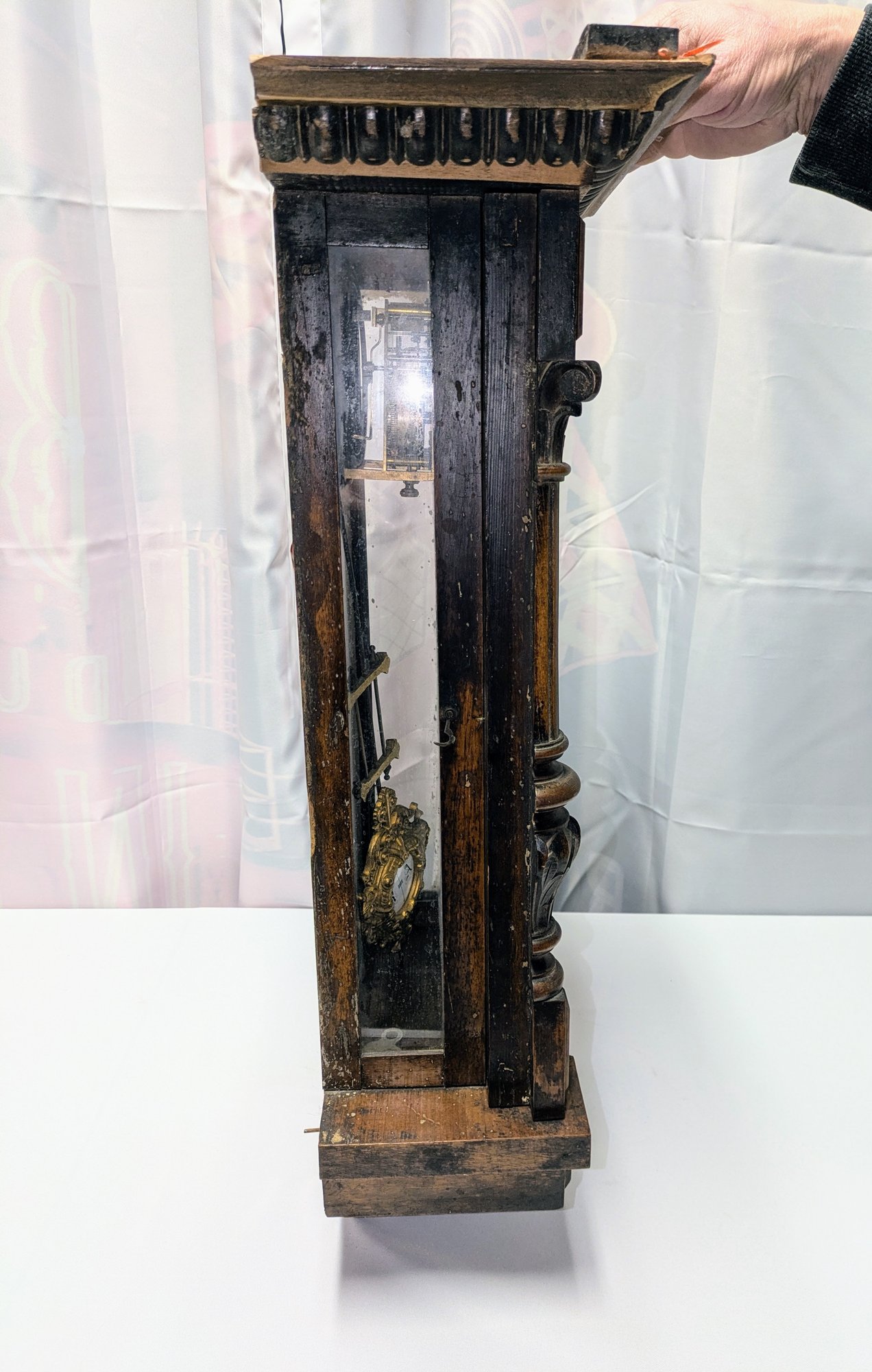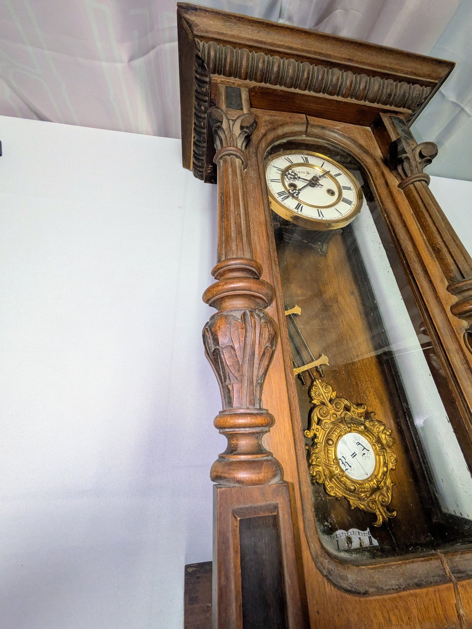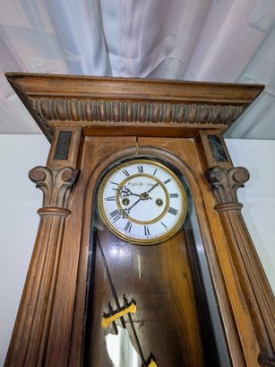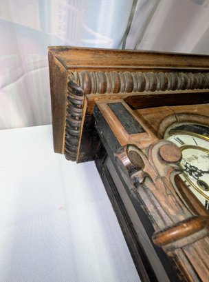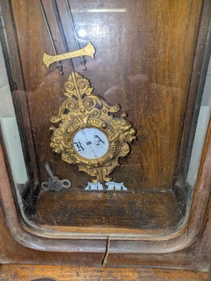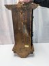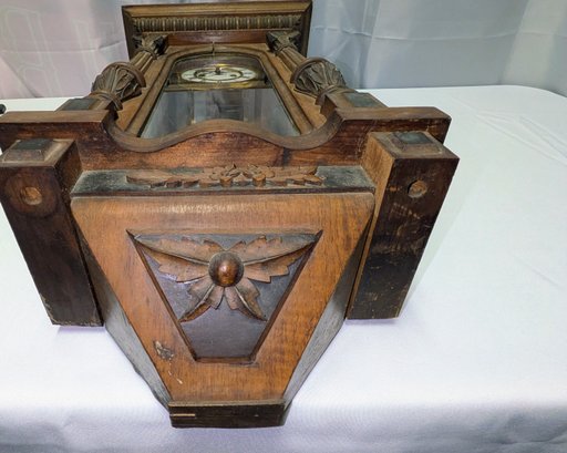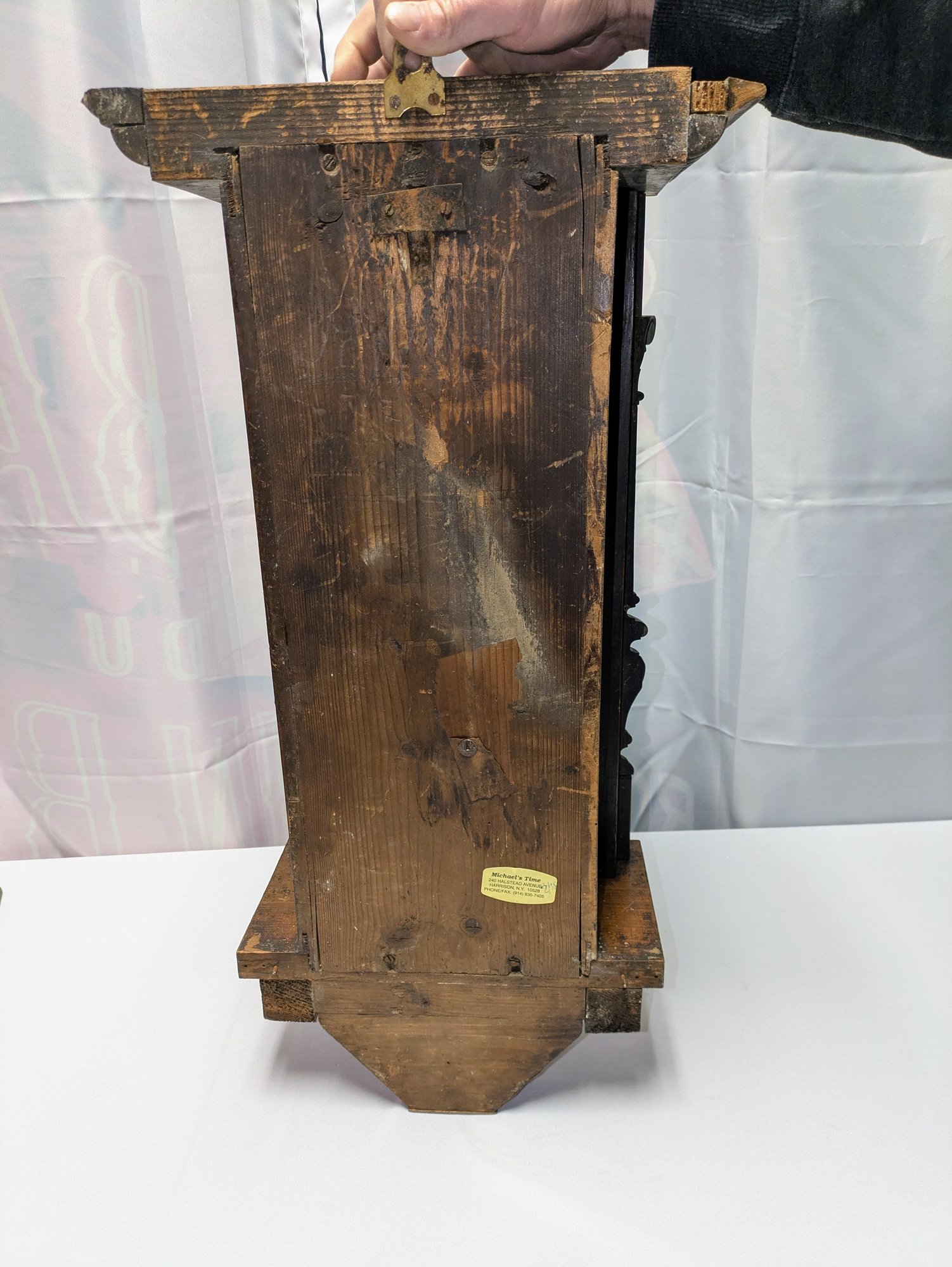 Stunning Hand Carved Ornate Accents with Beautiful Detailing and Design. There is wear to the name on the front of the clock face, and some light marks on the wood,d and a piece of wood is missing at the top, all consistent with age, use, and movement. The pedelum is not attached but included, and it is not currently working. Please see all photos as part of the description and condition. 28"H x 15"W x 8" D