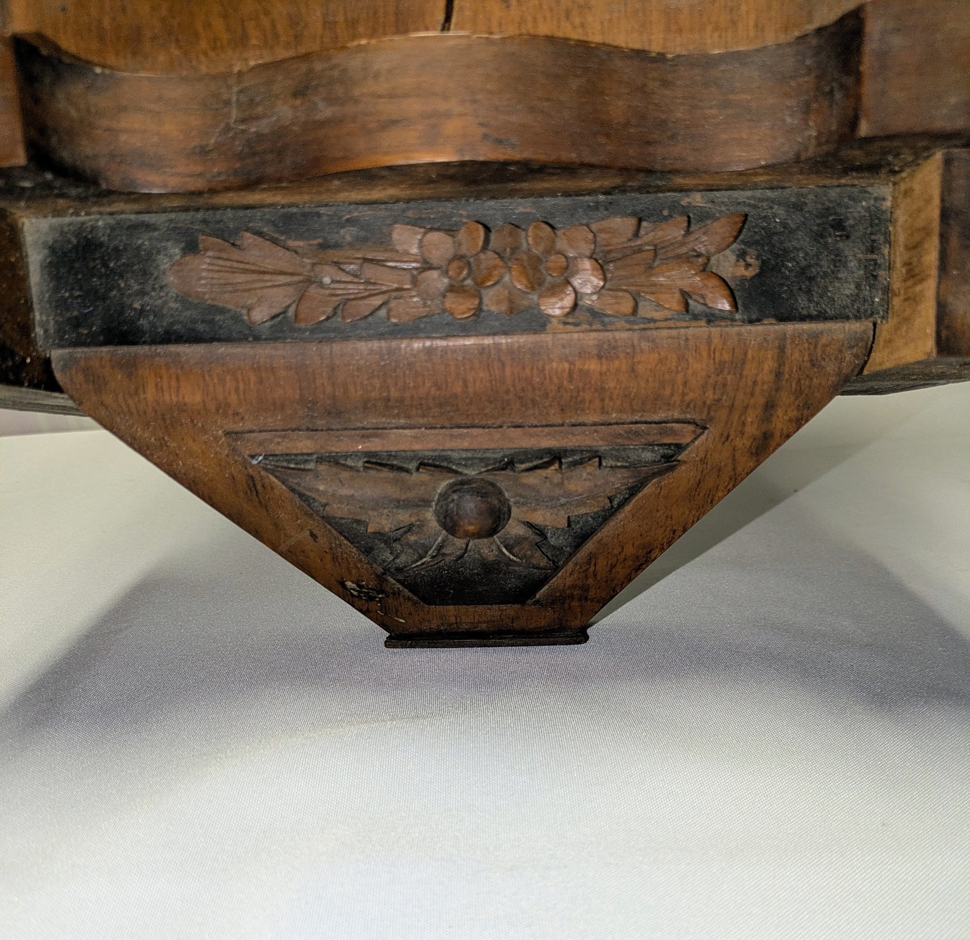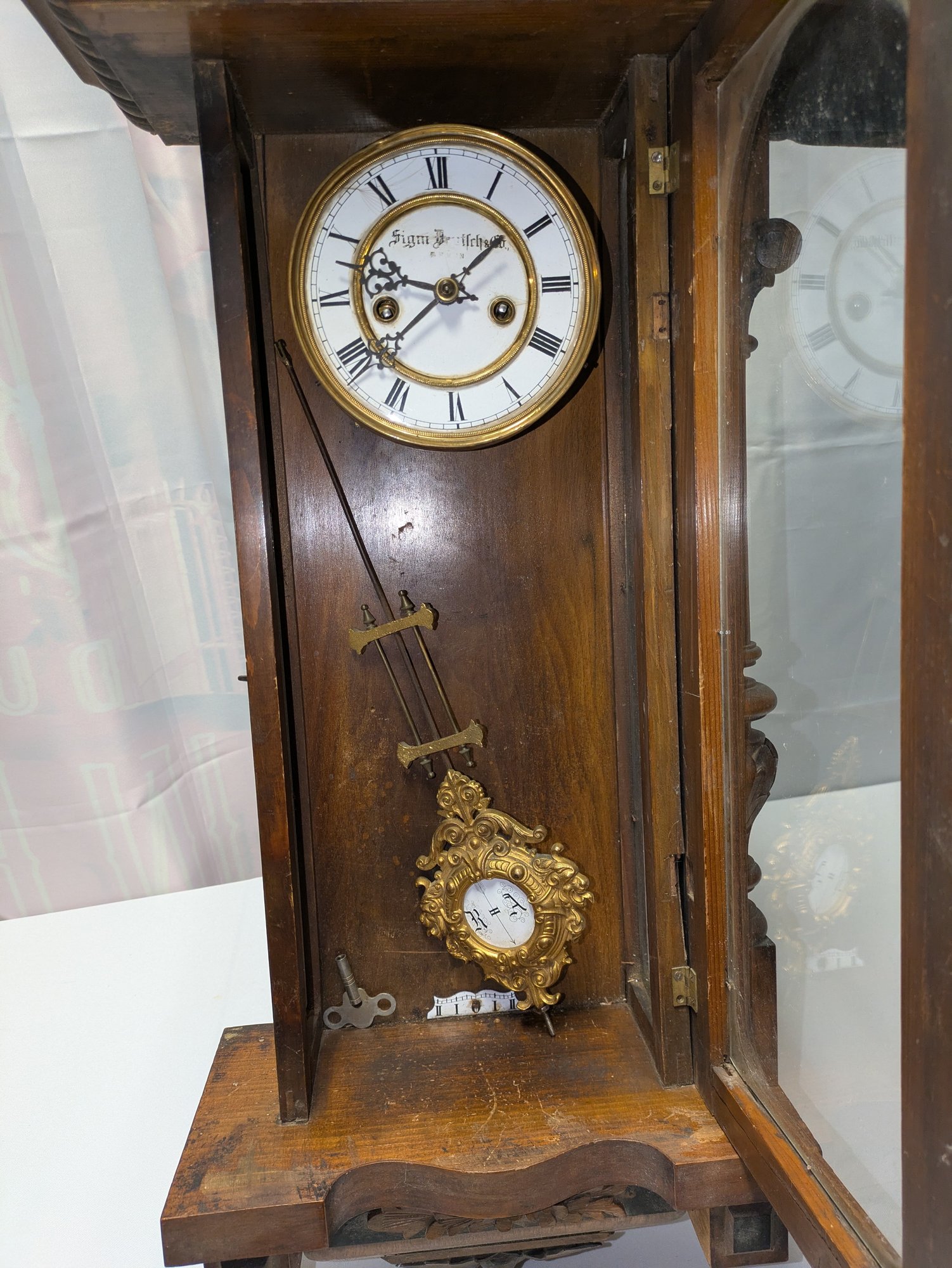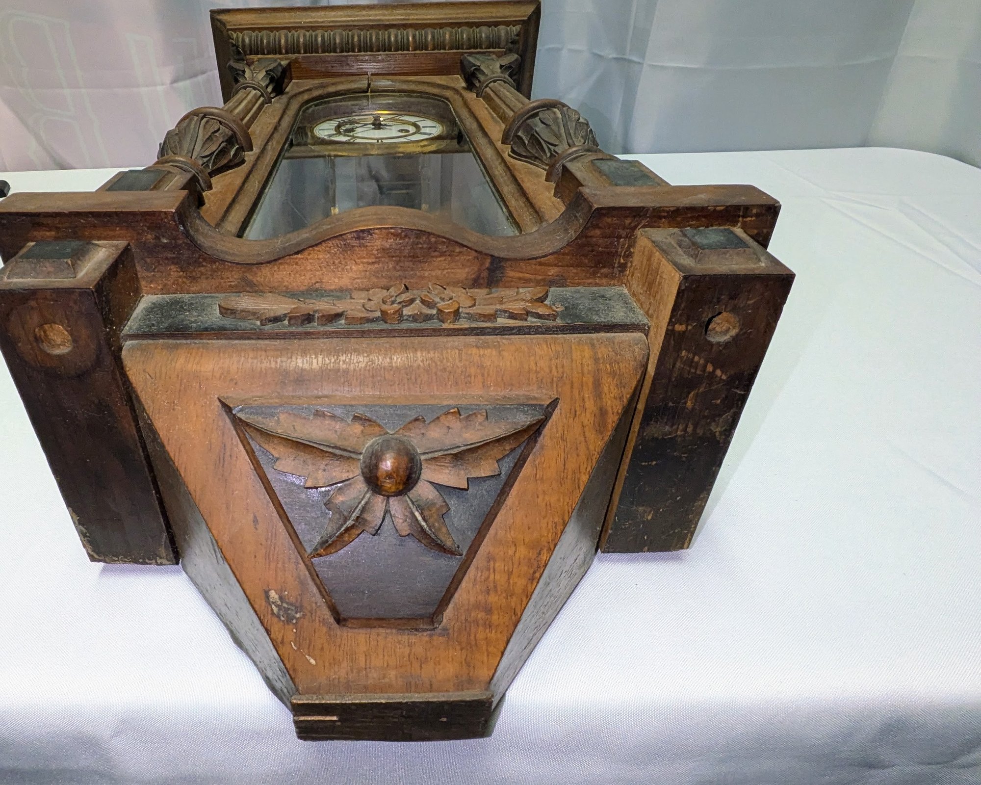 Stunning Hand Carved Ornate Accents with Beautiful Detailing and Design. There is wear to the name on the front of the clock face, and some light marks on the wood,d and a piece of wood is missing at the top, all consistent with age, use, and movement. The pedelum is not attached but included, and it is not currently working. Please see all photos as part of the description and condition. 28"H x 15"W x 8" D