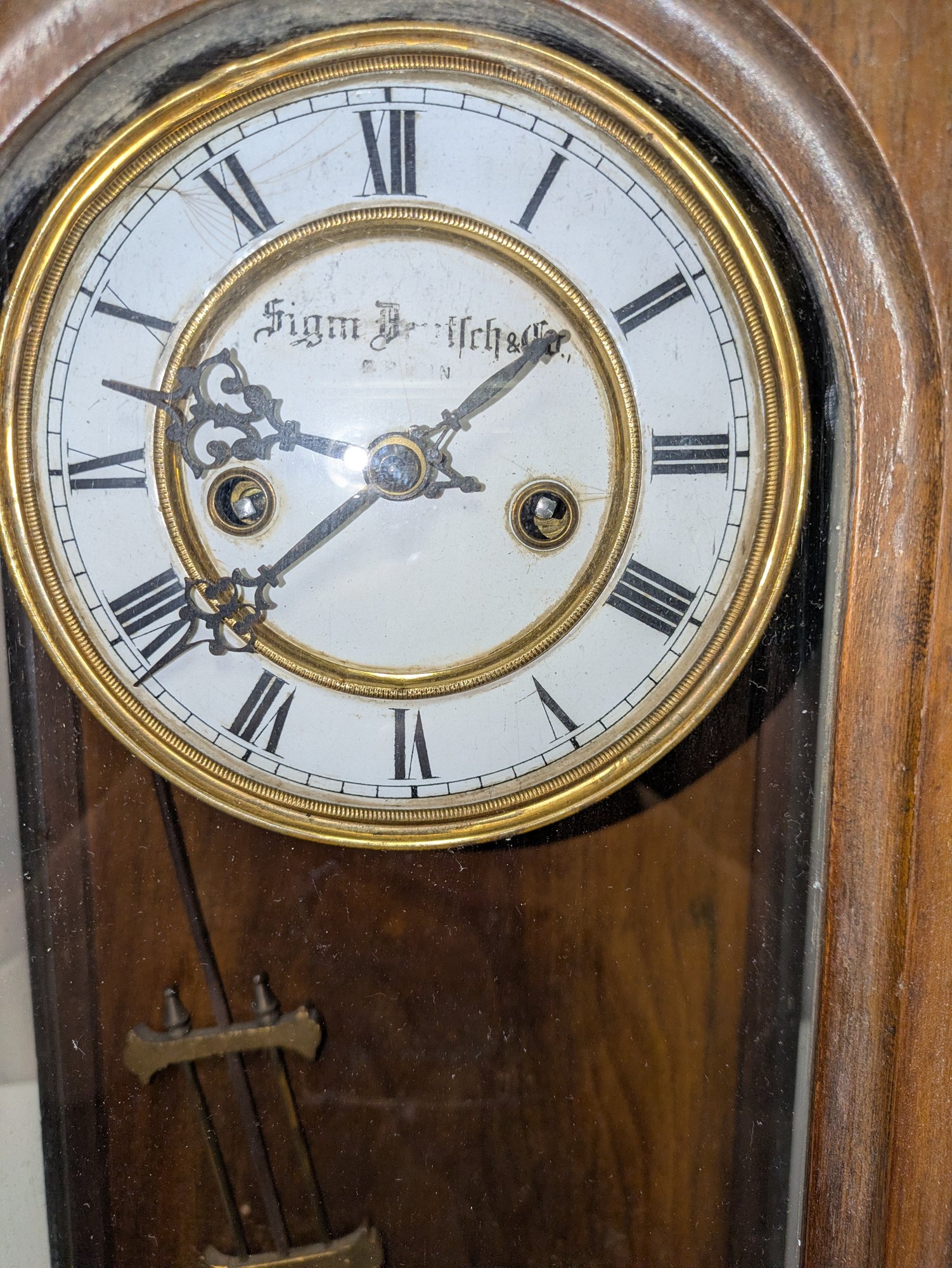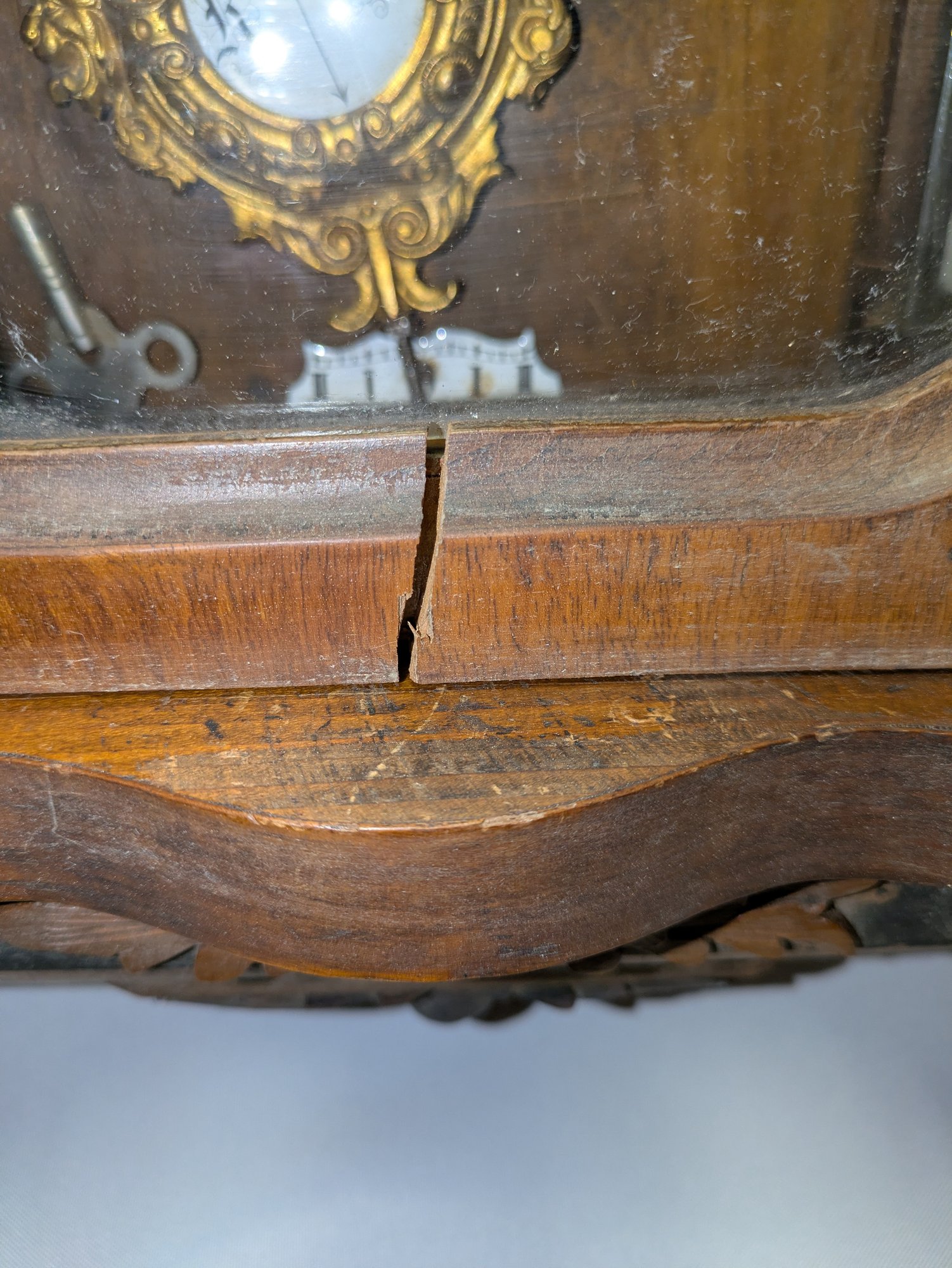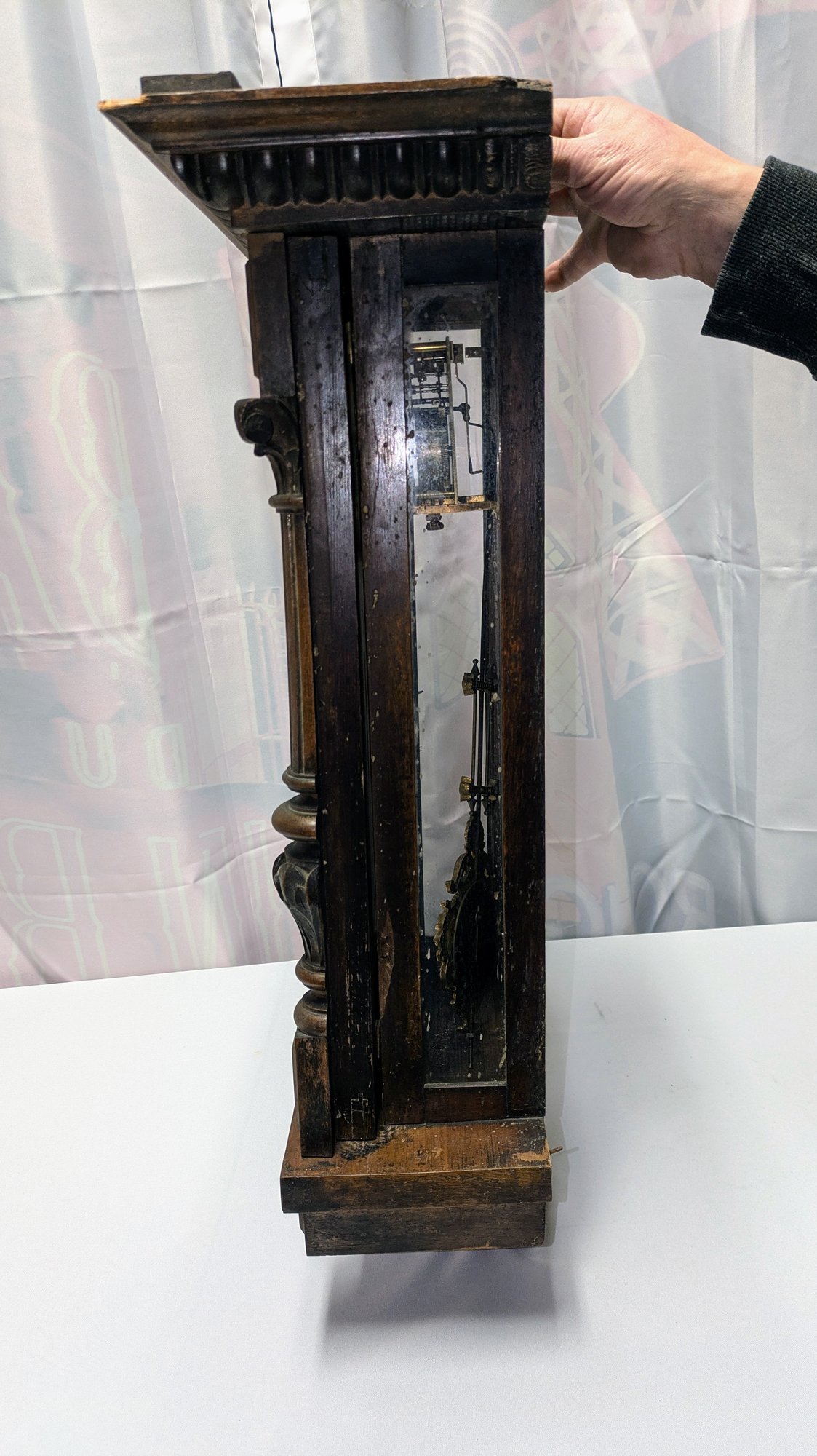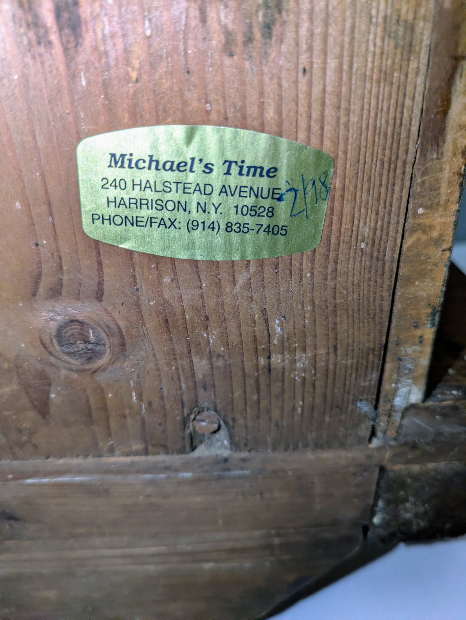 Stunning Hand Carved Ornate Accents with Beautiful Detailing and Design. There is wear to the name on the front of the clock face, and some light marks on the wood,d and a piece of wood is missing at the top, all consistent with age, use, and movement. The pedelum is not attached but included, and it is not currently working. Please see all photos as part of the description and condition. 28"H x 15"W x 8" D