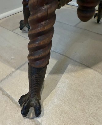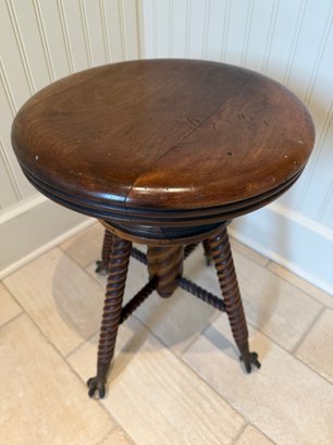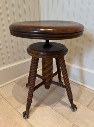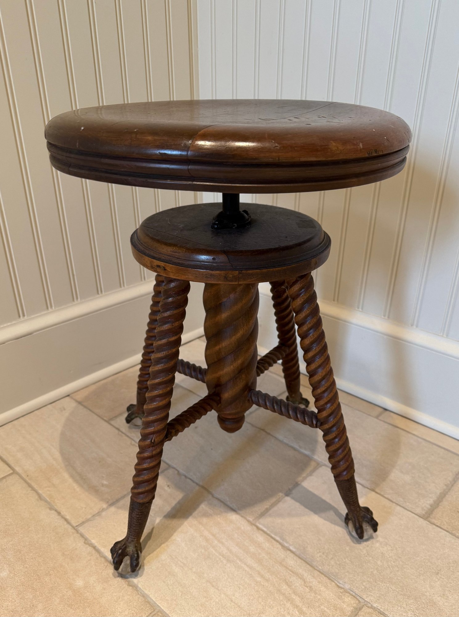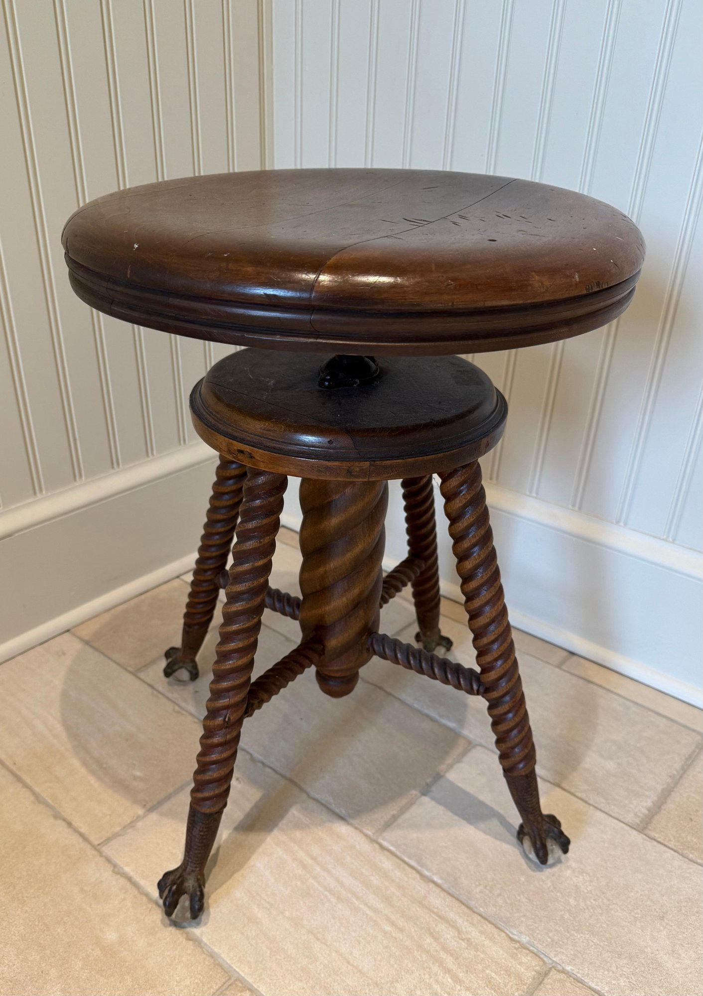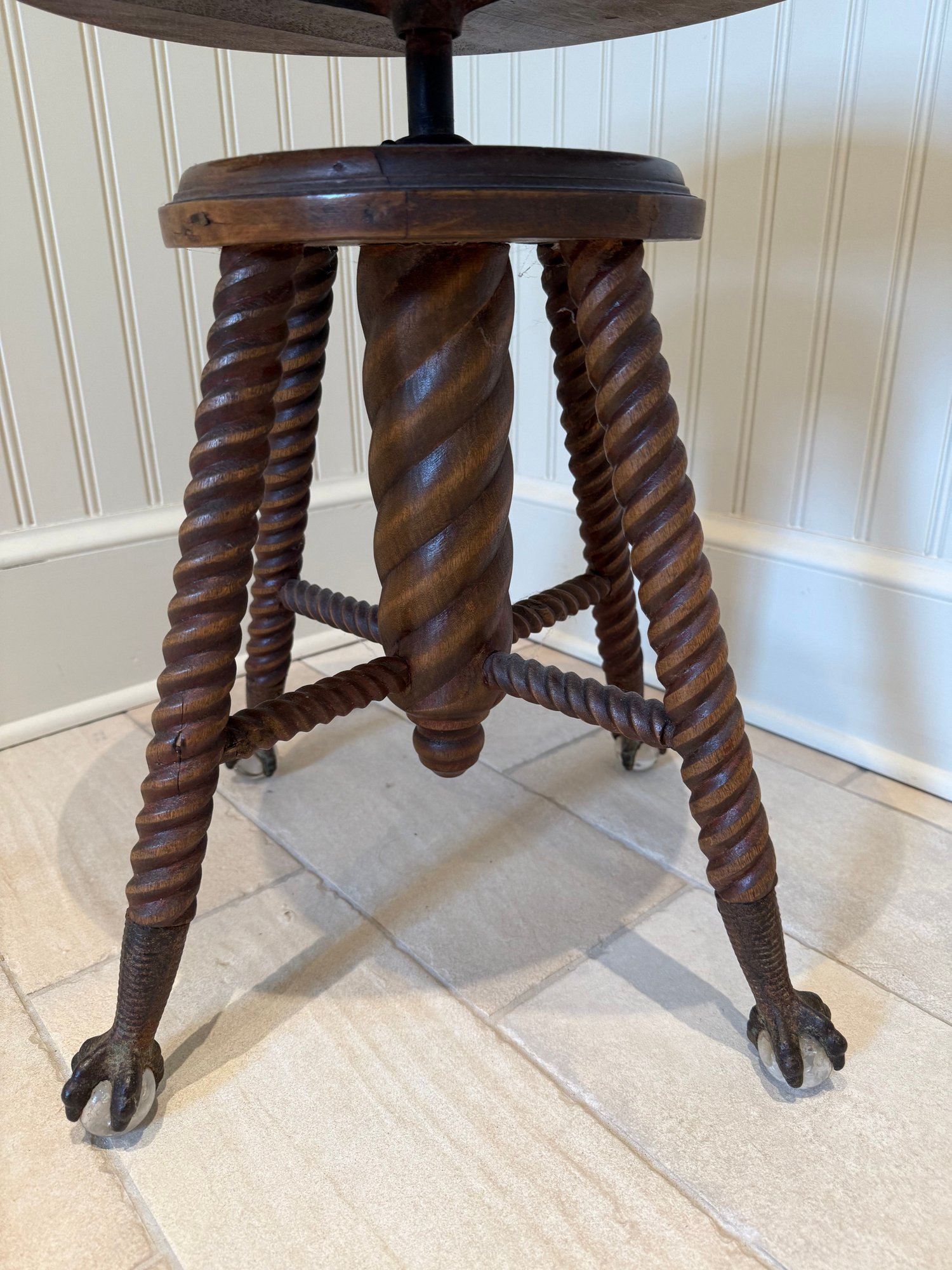 Adorable petite and sweet mahogany piano stool with barley twist legs on claw feet. Stamped in metal hardware on underside Chas Parker Co Meriden CT