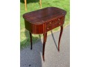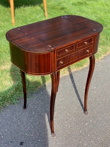 Antique Mahogany Sewing Cabinet with side storage accessed by flip top lids on either side and two smaller drawers with dividers above and a larger drawer below. The drawer bottoms are Birdseye Maple and the drawer boxes are constructed with dovetail joinery. The cabinet is adorned by maple inlay throughout and supported by curved legs with carved feet. The veneer on the top shows age with some checking. 29h x 27w x 16d