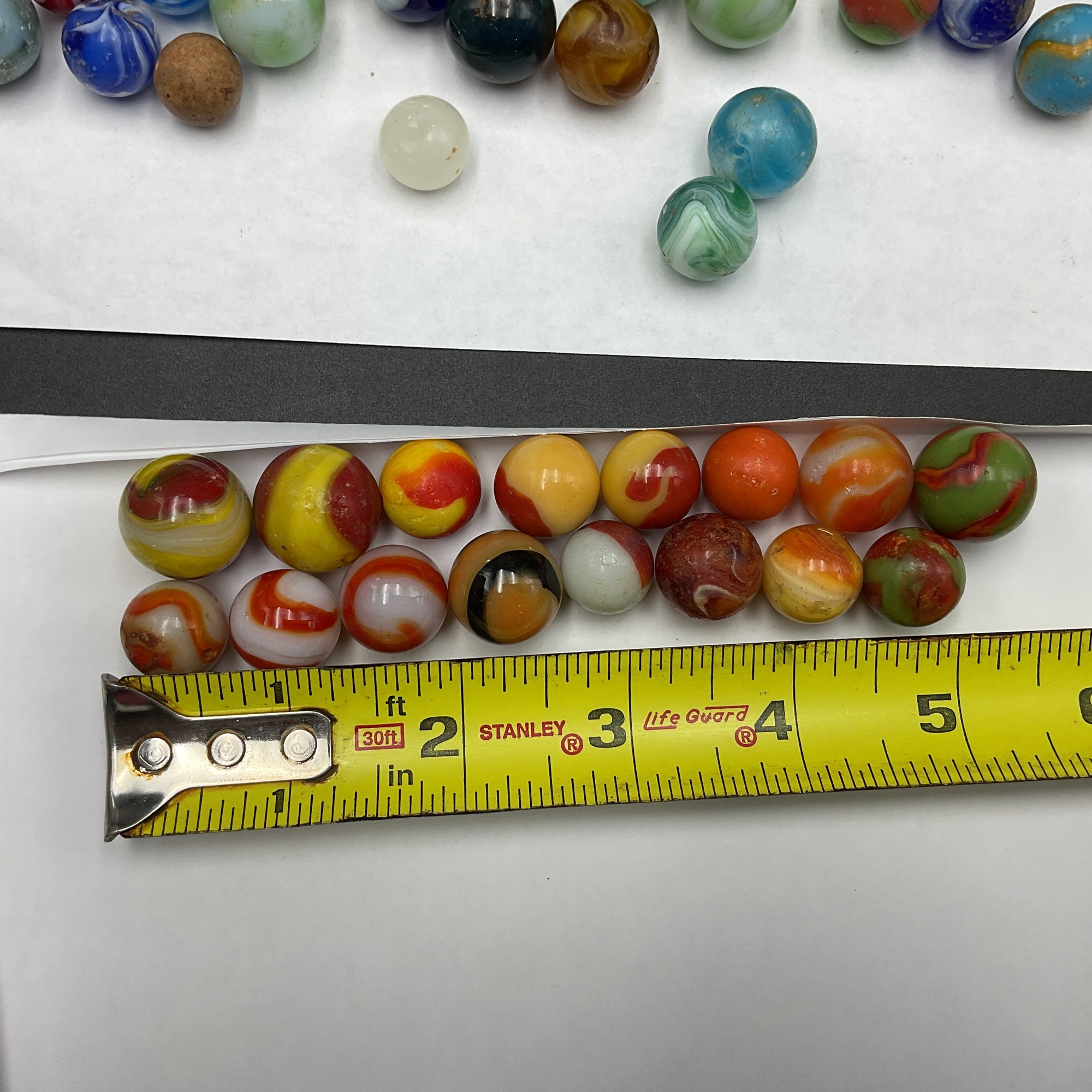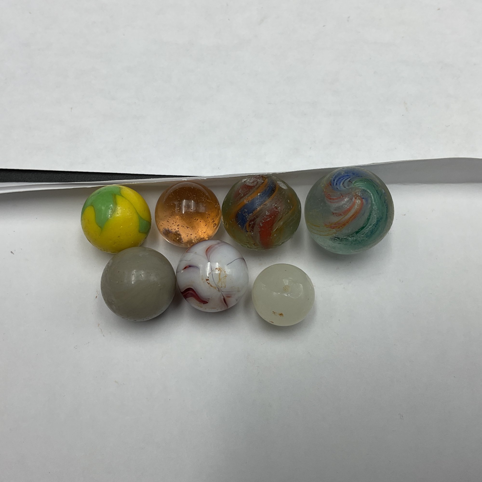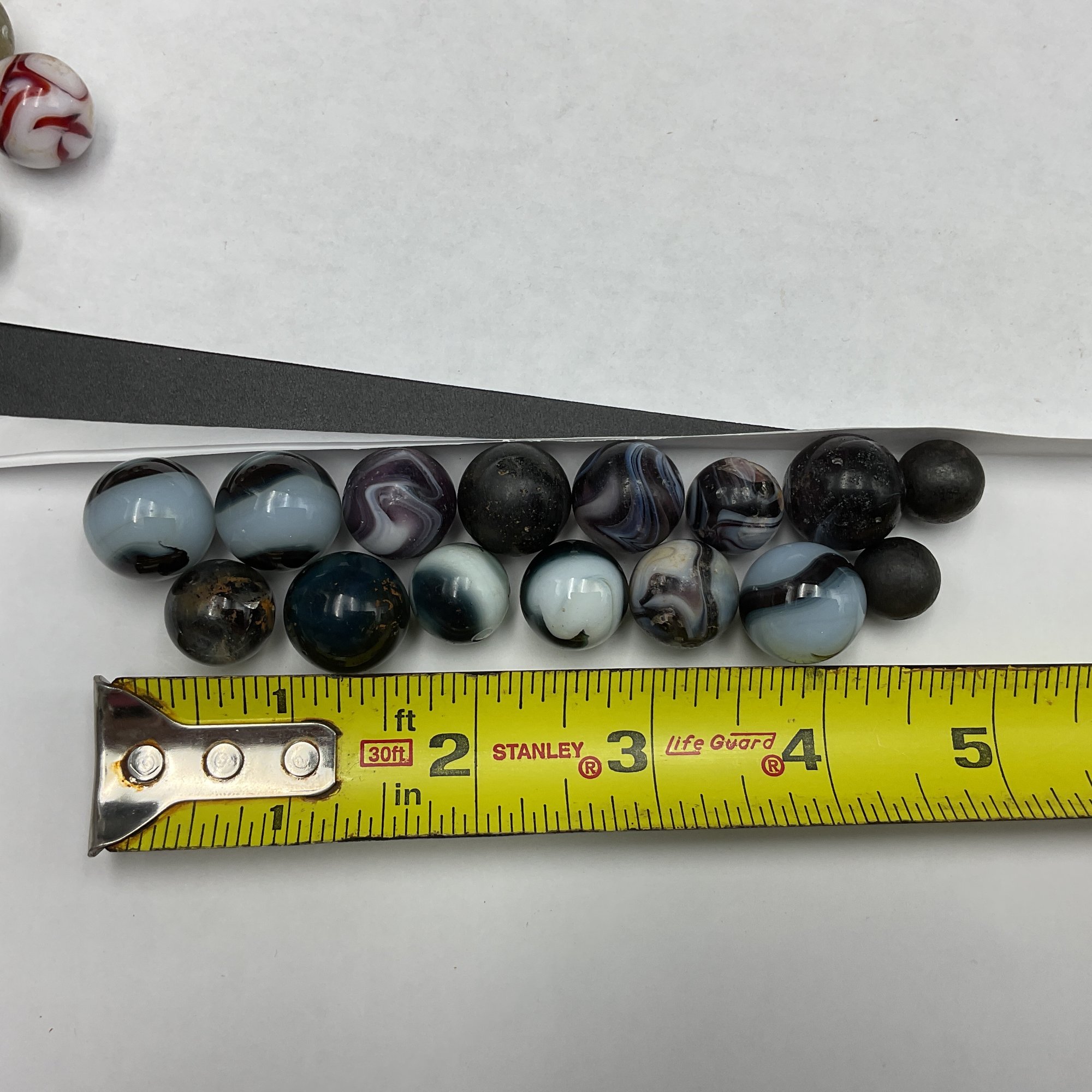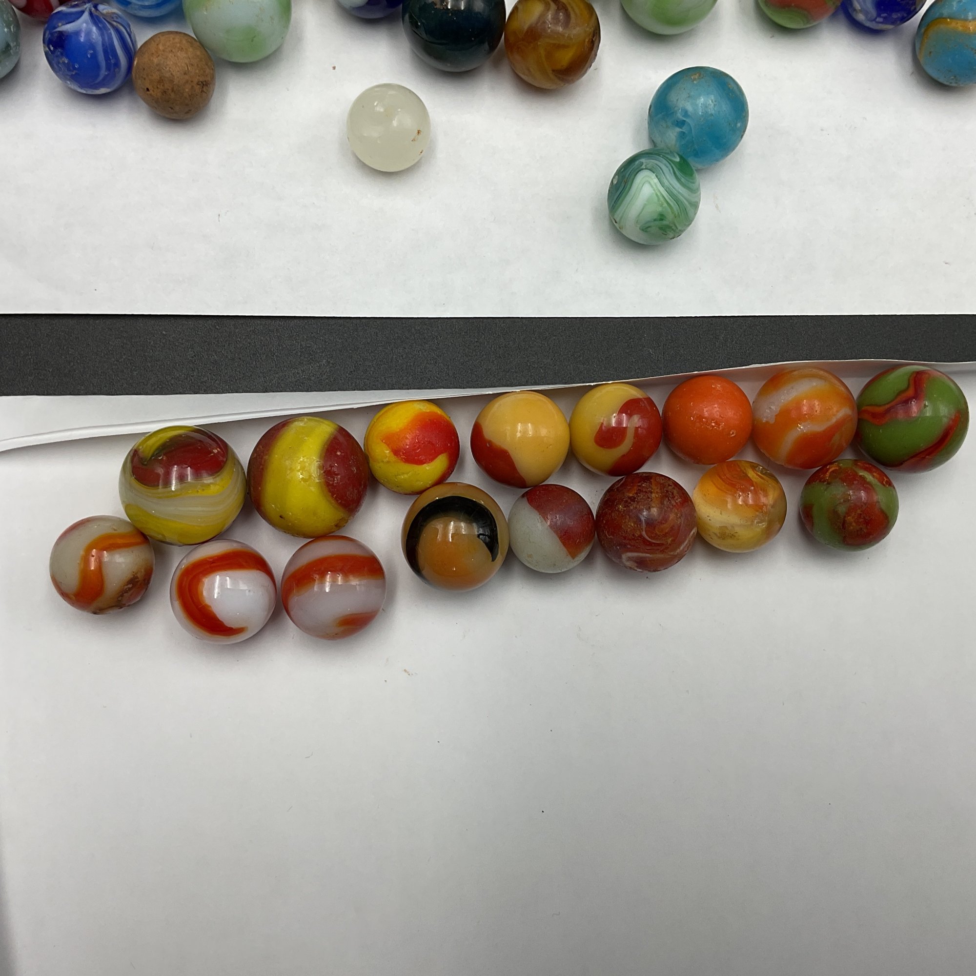 Large lot of various antique marbles believed to be from the 1930's. Includes 6 Steelies, antique clay marbles including possible Bennington boulder marble, and various other marbles in every colorway. Condition varies, these were well used and many have chips or other damage. Please see photos as these are the best indication of style and condition.