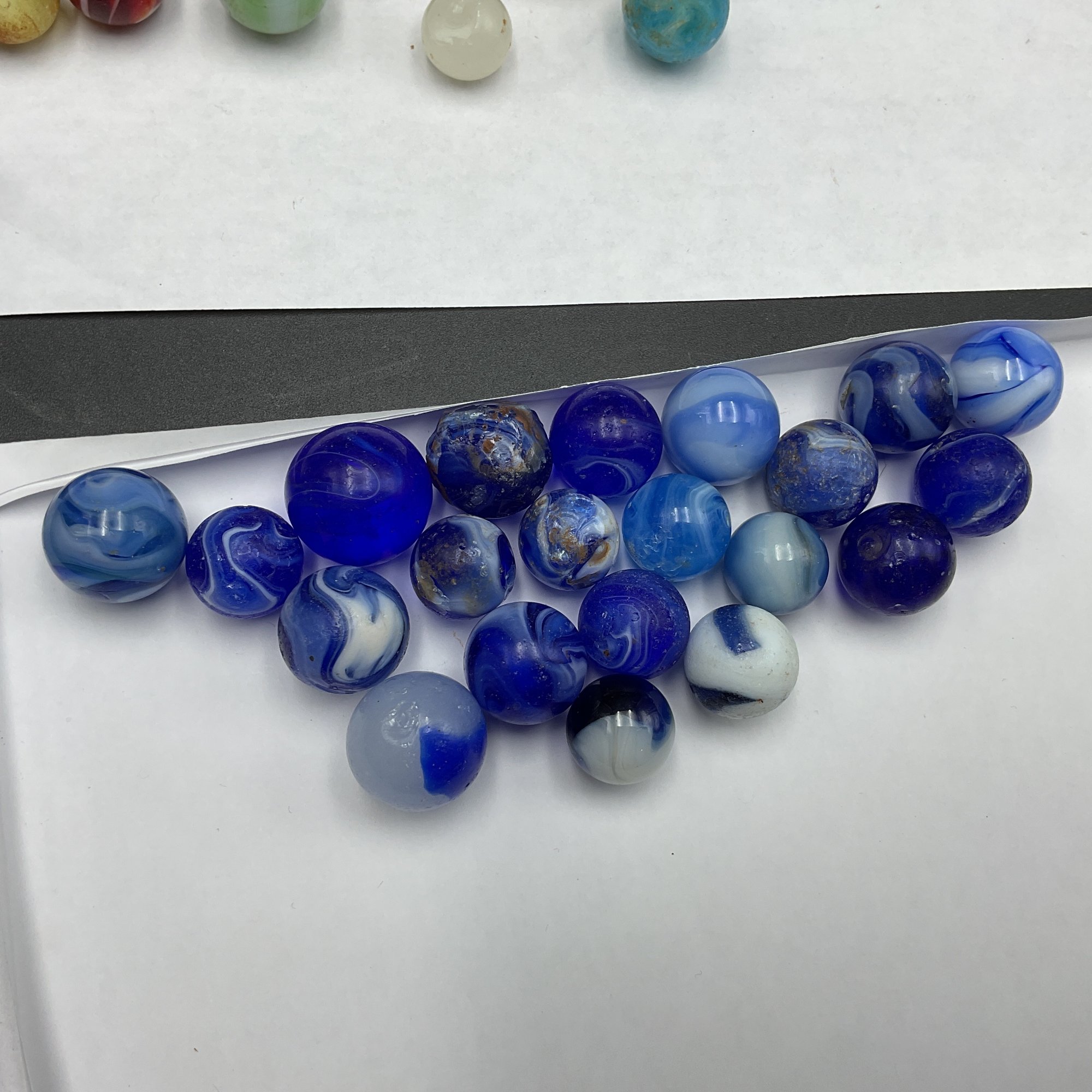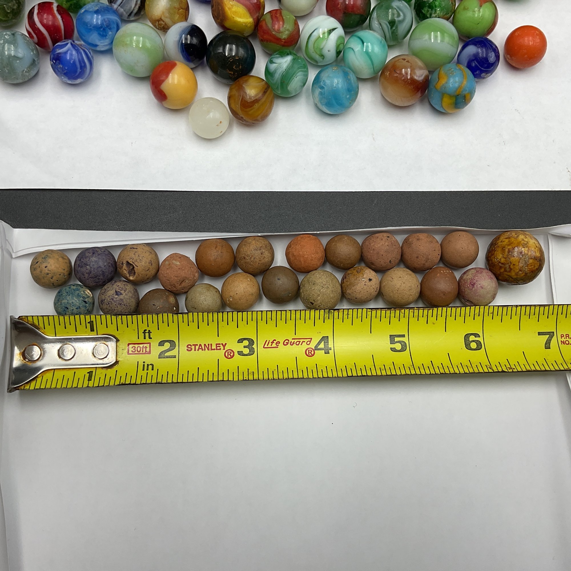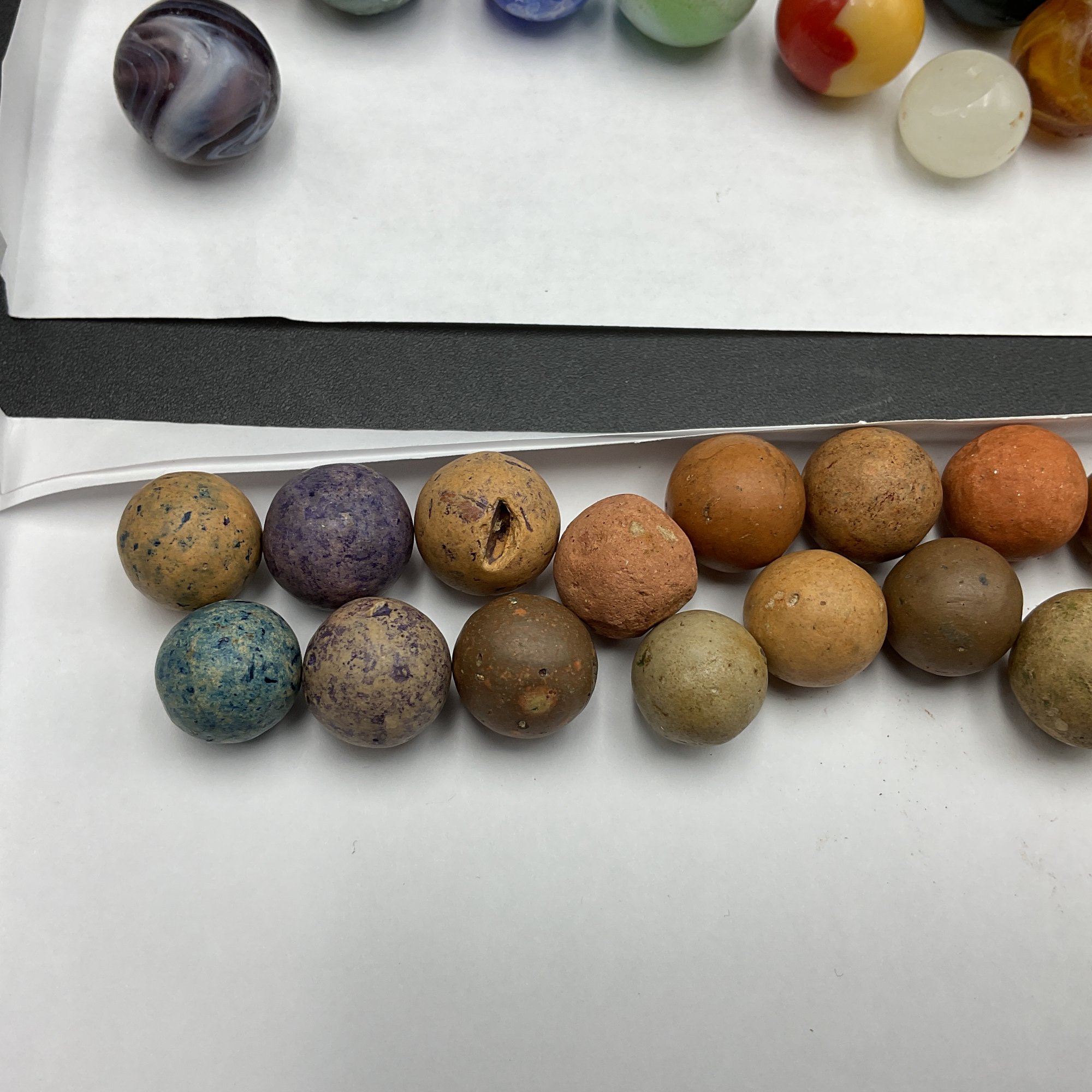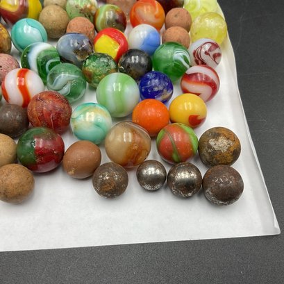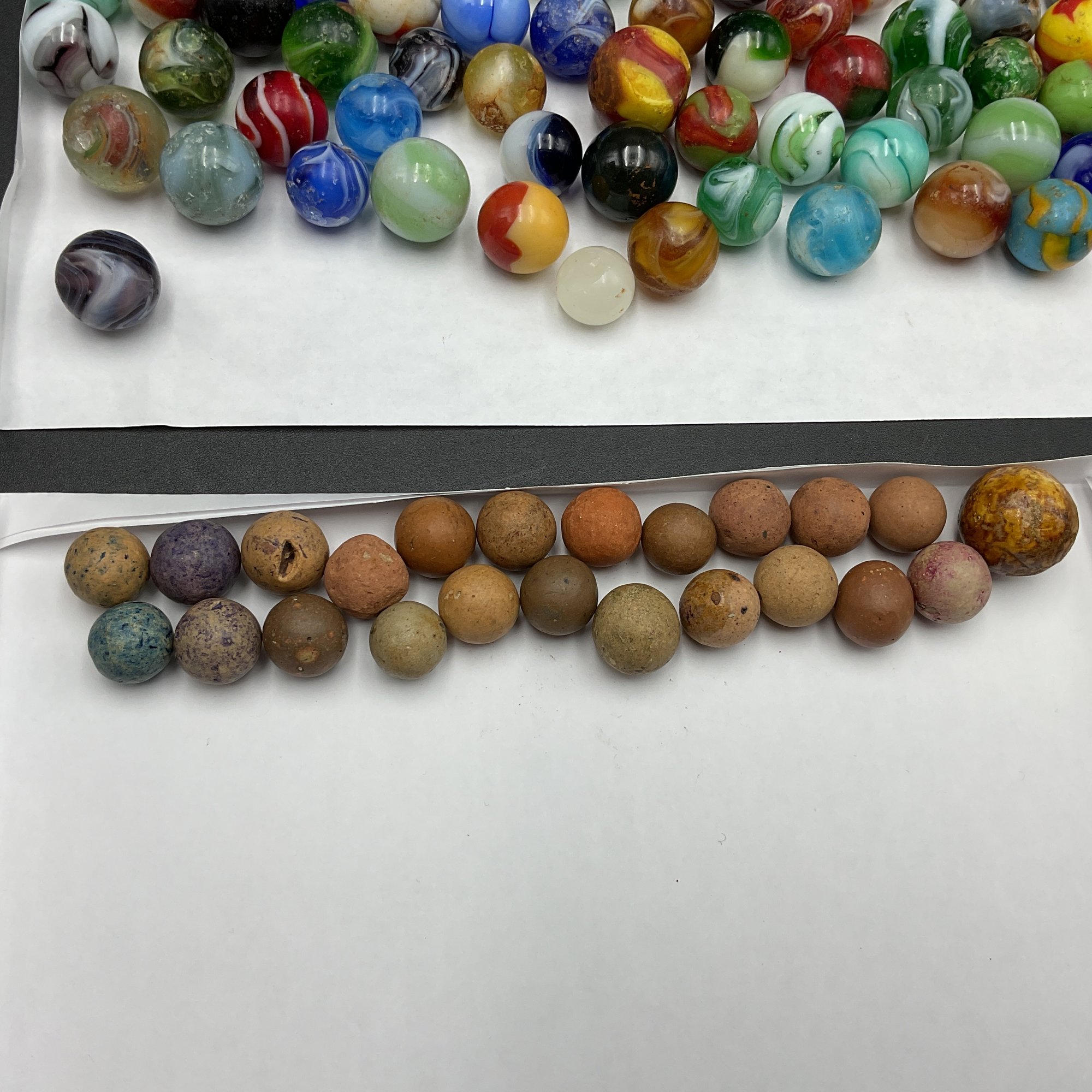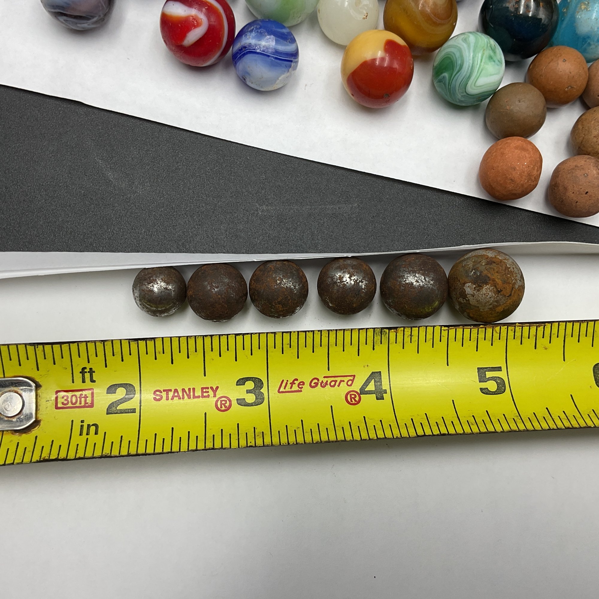 Large lot of various antique marbles believed to be from the 1930's. Includes 6 Steelies, antique clay marbles including possible Bennington boulder marble, and various other marbles in every colorway. Condition varies, these were well used and many have chips or other damage. Please see photos as these are the best indication of style and condition.