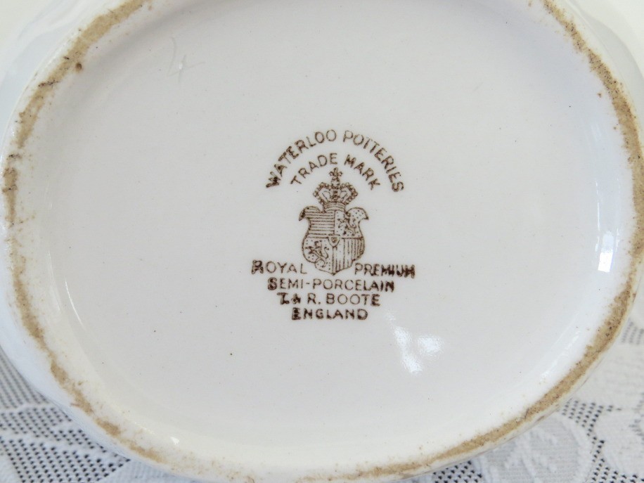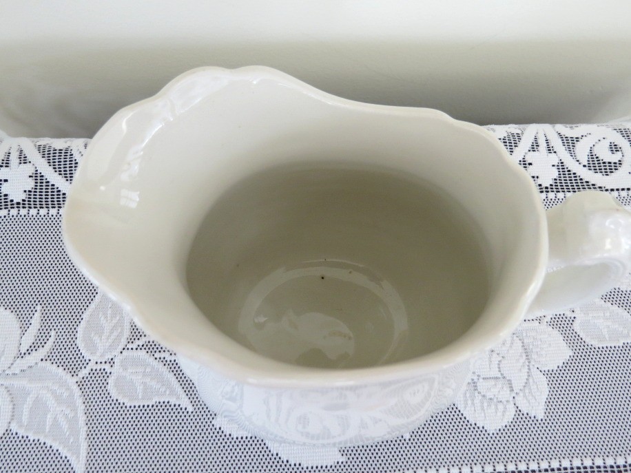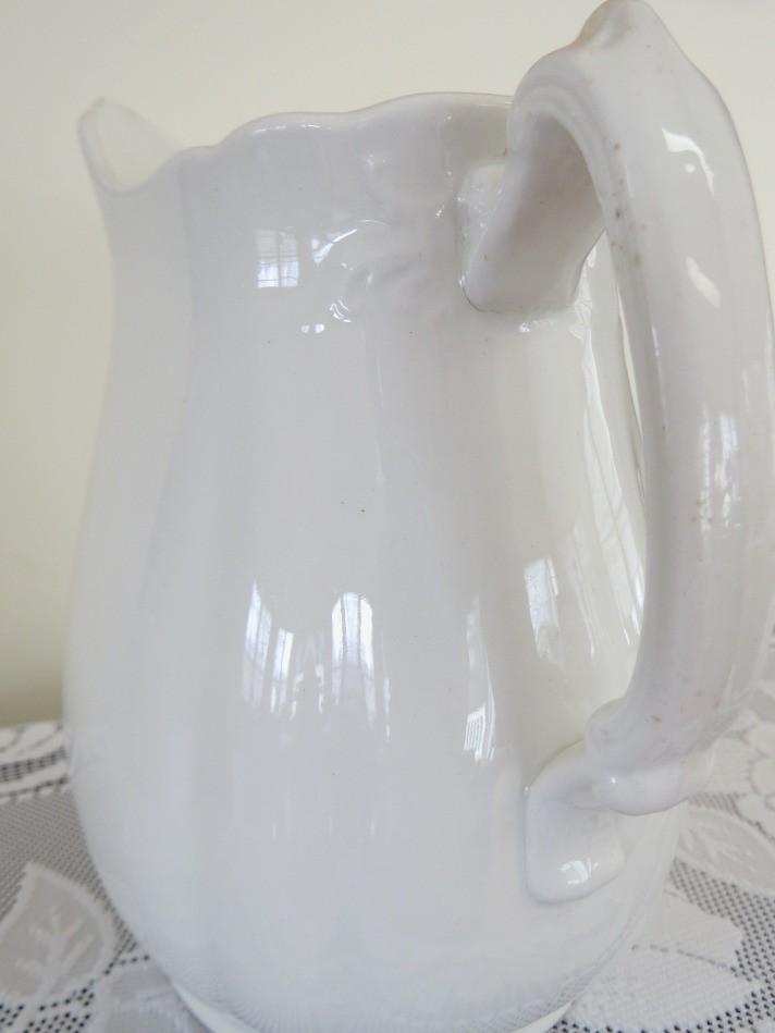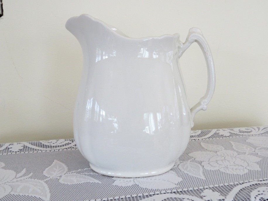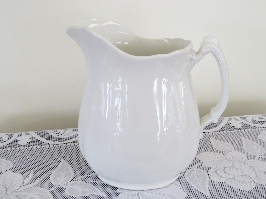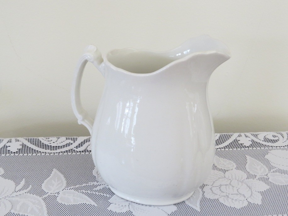 A beautifully styled vintage (1842-1906) semi-porcelain milk pitcher by T. & R. Boote, Waterloo Potteries, England. Pitcher stands 7" tall and holds approximately 42 oz of liquid. Large pouring spout, scroll design on handle area, and creamy white color allow this piece to fit with any decor. Appears to have no chips, cracks, repairs or stains. Marked on the bottom.
