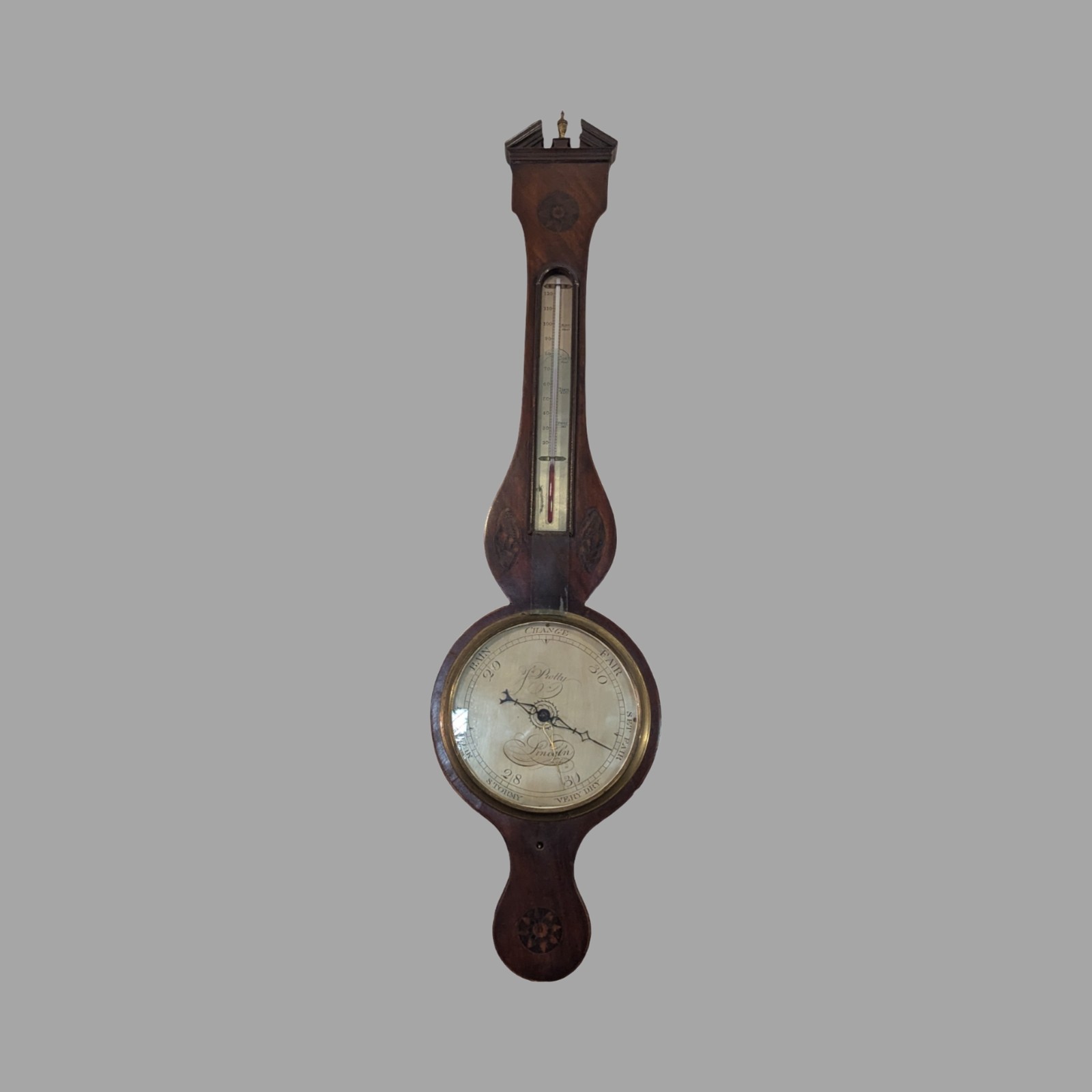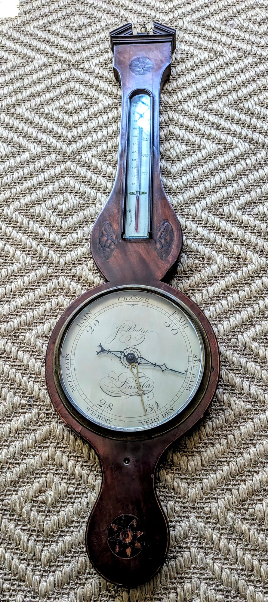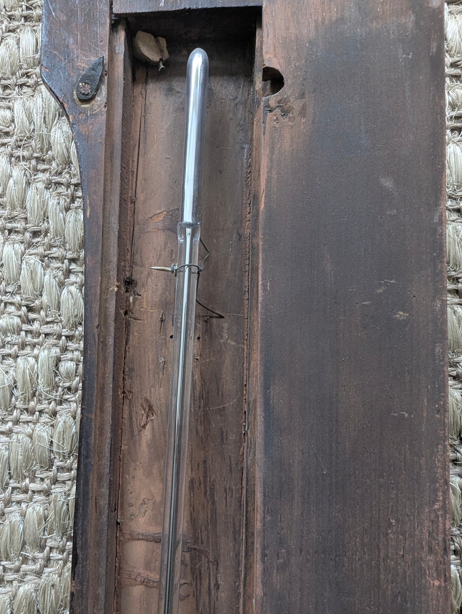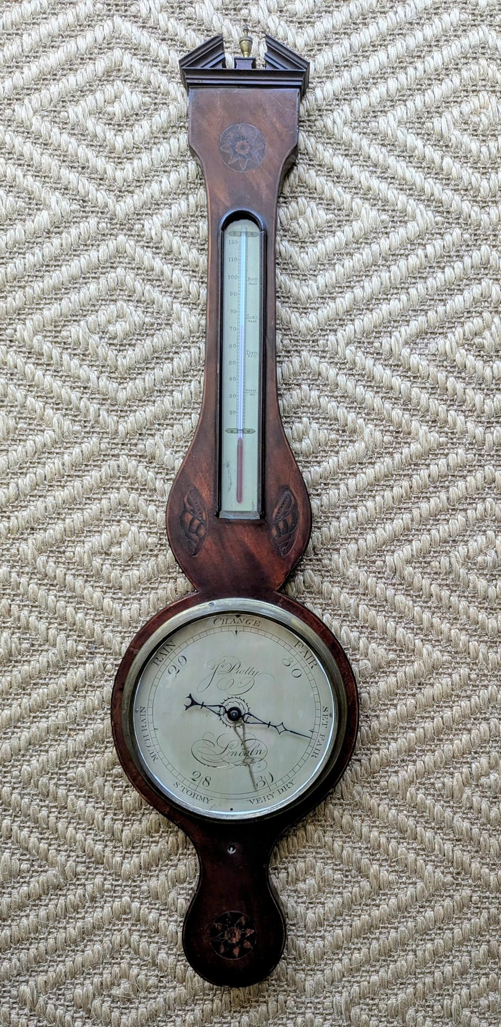 antique banjo barometer, a type of wheel barometer popular in the 18th and 19th centuries that uses a mercury-filled tube to measure atmospheric pressure