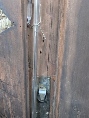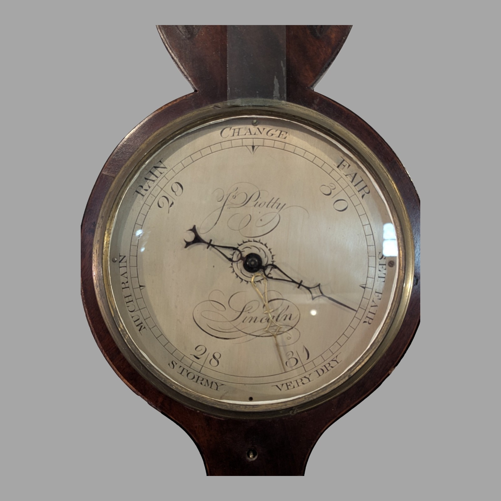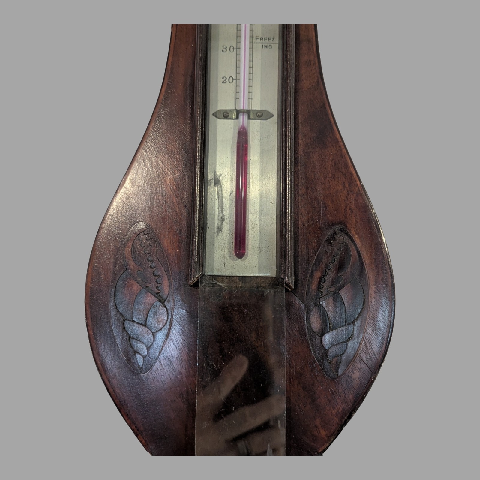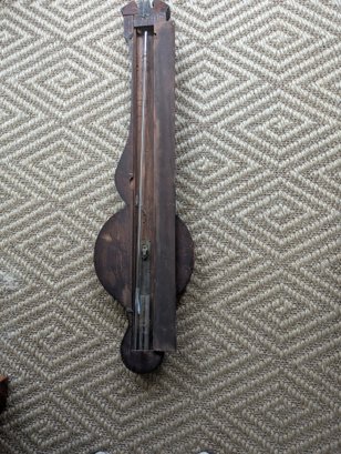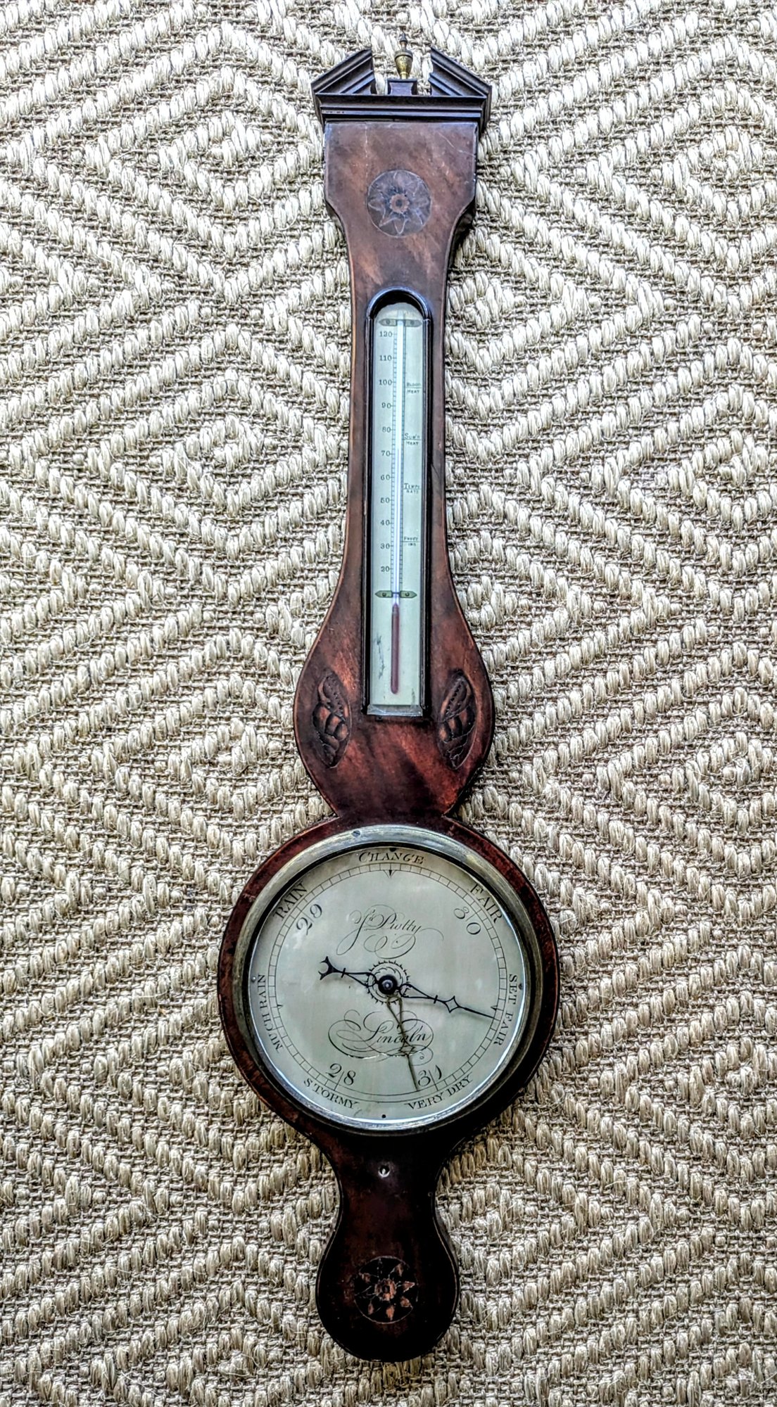 antique banjo barometer, a type of wheel barometer popular in the 18th and 19th centuries that uses a mercury-filled tube to measure atmospheric pressure