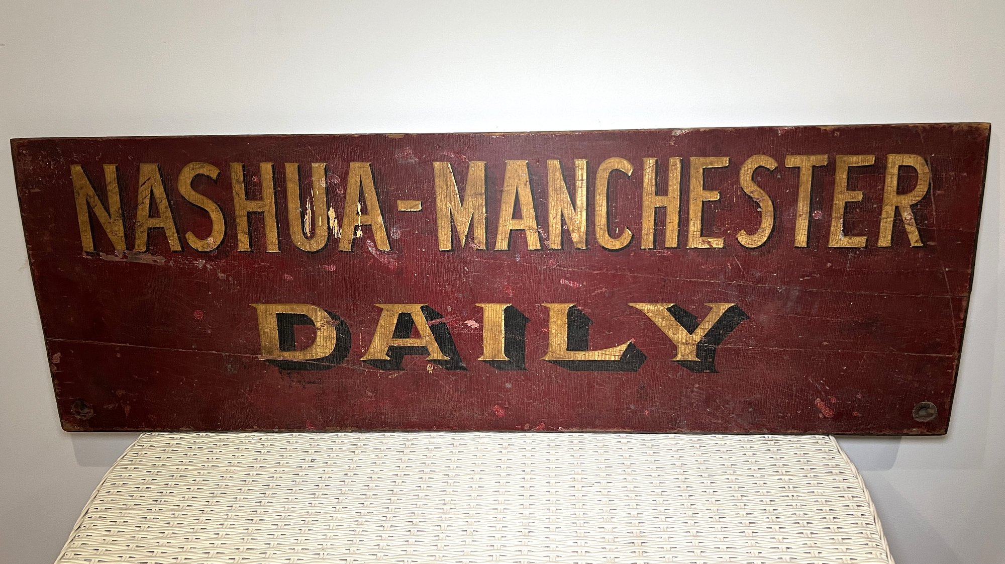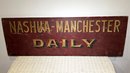Antique hand-painted sign in red and gold for the Nashua-Manchester Daily newspaper.