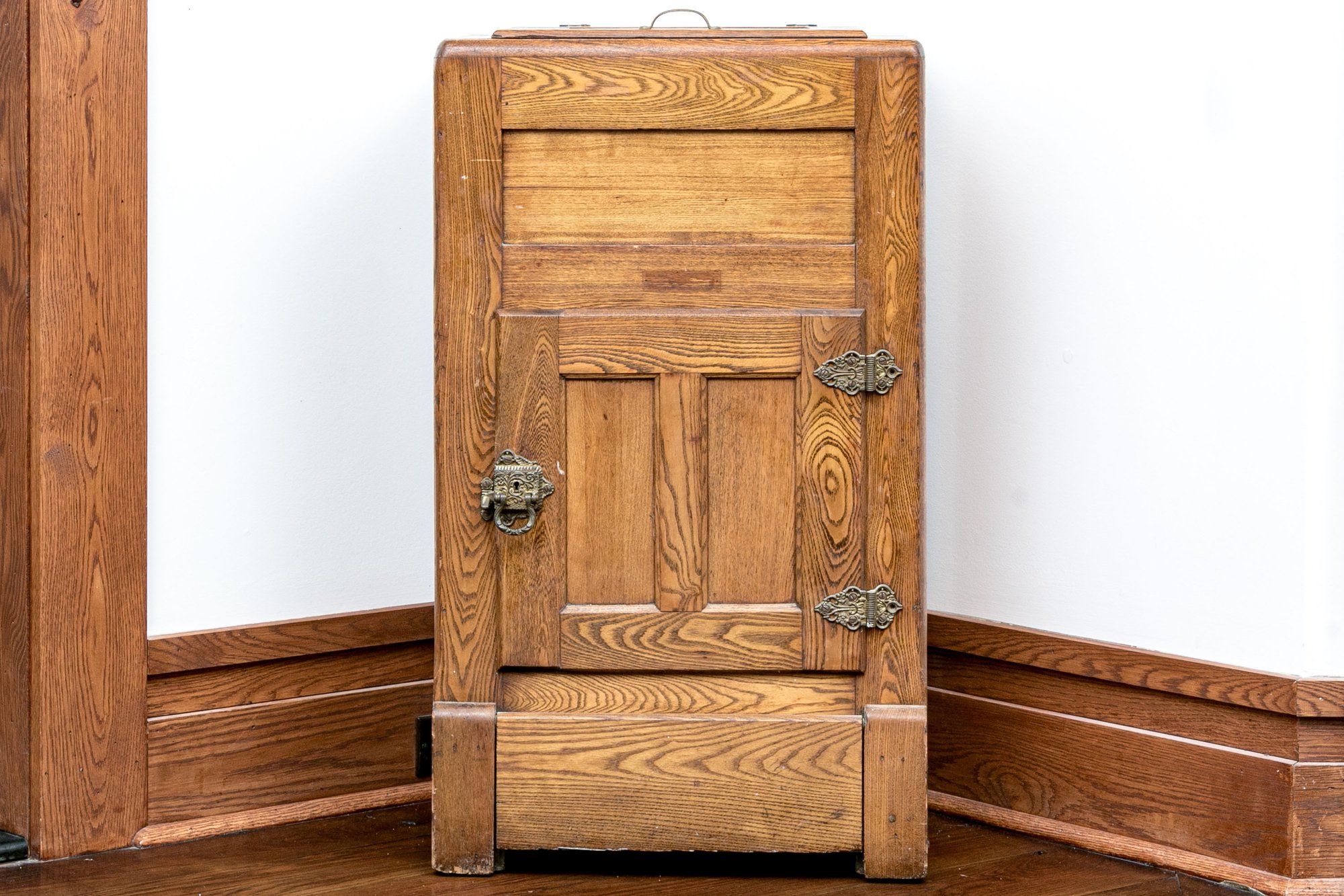 Oak construction with hinged door and brass handles. Wonderful patina.