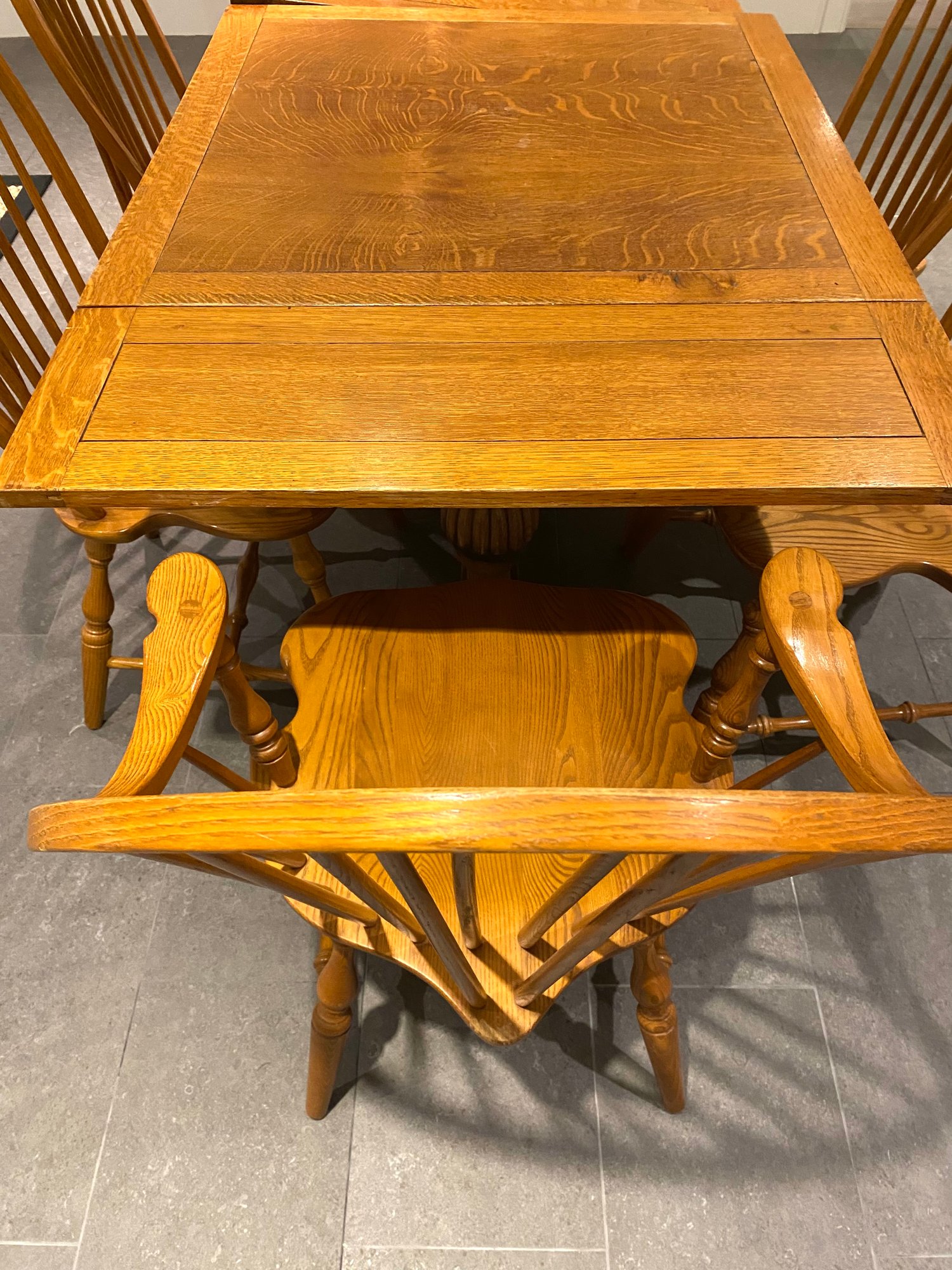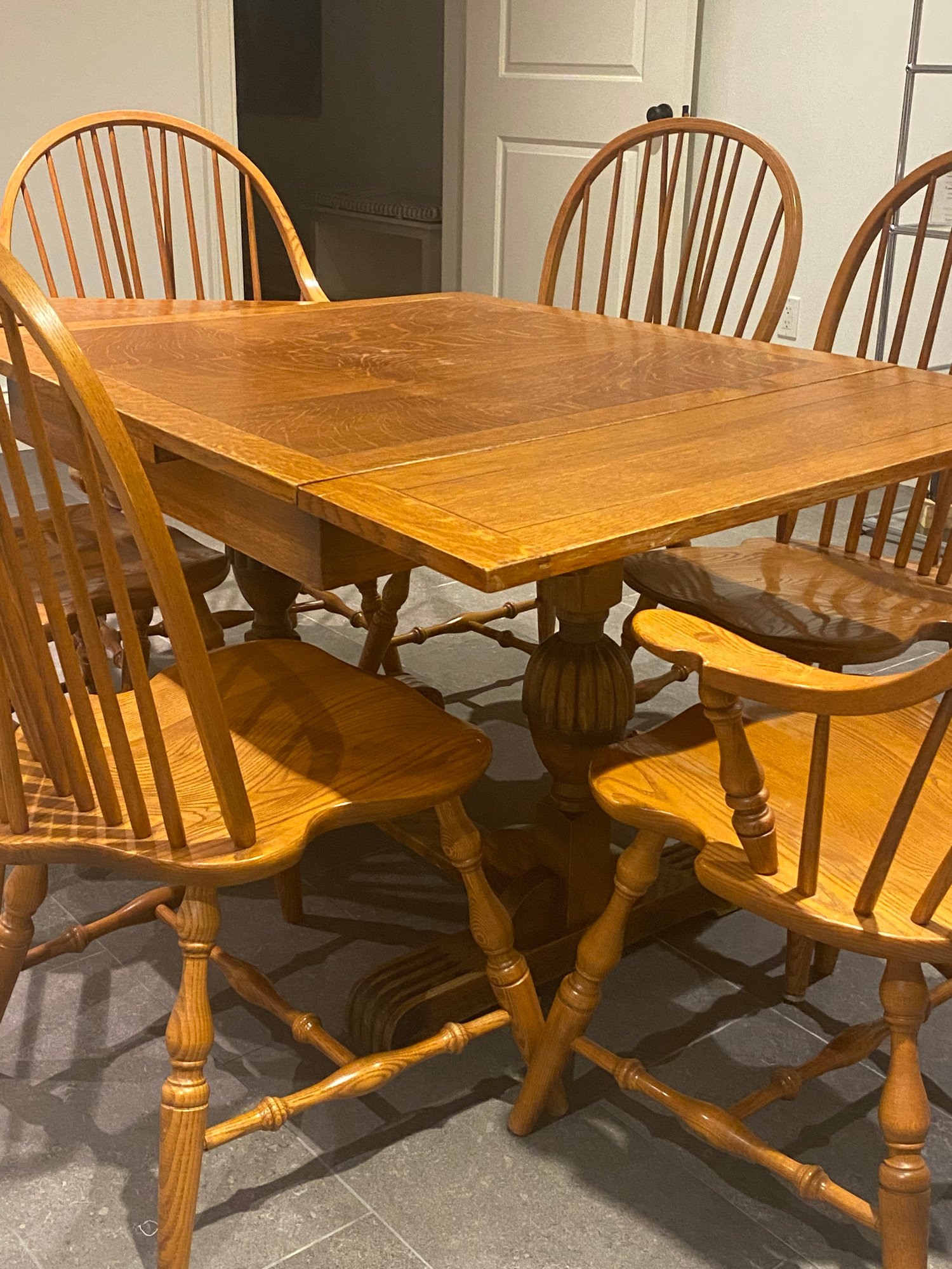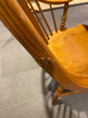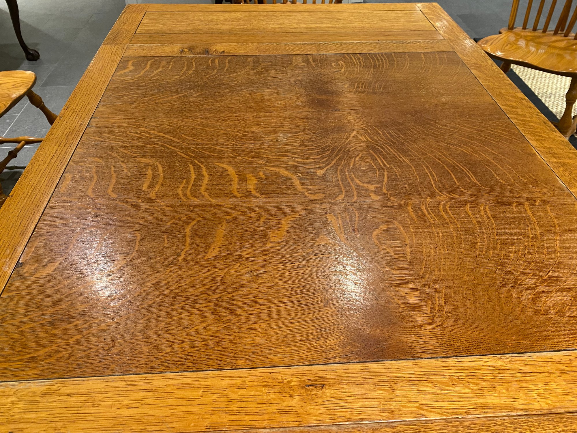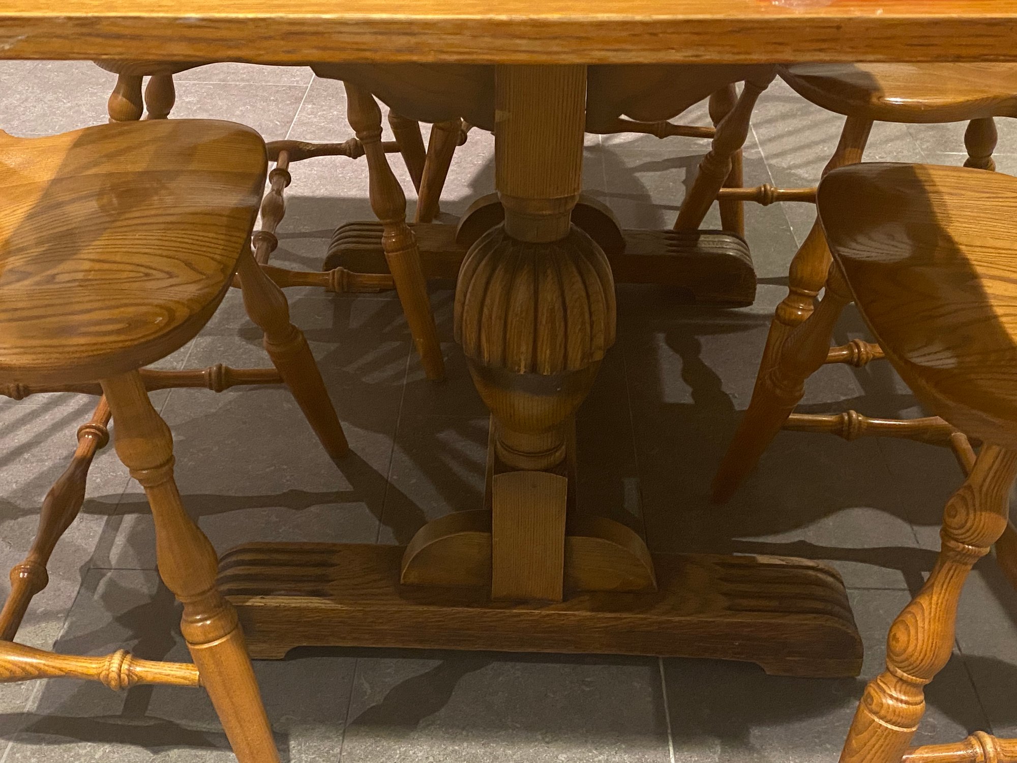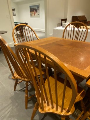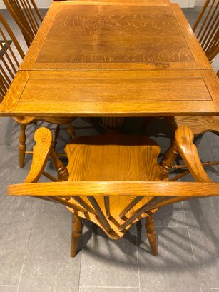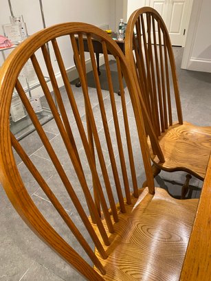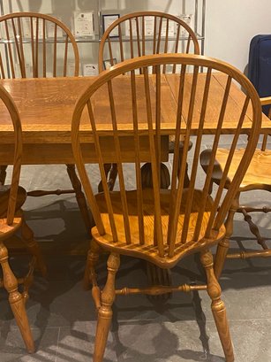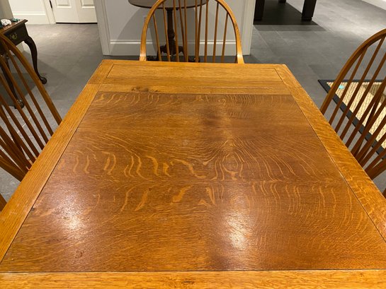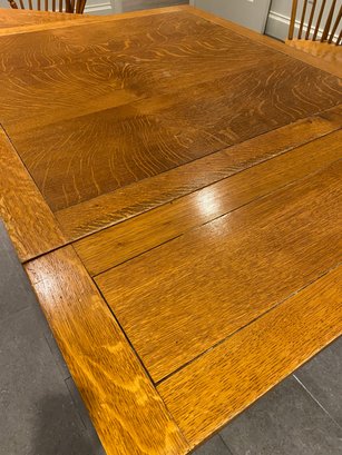 This lovely oak pub table has a trestle style base and a rich warm wood patina from age. It is need of some slight TLC - one end piece is missing the lower bracket that would keep it upright. The chairs were purchased separately from Stickley and one arm chair has crack in the arm - does not affect chair structurally - all an easy