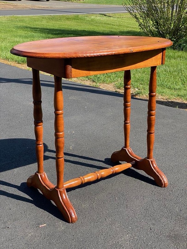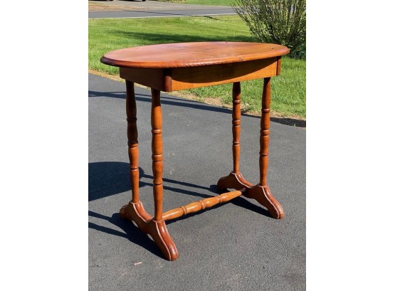 Antique Pine Single Drawer Stand having spindle turned legs and brace and an oval top fastened with wrought iron cut nails. This beautiful country piece would make a great end table, side table or even night stand. 27h x 31w x 18d