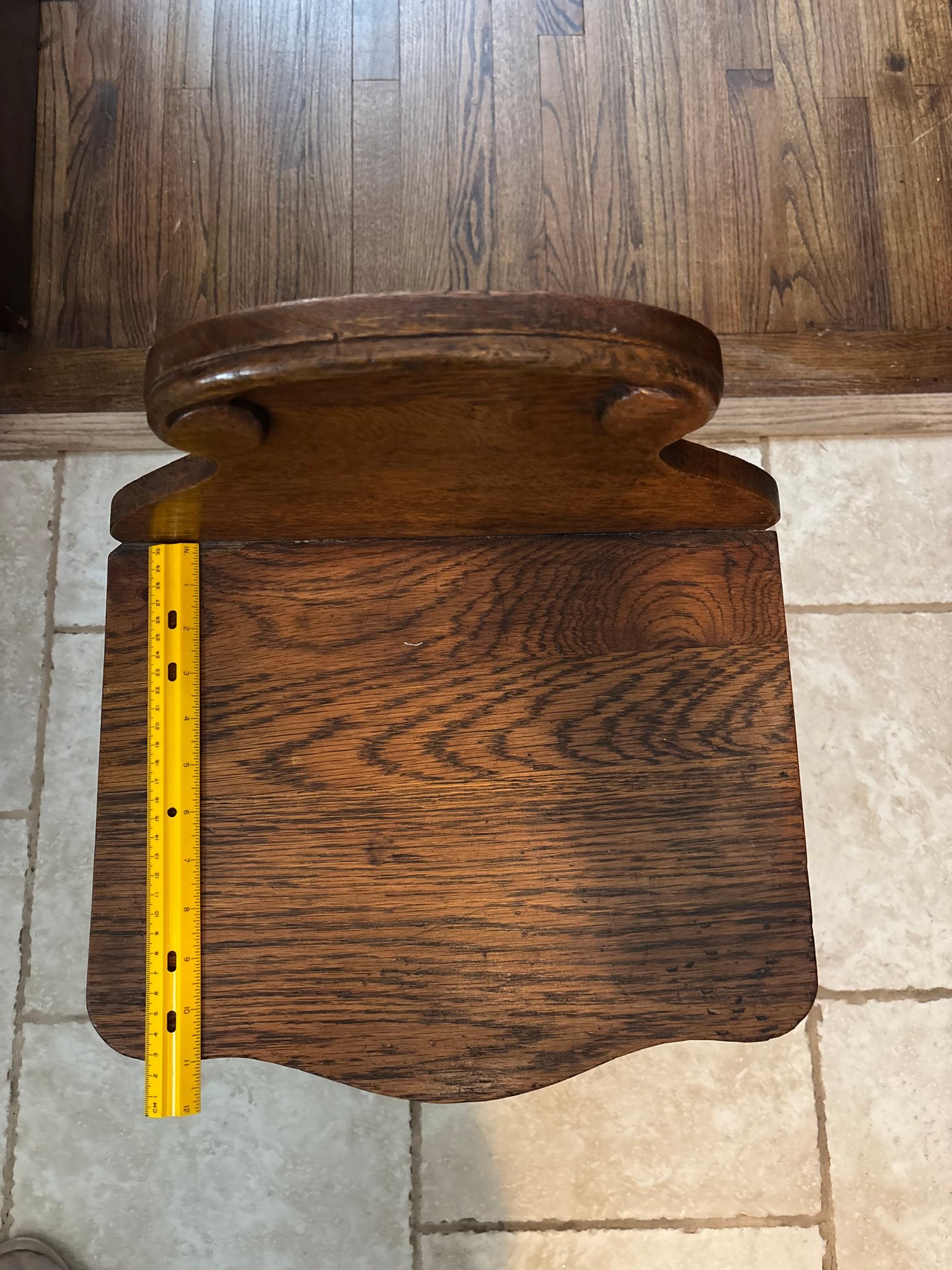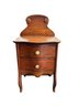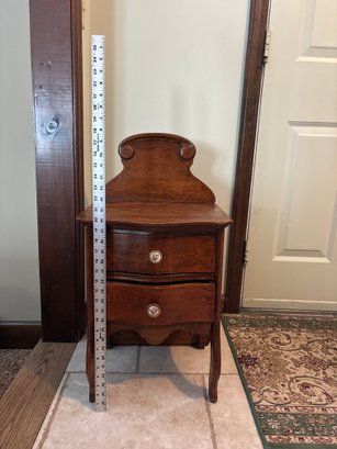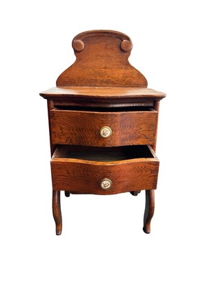 Antique quarter-sawn oak grain 2 Drawer Nightstand with Curved Gallery Back and Porcelain Knobs Great Patina! Solid oak antique nightstand featuring a tall scalloped gallery back, two serpentine-front drawers with pretty floral porcelain (or brass) knobs, shaped apron, and elegant cabriole legs. Warm oak finish with character from ageāminor wear consistent with vintage charm. Perfect bedside accent or small entry/side table. Sturdy and ready to use/display!