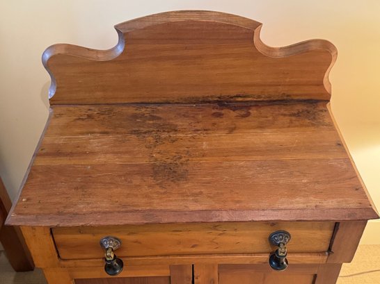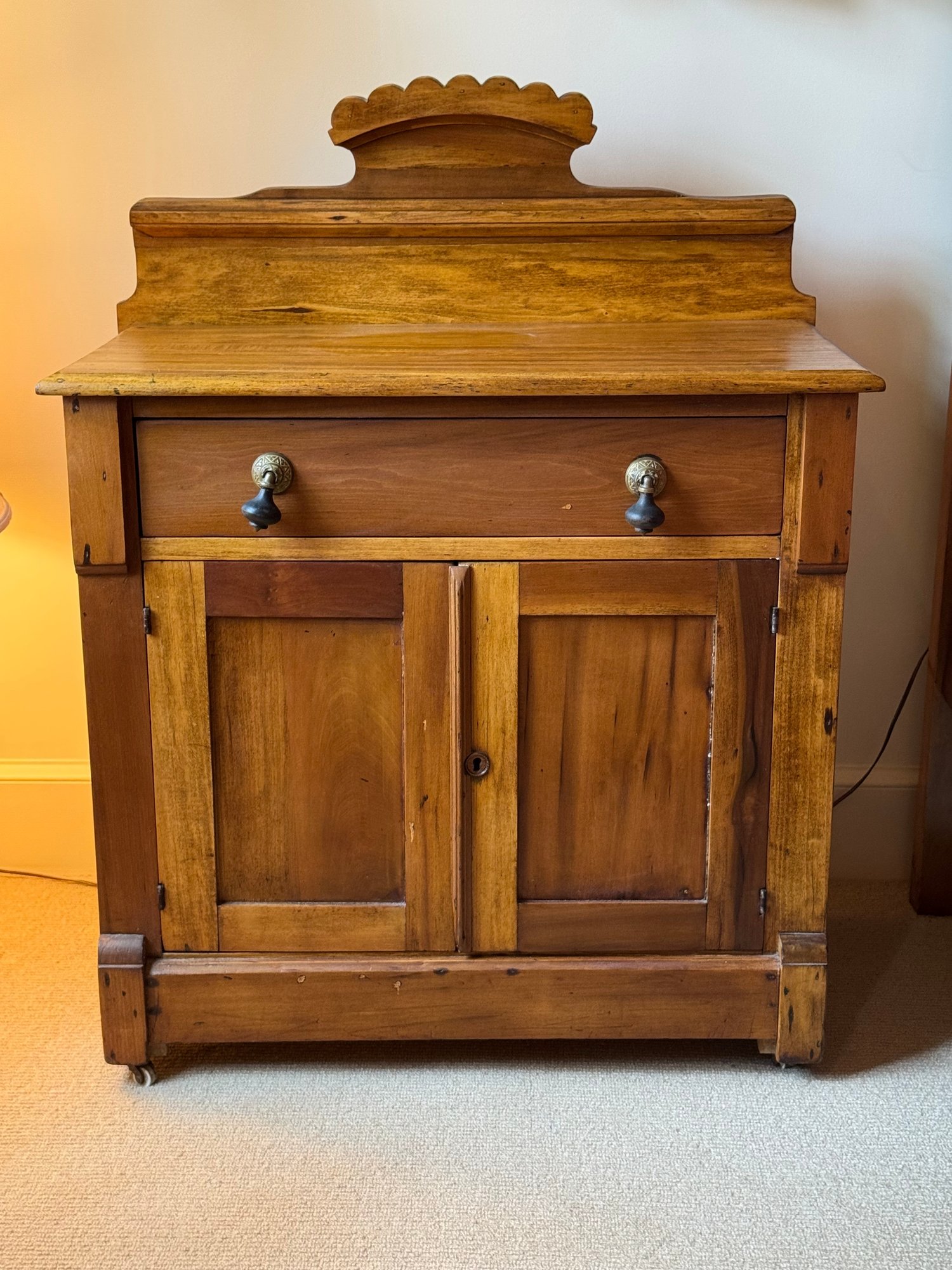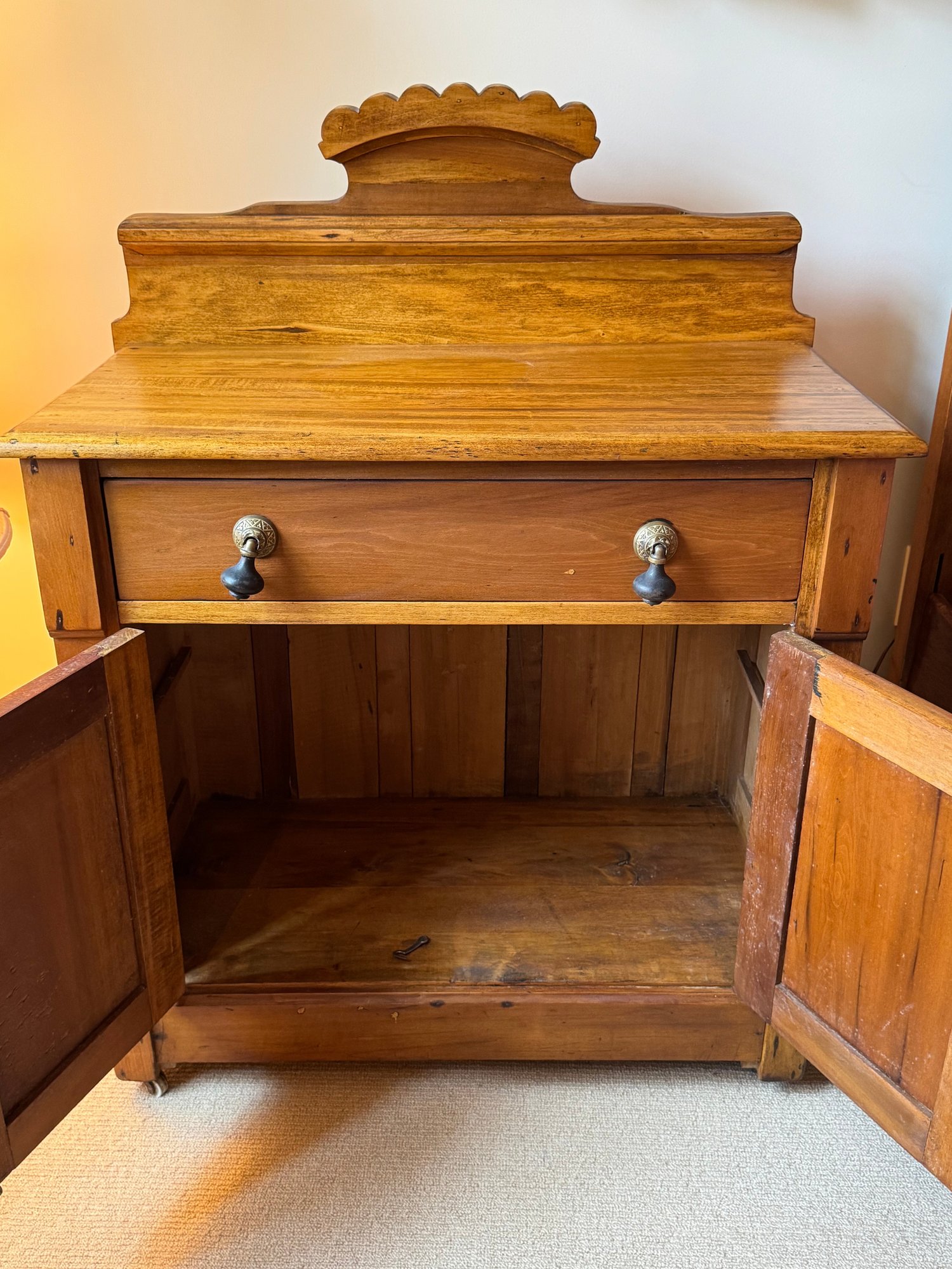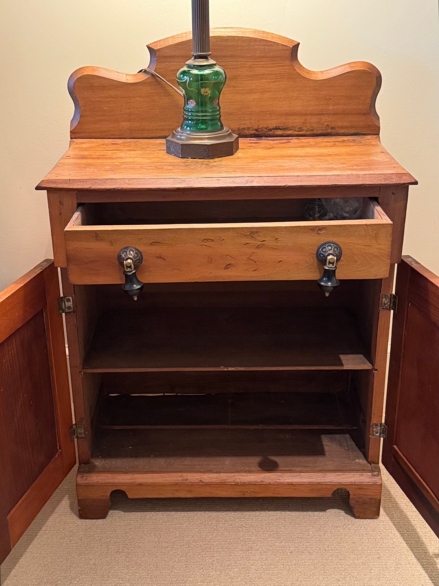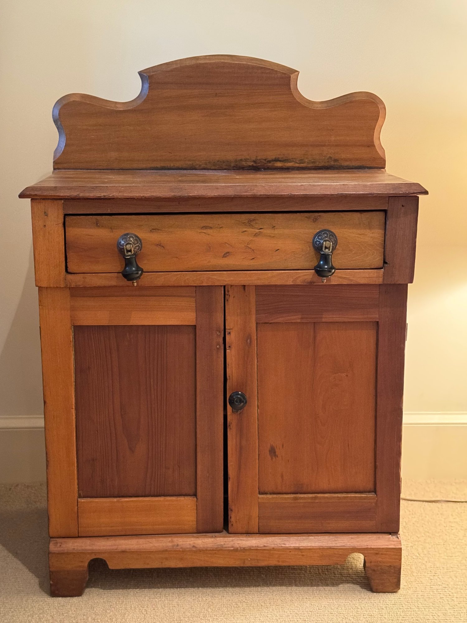 Charming with top arched detail and lovely wood and brass pulls. Note that although similar in appearance they are not exact and one is smaller than the other. They have been used as bedside stands in this weekend guest room.