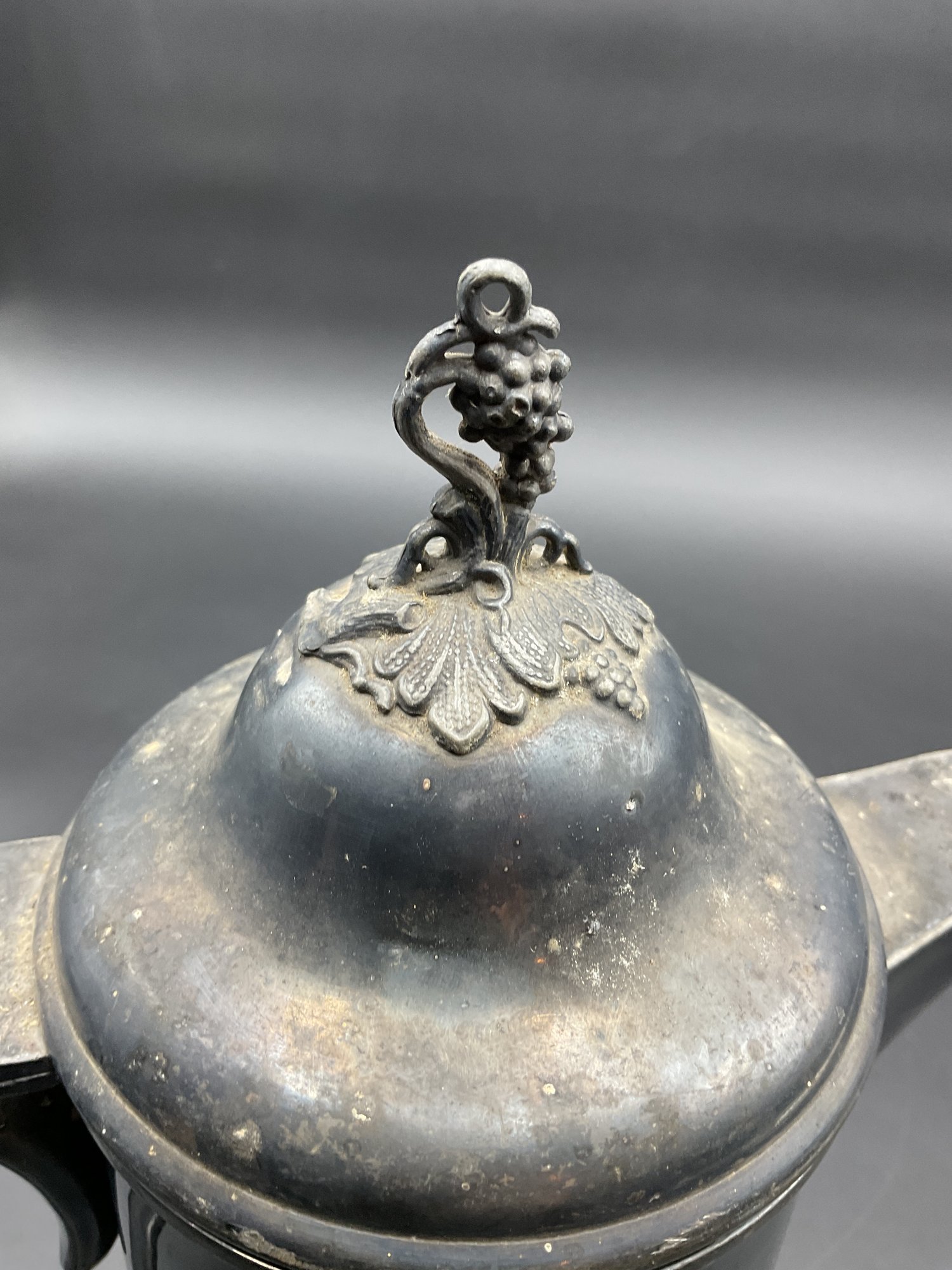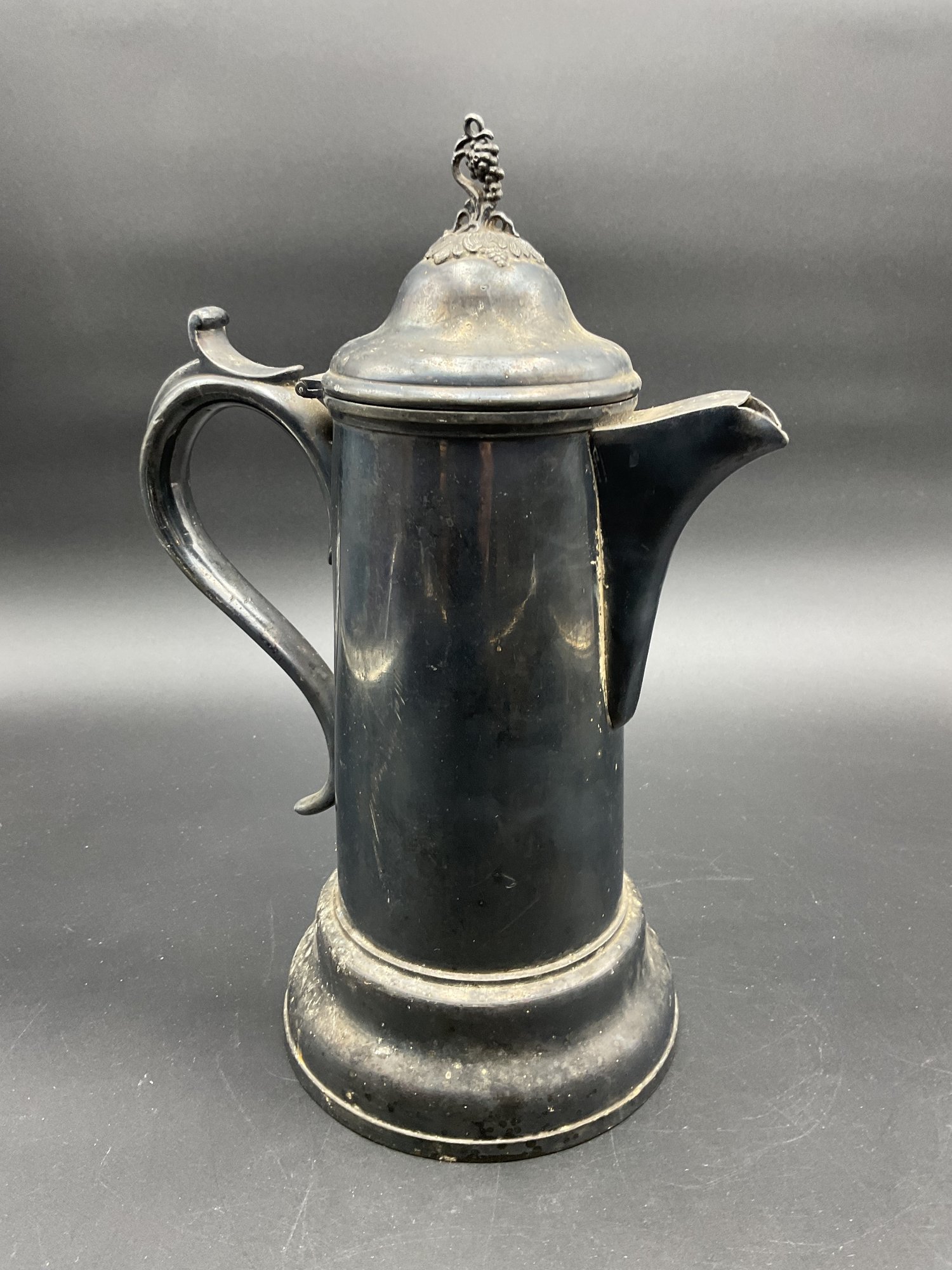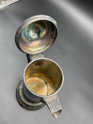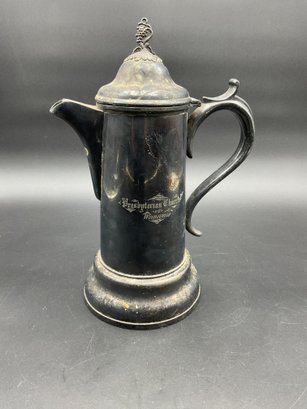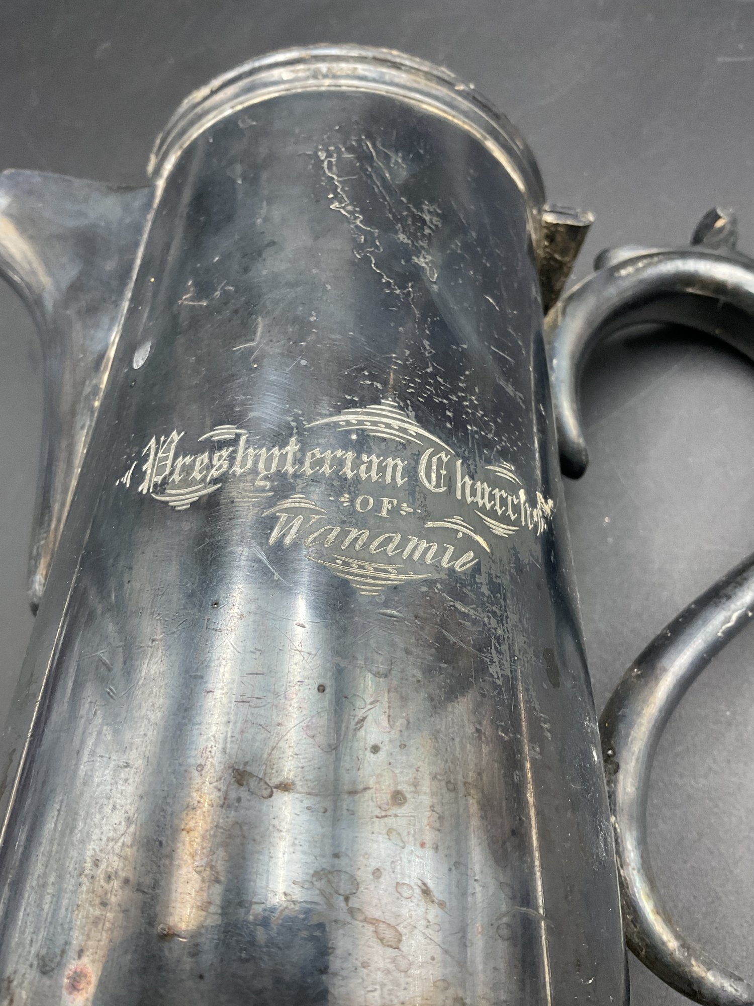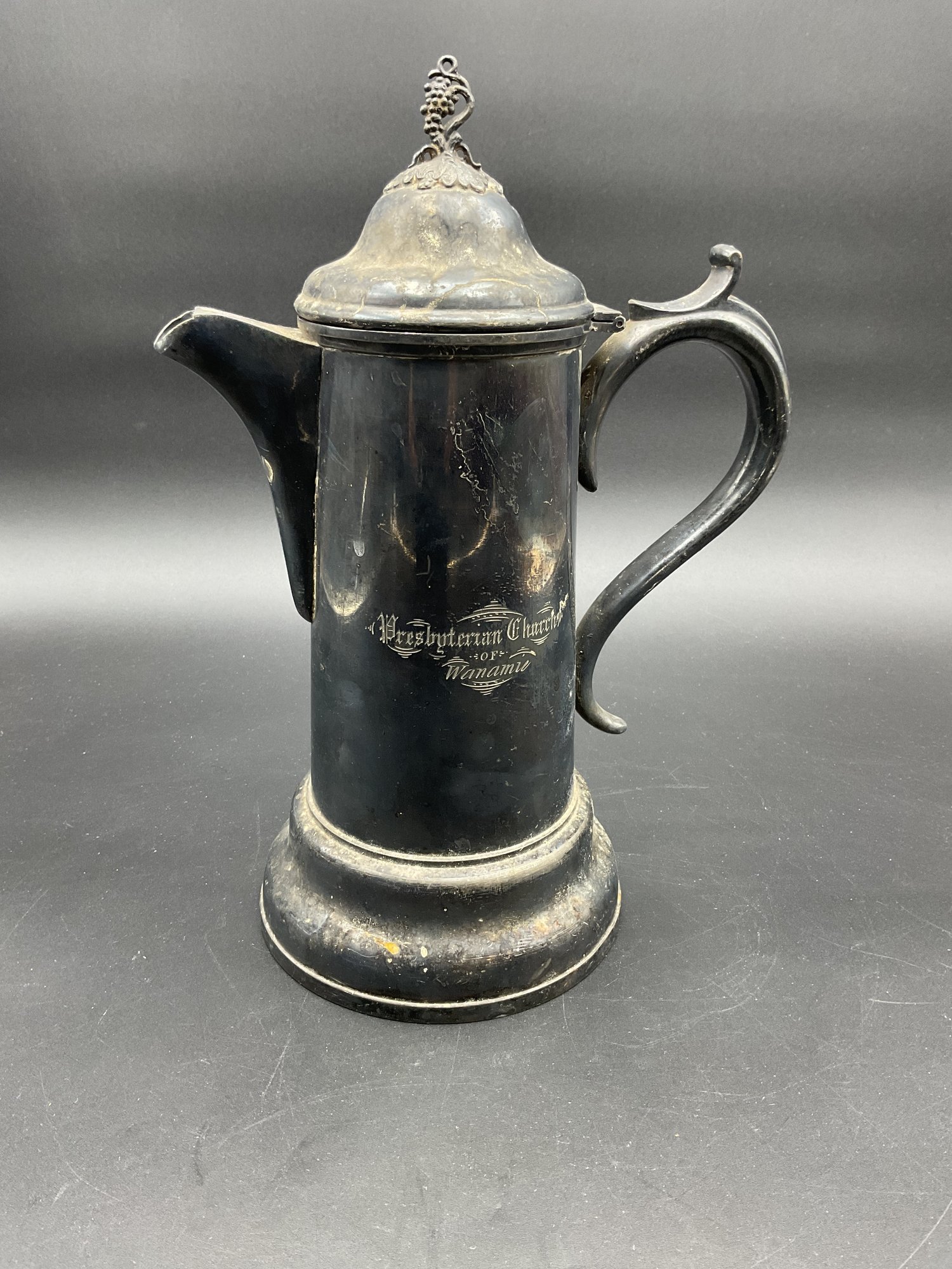 Large antique pitcher is in very good condition with original lid and handle well attached. Spout has some dings and there is overall grime and discoloration consistent with age. Engraved "Presbyterian Church of Wanamie", likely referring to Wanamie, PA (church is no longer in existence). We are not sure if this is pewter or silverplate but the sheen is consistent with antique silveplate. No maker noted.