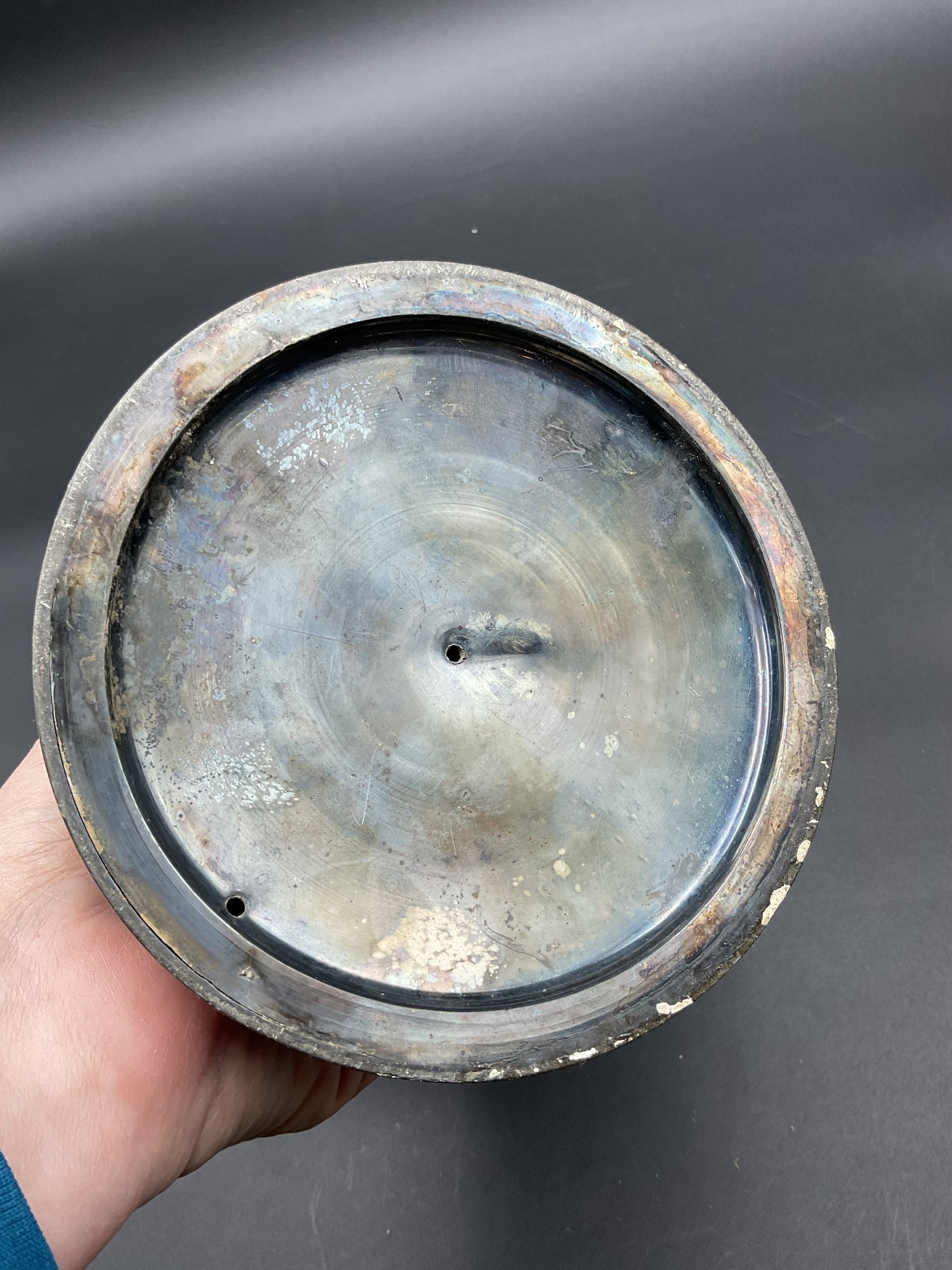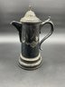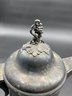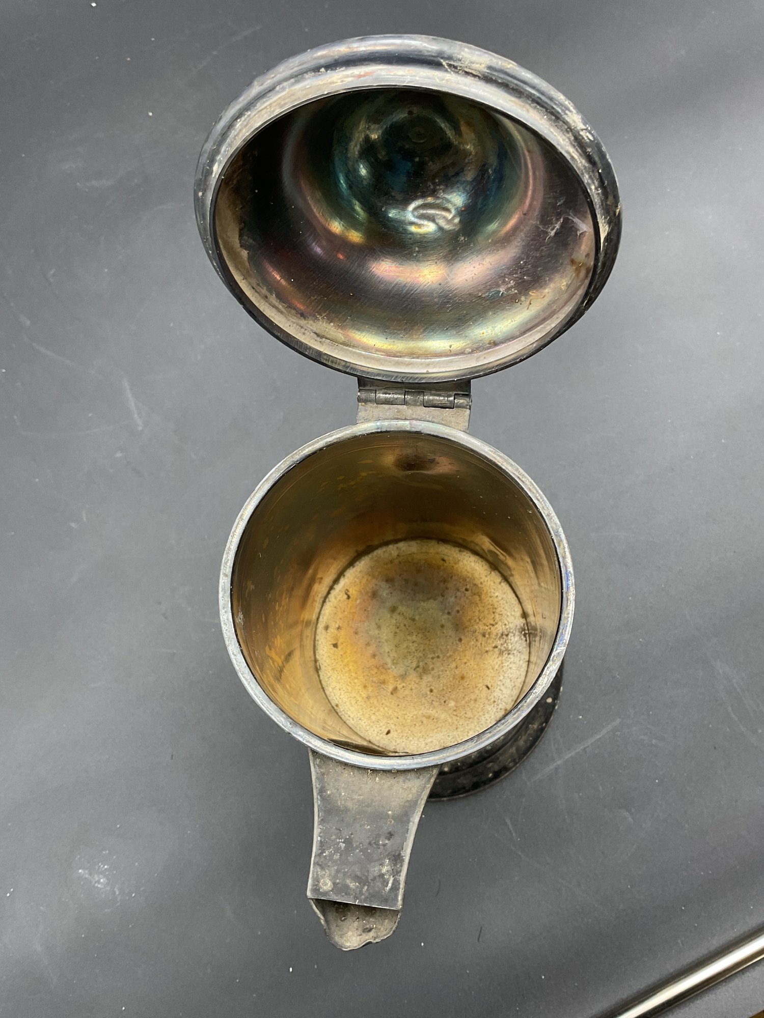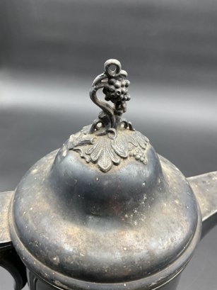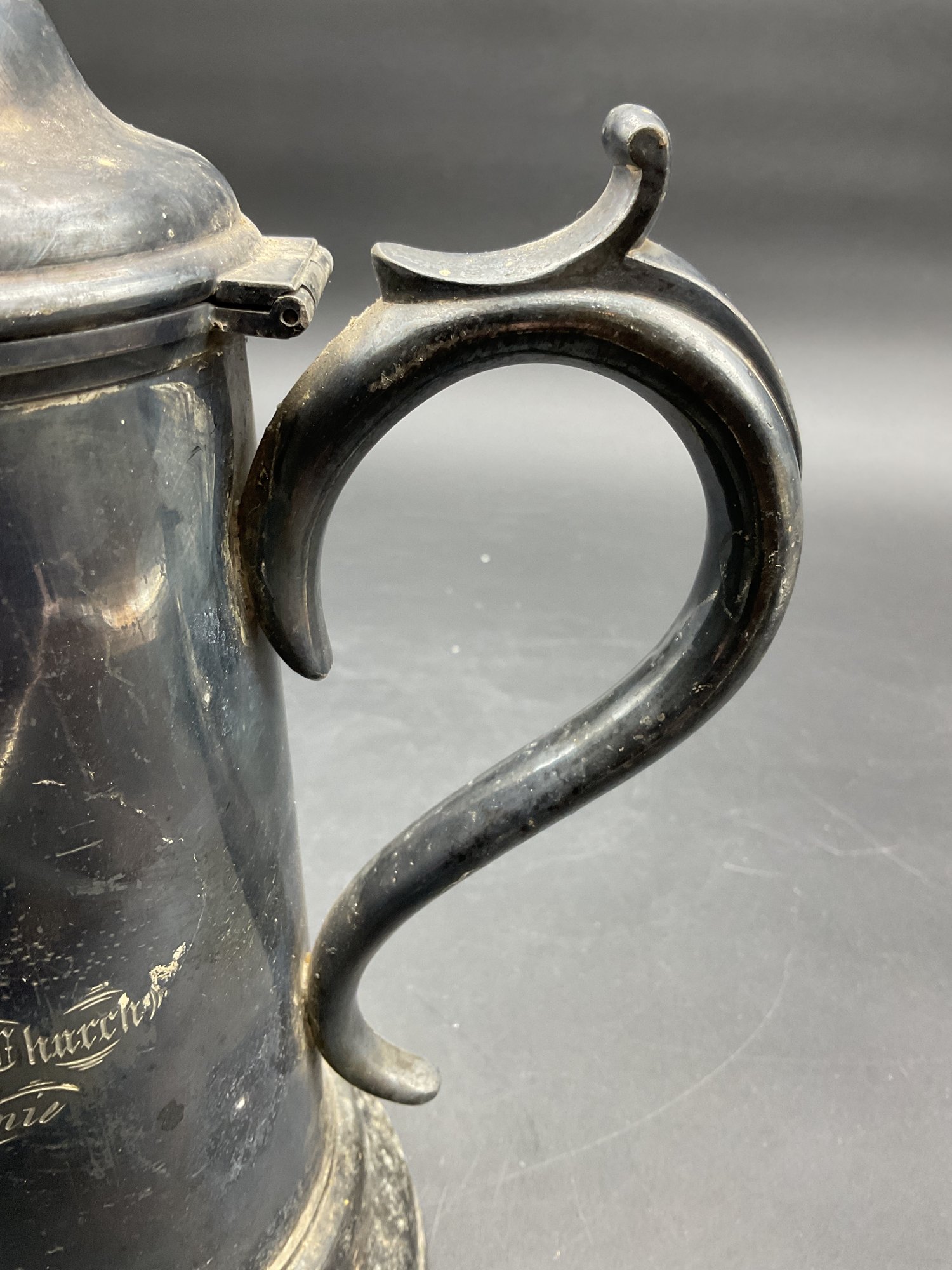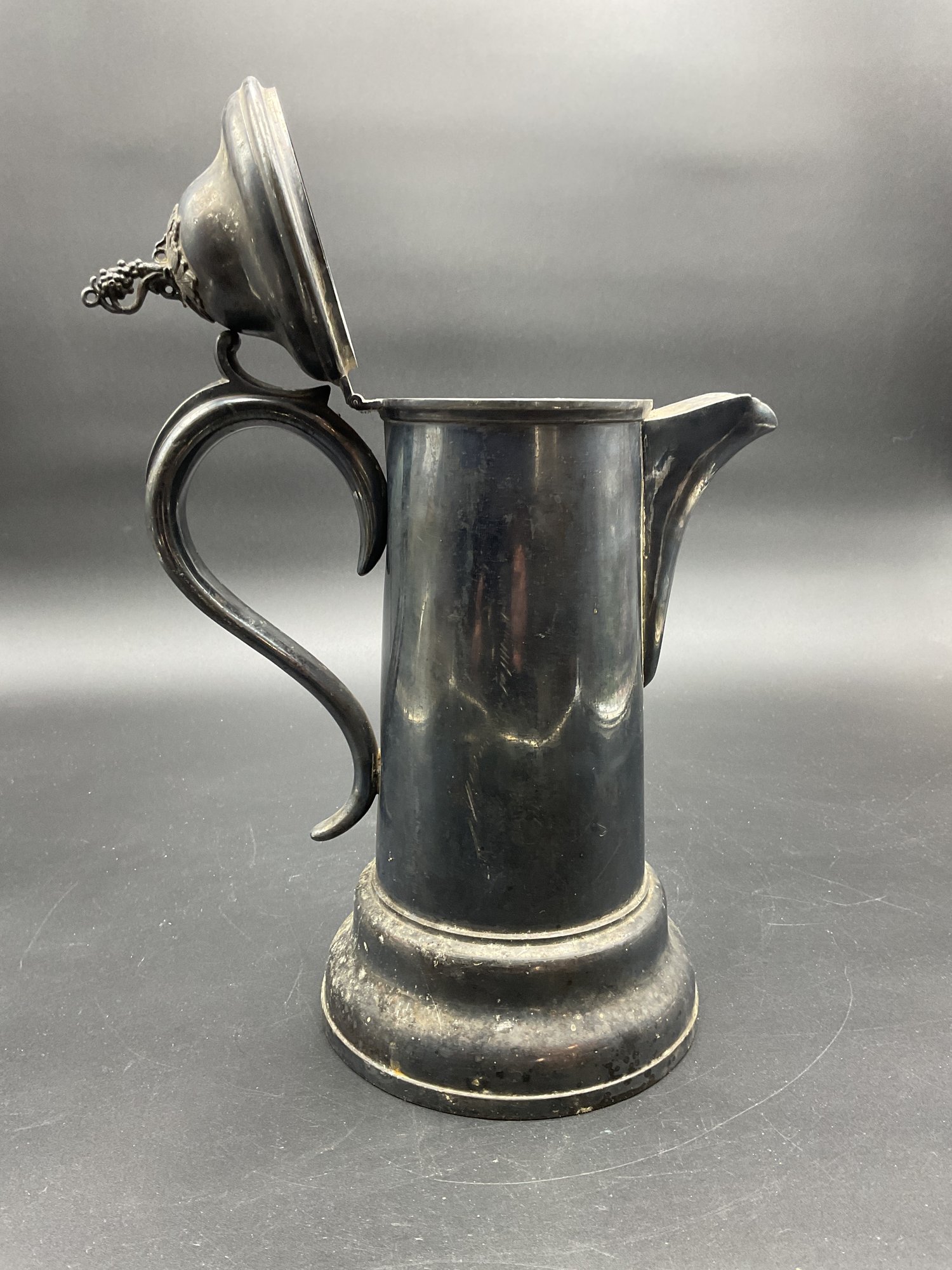 Large antique pitcher is in very good condition with original lid and handle well attached. Spout has some dings and there is overall grime and discoloration consistent with age. Engraved "Presbyterian Church of Wanamie", likely referring to Wanamie, PA (church is no longer in existence). We are not sure if this is pewter or silverplate but the sheen is consistent with antique silveplate. No maker noted.