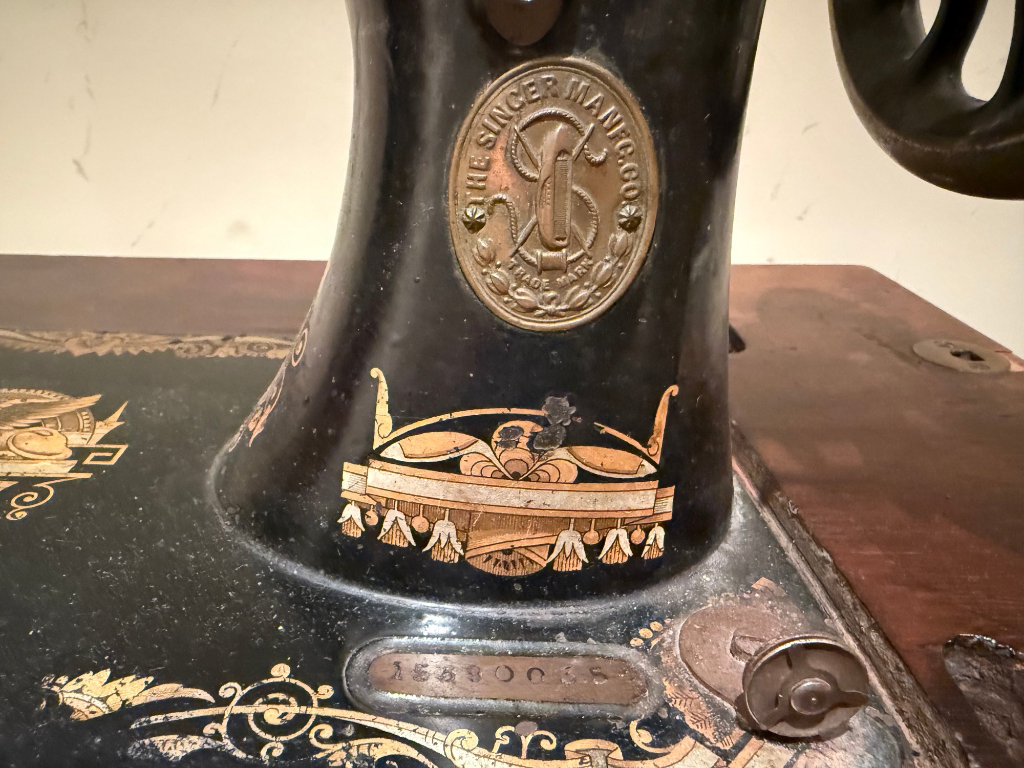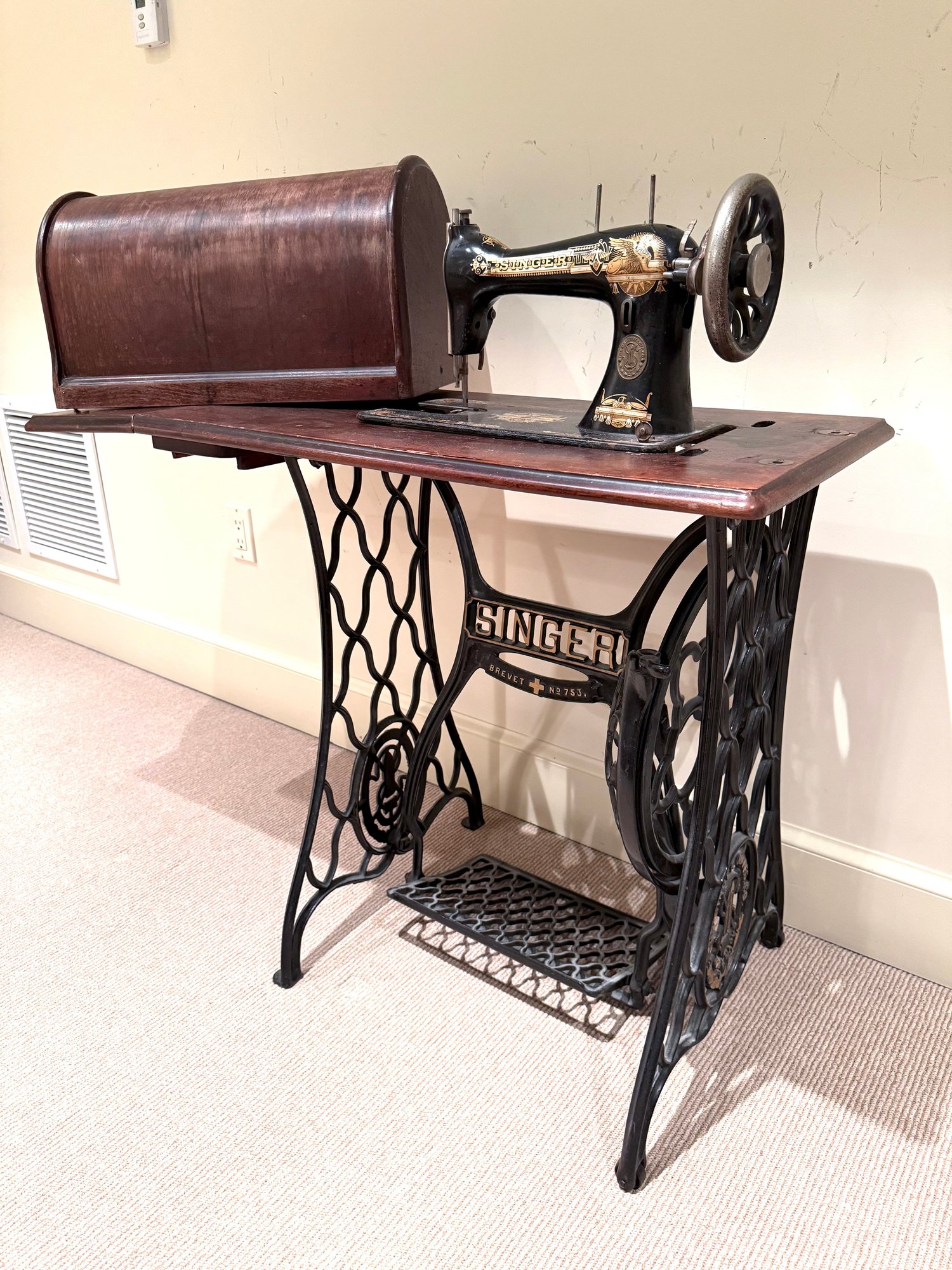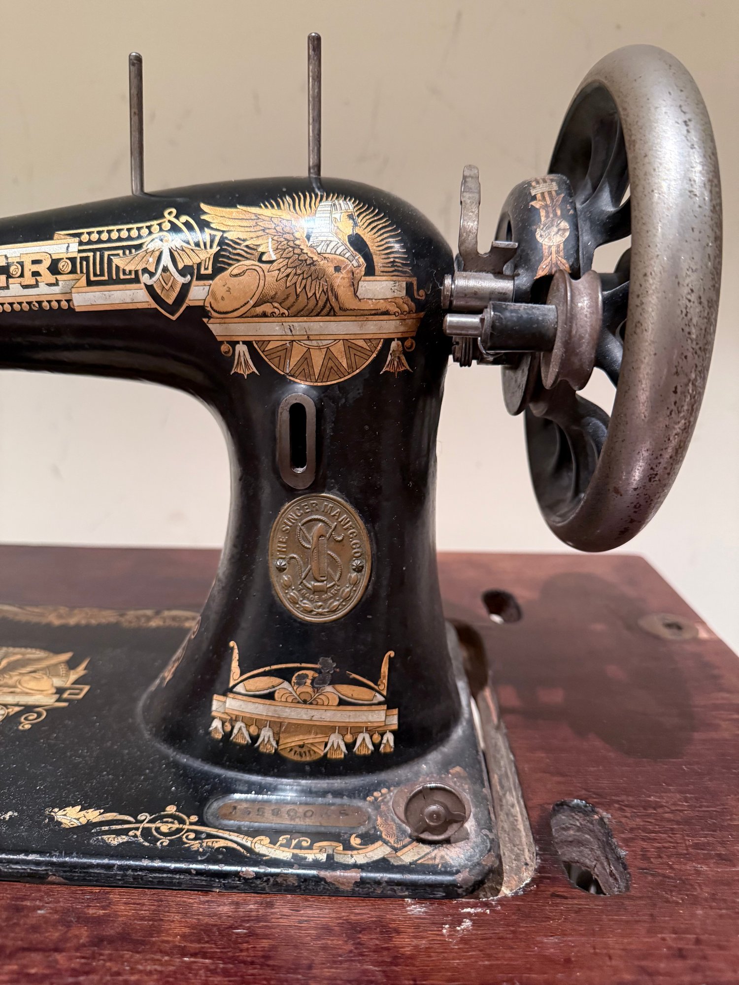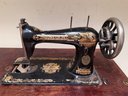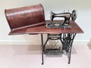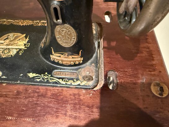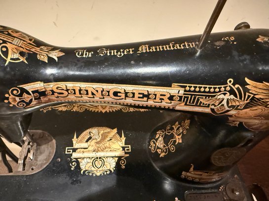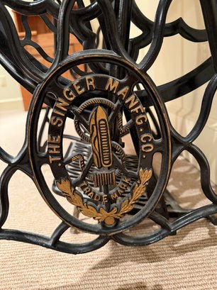 Beautiful antique Singer Sewing machine with ornate gold exterior detailing and original wood cover. The base table is wood with an iron frame. Unsure as to working order and sold as in decorative antique condition.