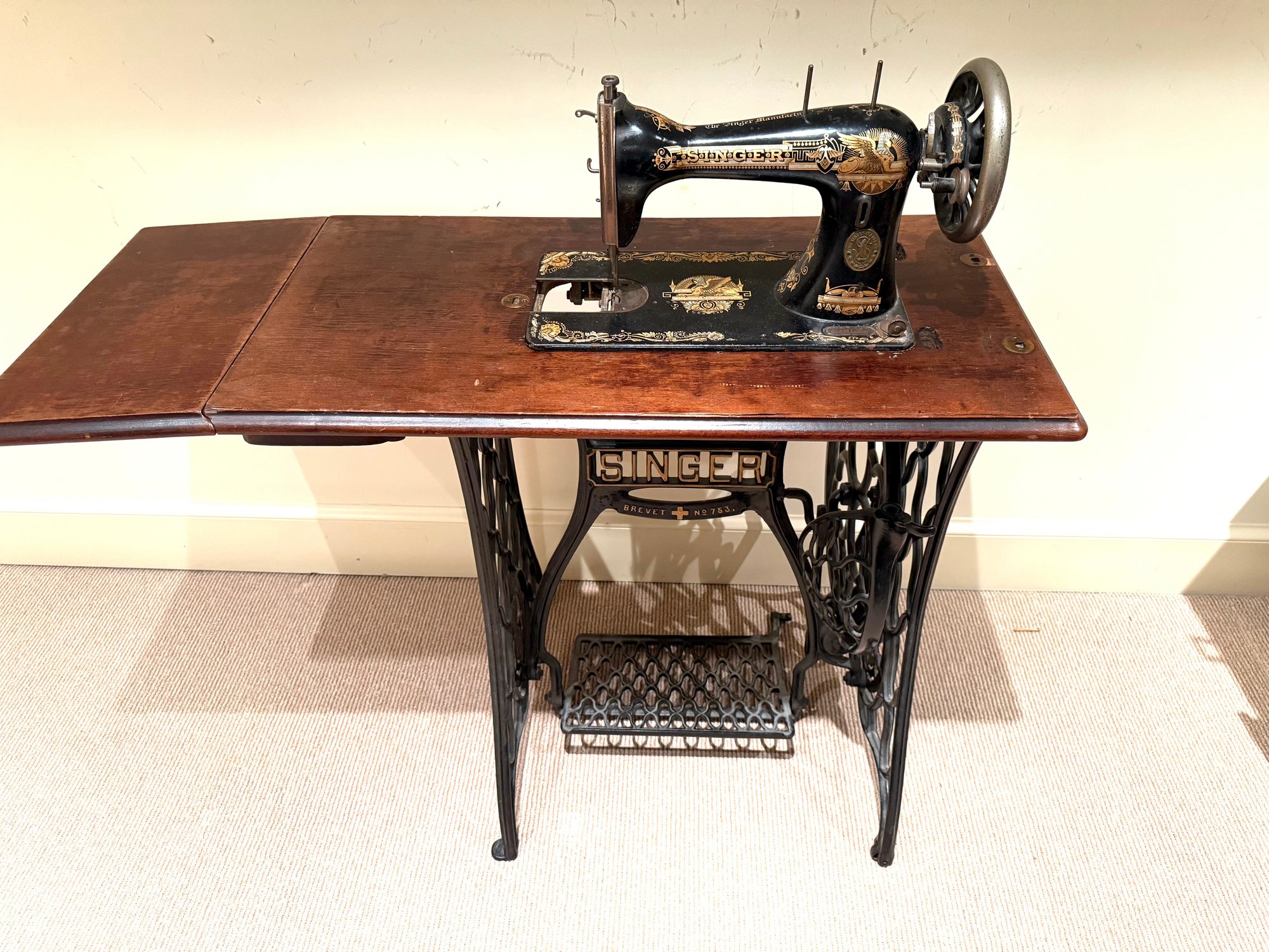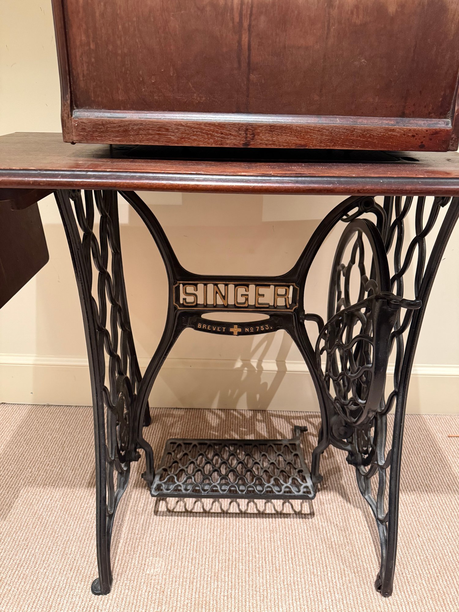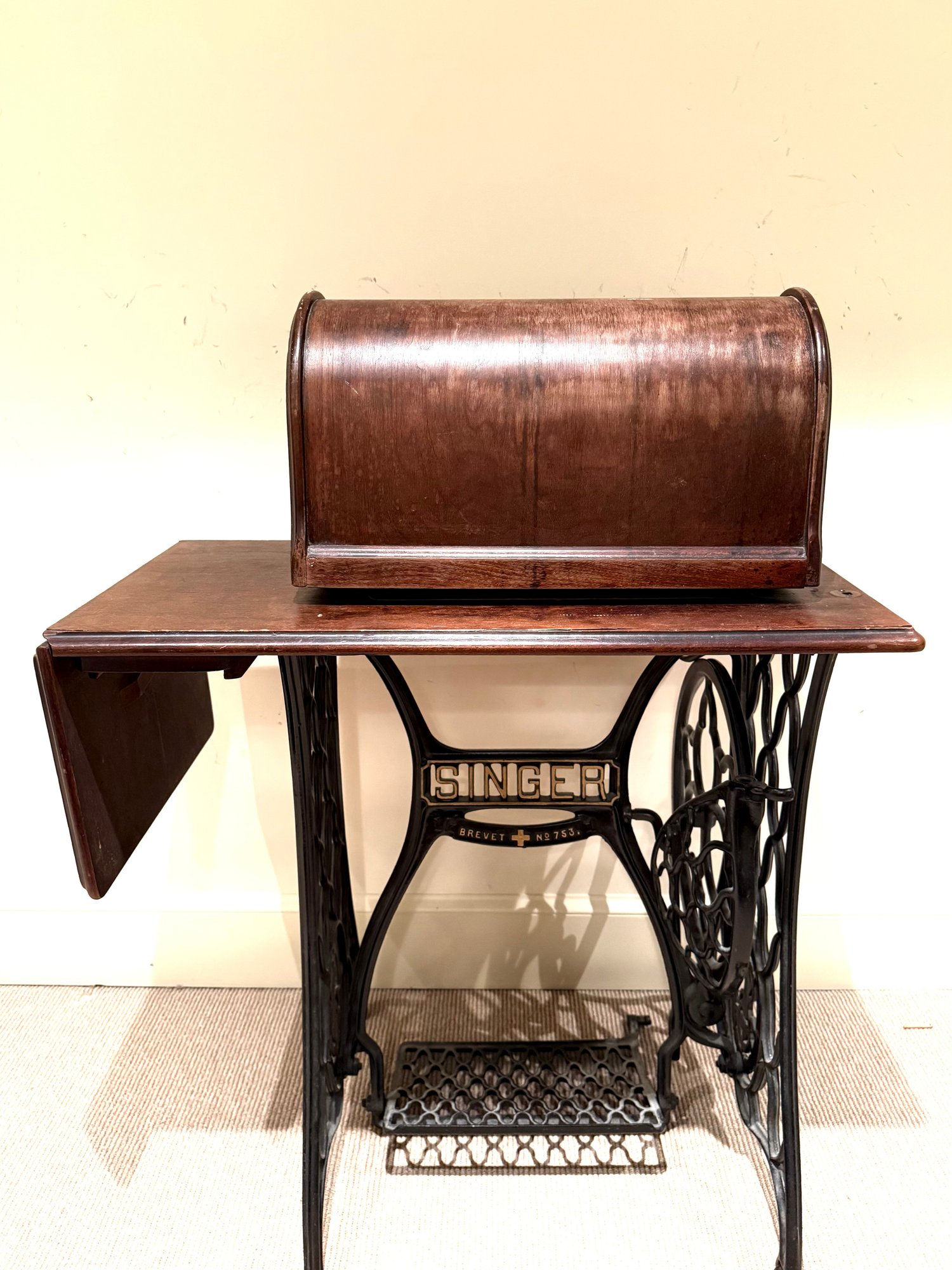 Beautiful antique Singer Sewing machine with ornate gold exterior detailing and original wood cover. The base table is wood with an iron frame. Unsure as to working order and sold as in decorative antique condition.