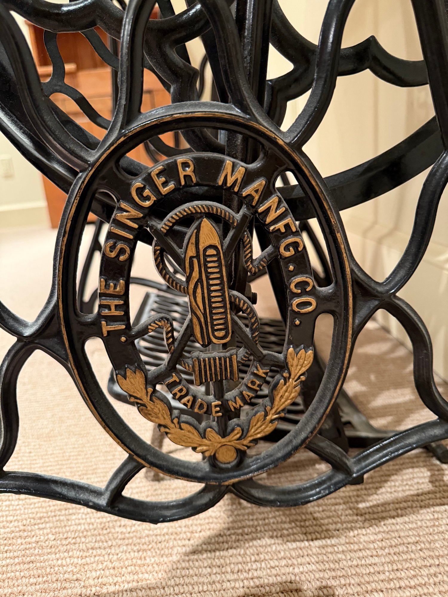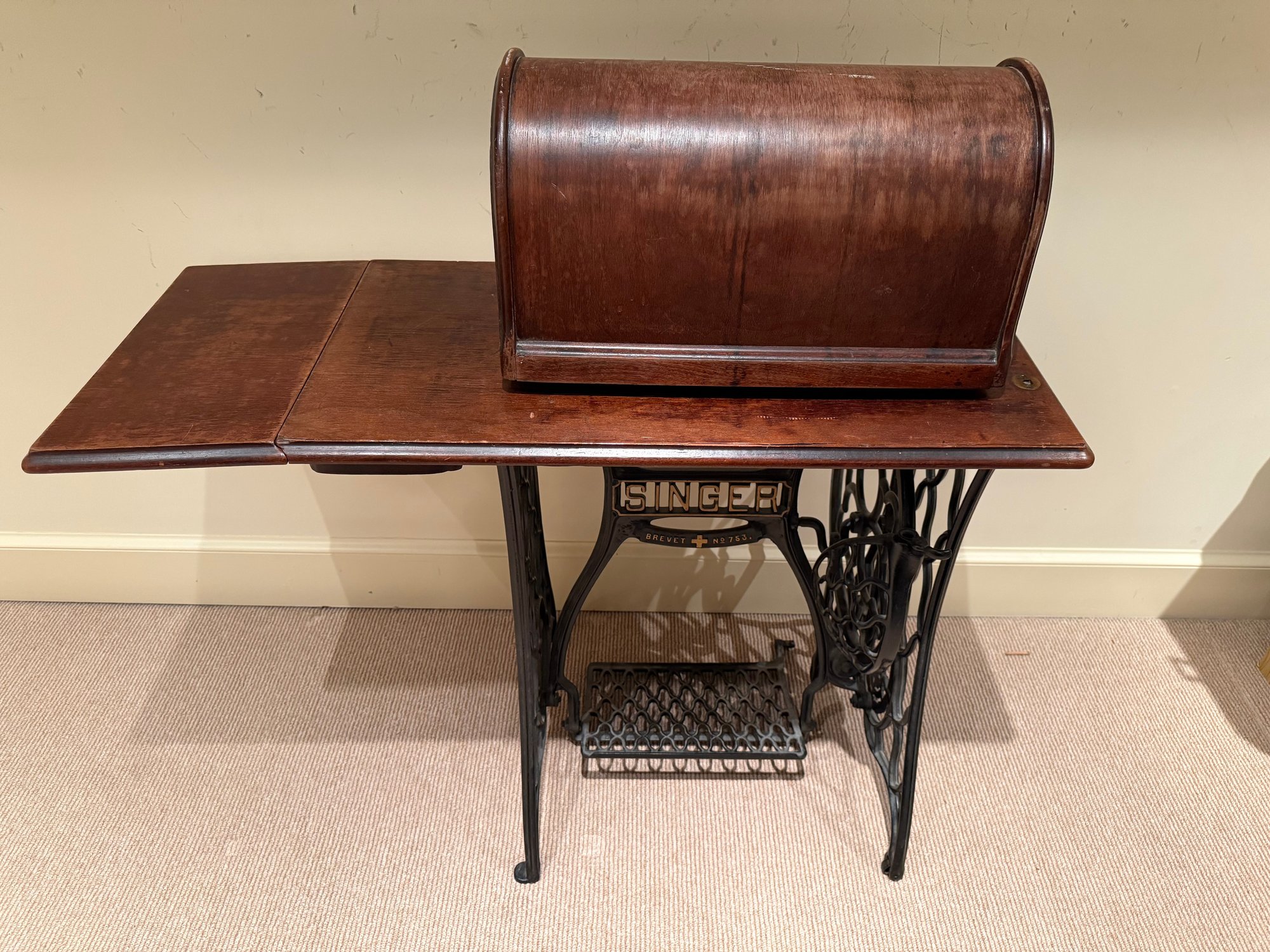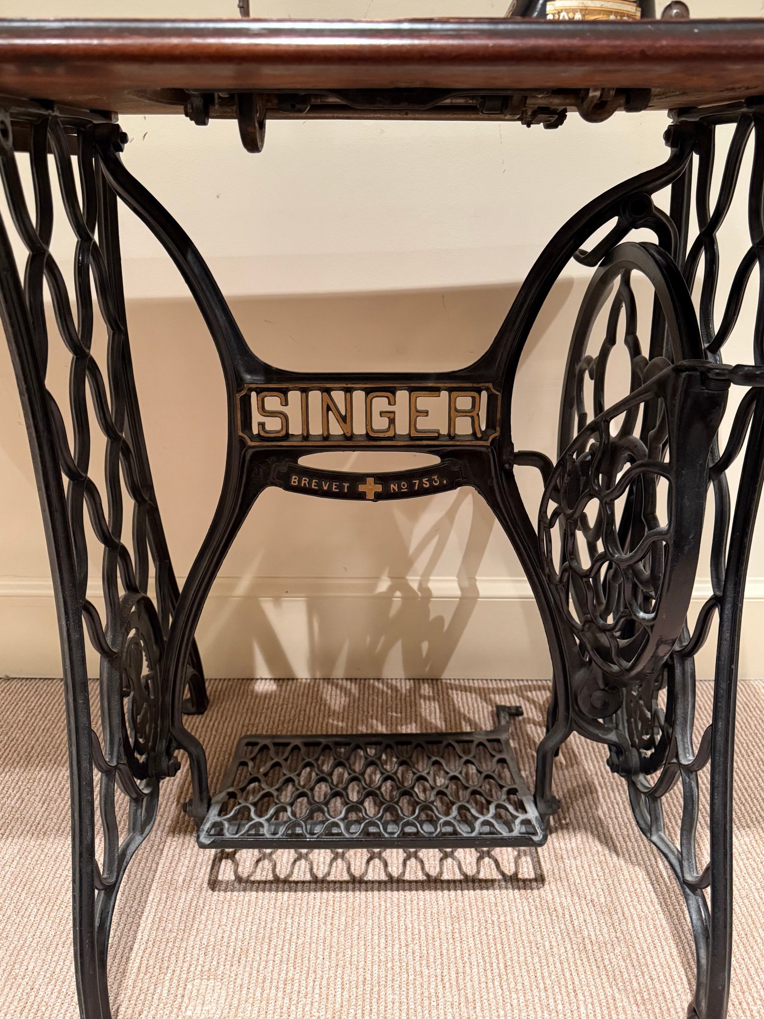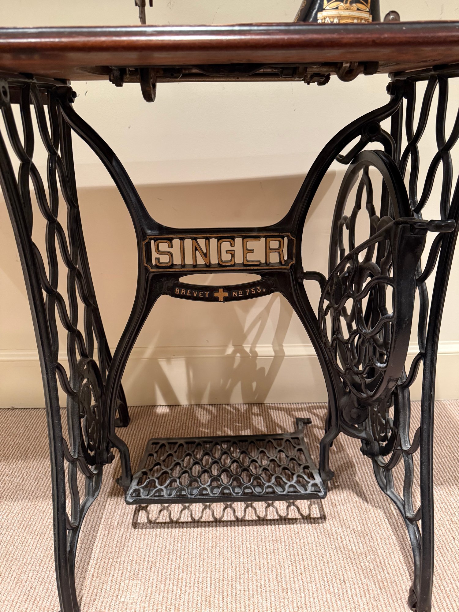 Beautiful antique Singer Sewing machine with ornate gold exterior detailing and original wood cover. The base table is wood with an iron frame. Unsure as to working order and sold as in decorative antique condition.