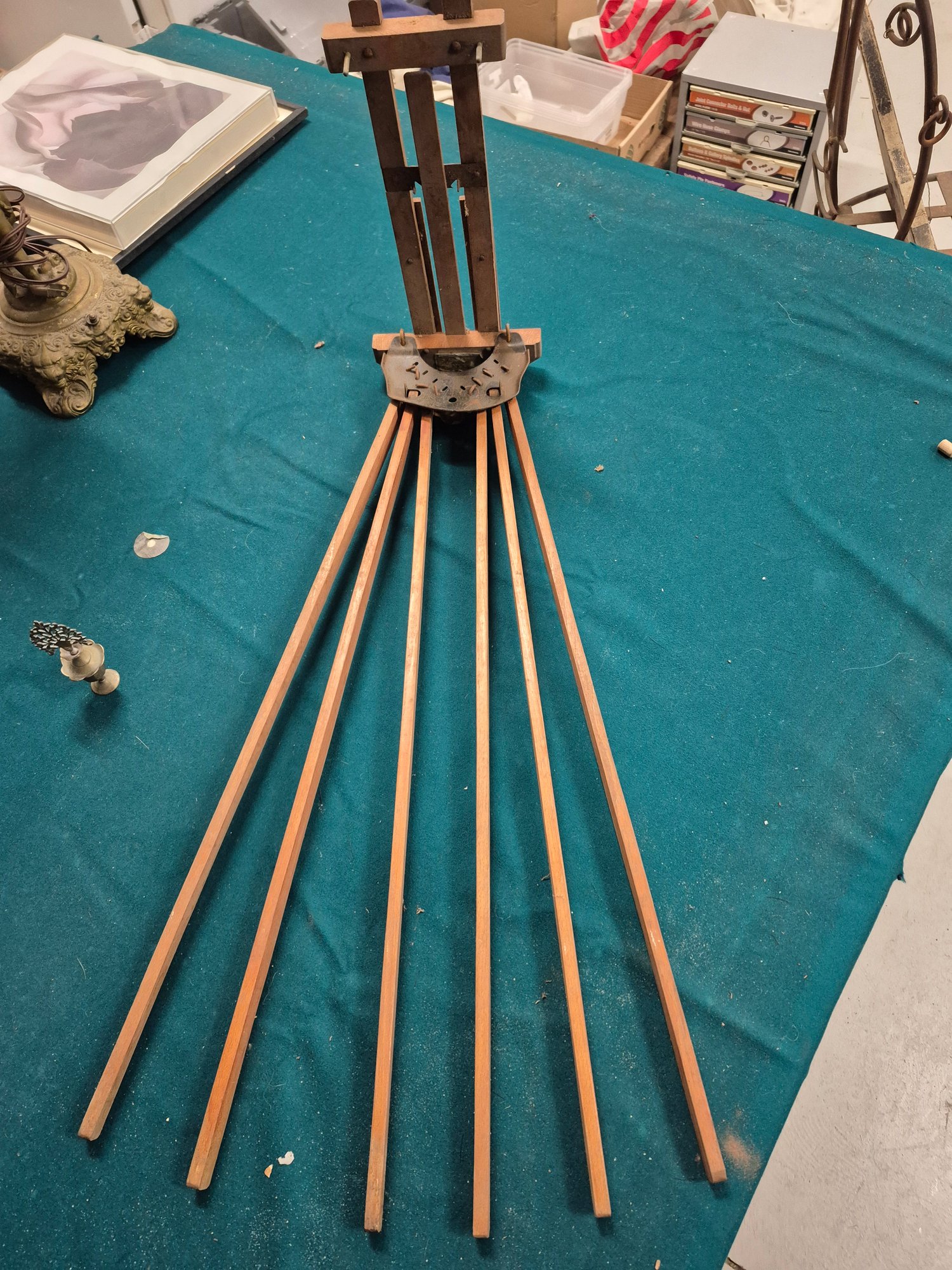 Manufactured by L. Hopkins at the turn of the century, as early as the late 19th century. Mounted to a wall, the arms spread out, for hanging and drying wet clothing post wash. Very nice example.
