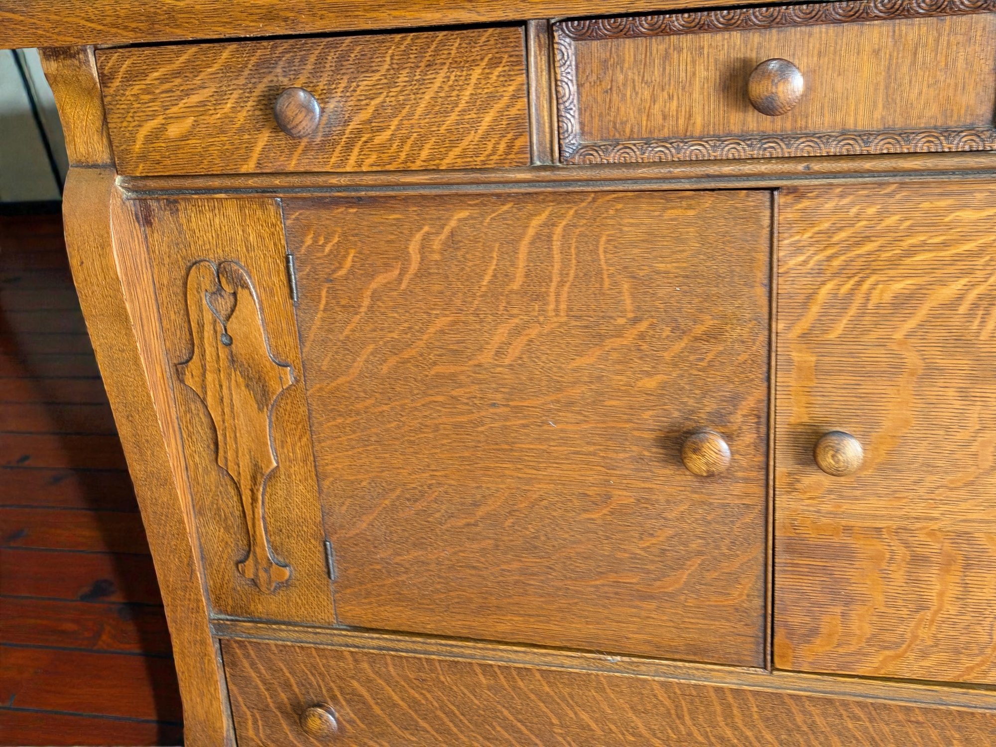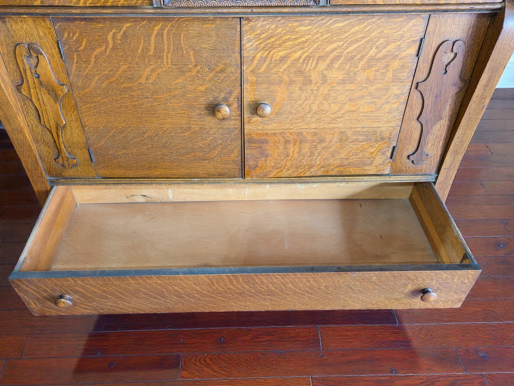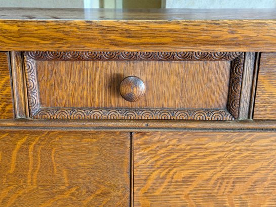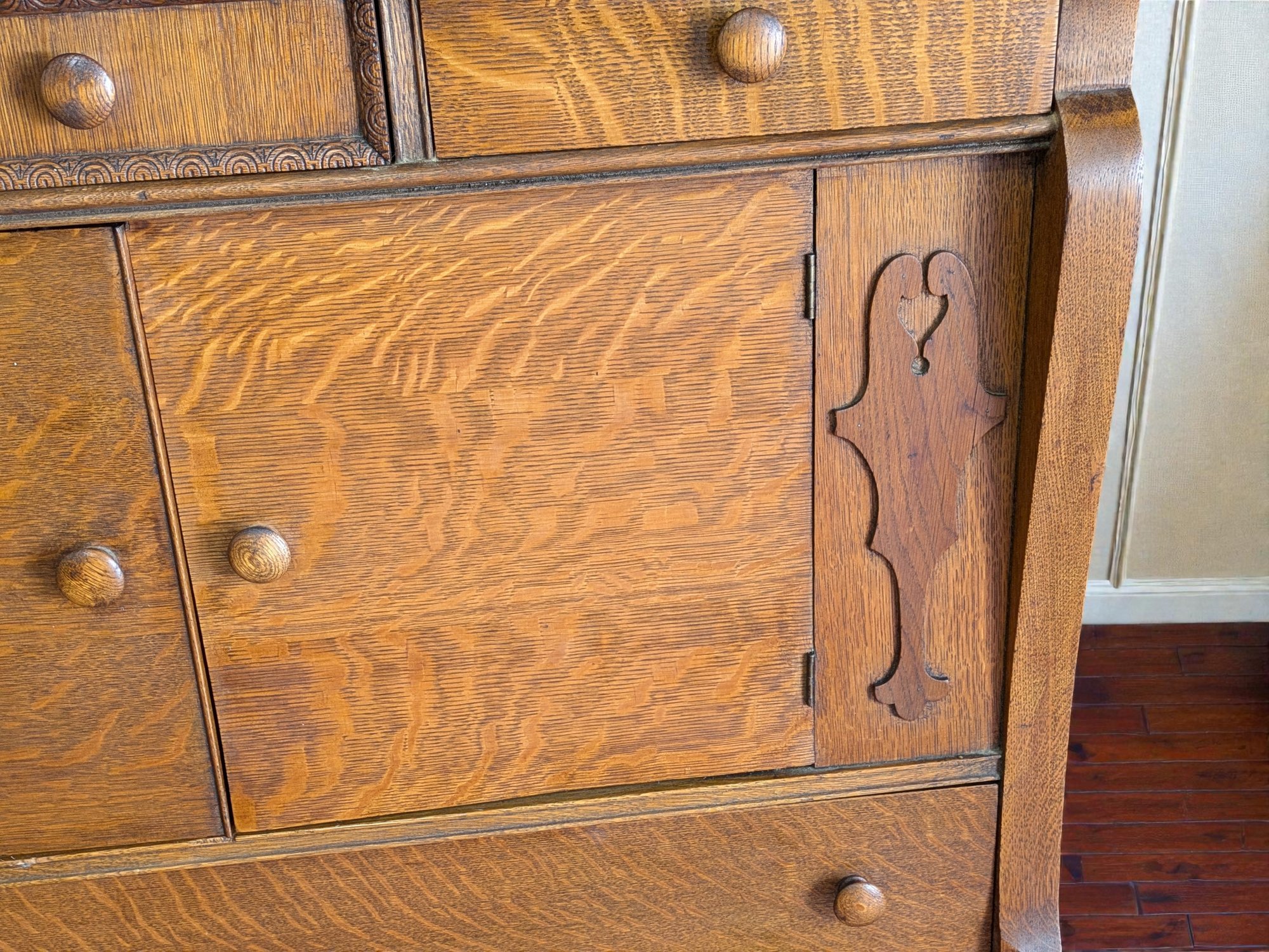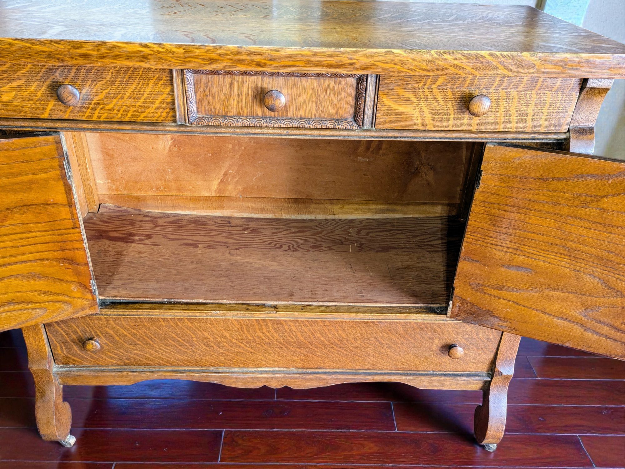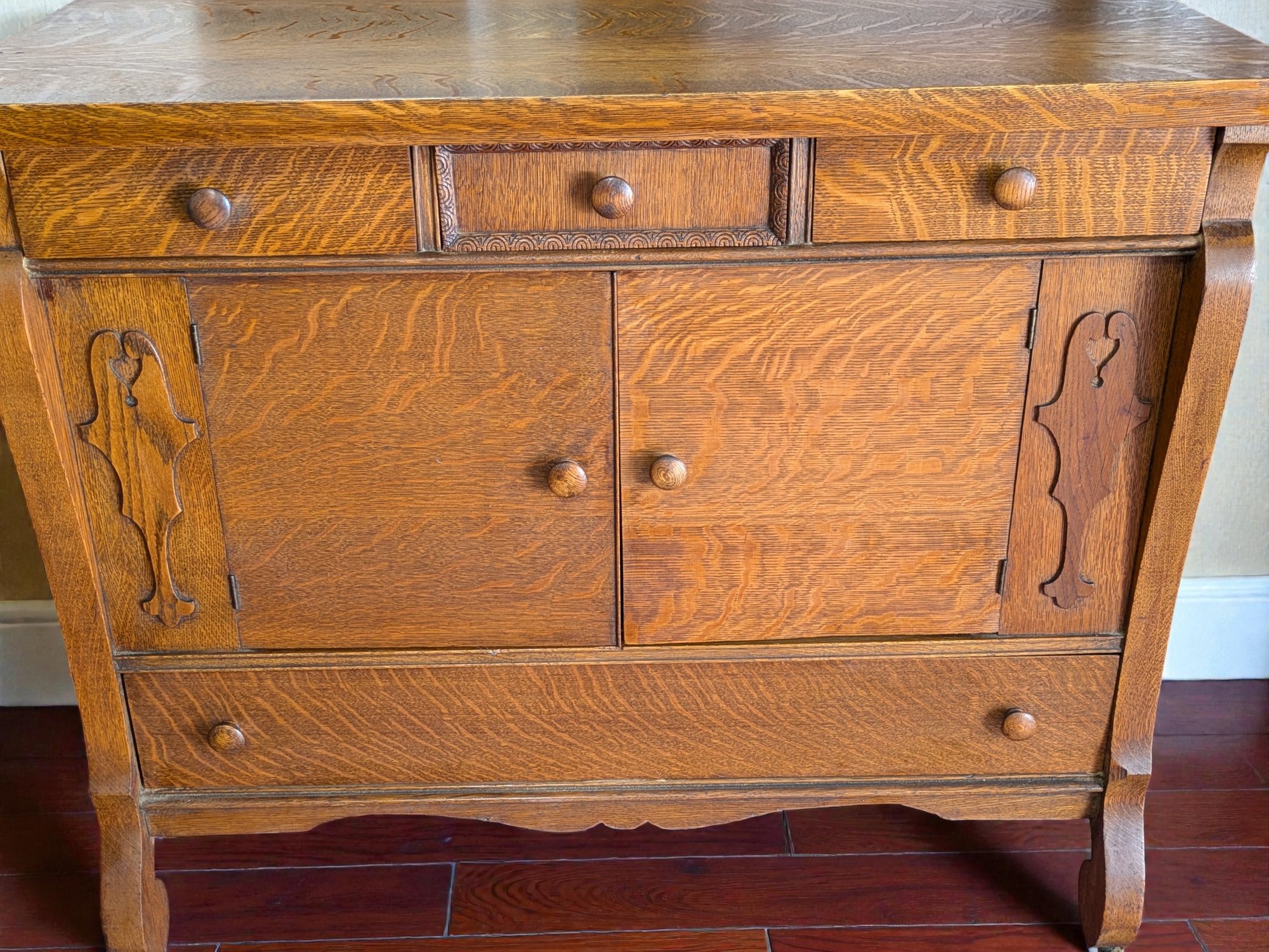 Beautiful detail and design, characterized by its prominent wood grain, curved scrolling, and a configuration of top drawers above a main cabinet space, and castors for mobility. Features wood knobs, a two-door central cabinet flanked by carved decorative panels, three drawers, and a drawer below. Marks and Wear, Consistent with age, movement,t and use. Some warping on the interior shelf (can be reconstructed), inside of drawers show wear and light warpage, consistent with age. Please see all photos as part of the description and condition. 46"W x 39.5"H x 20"D