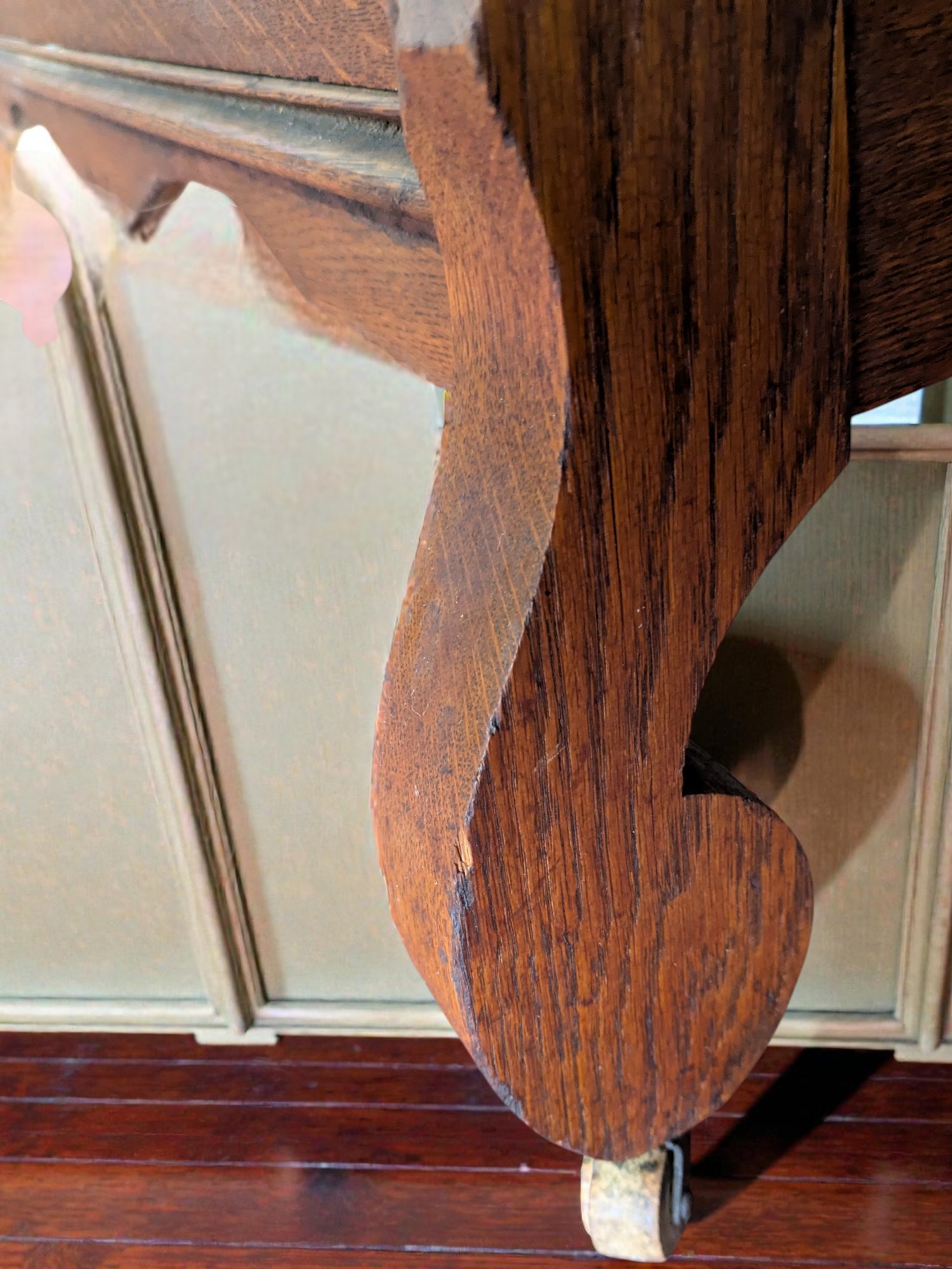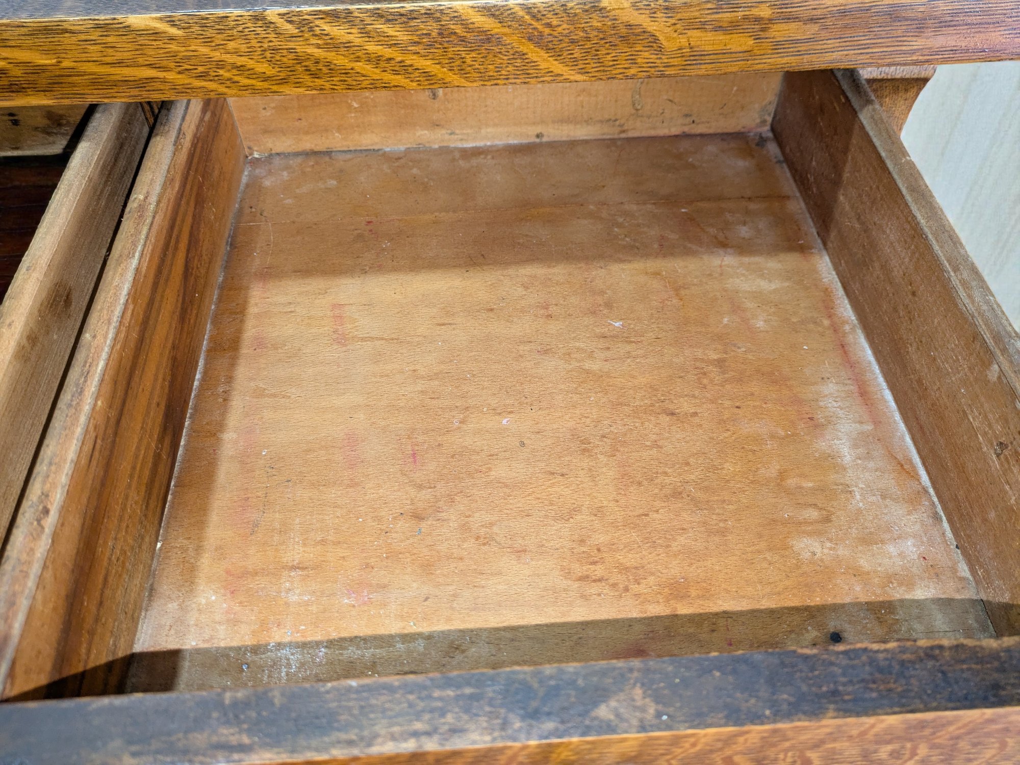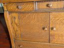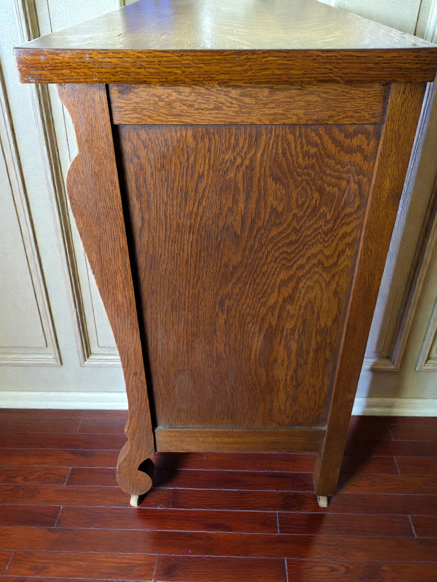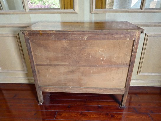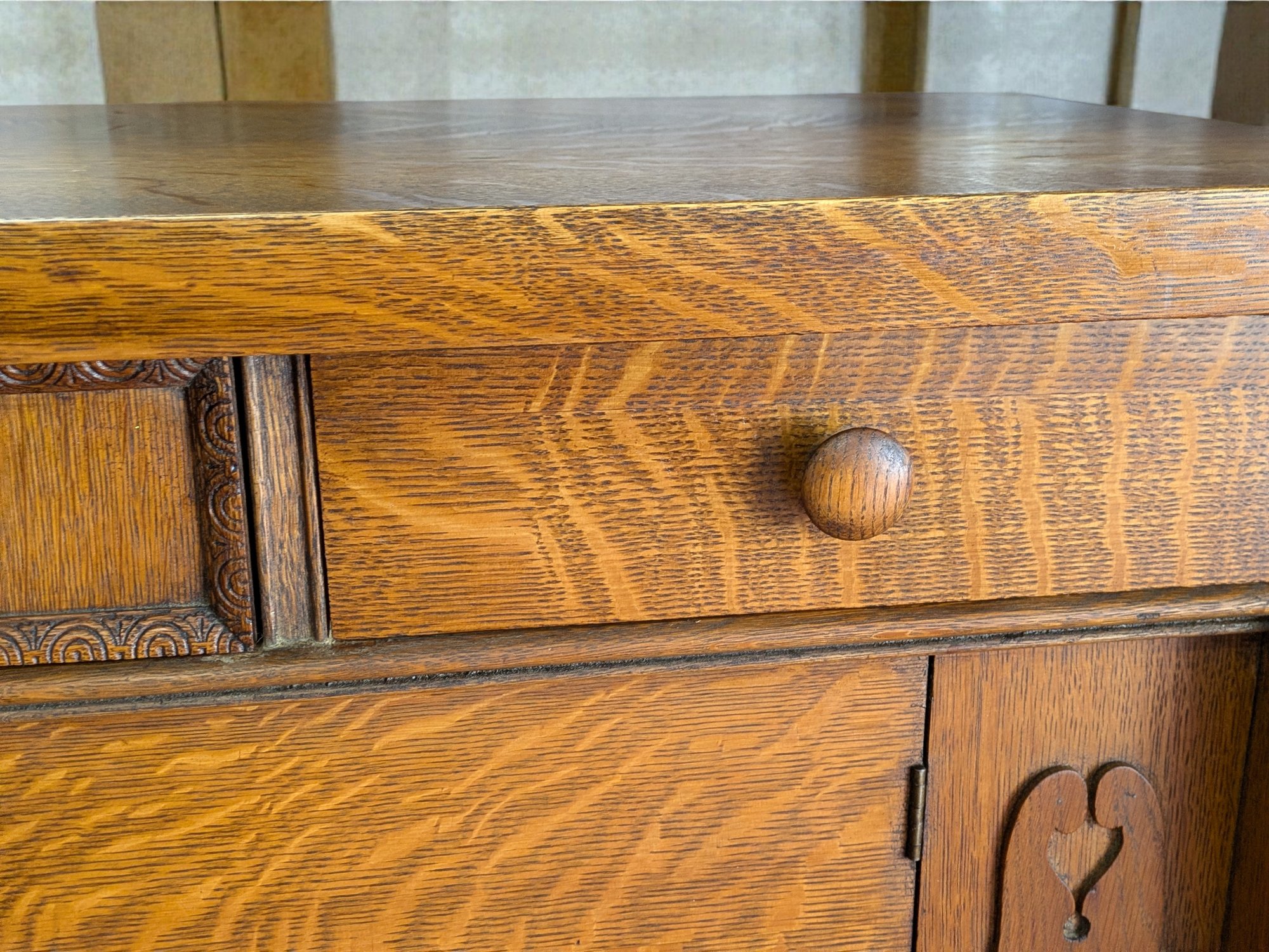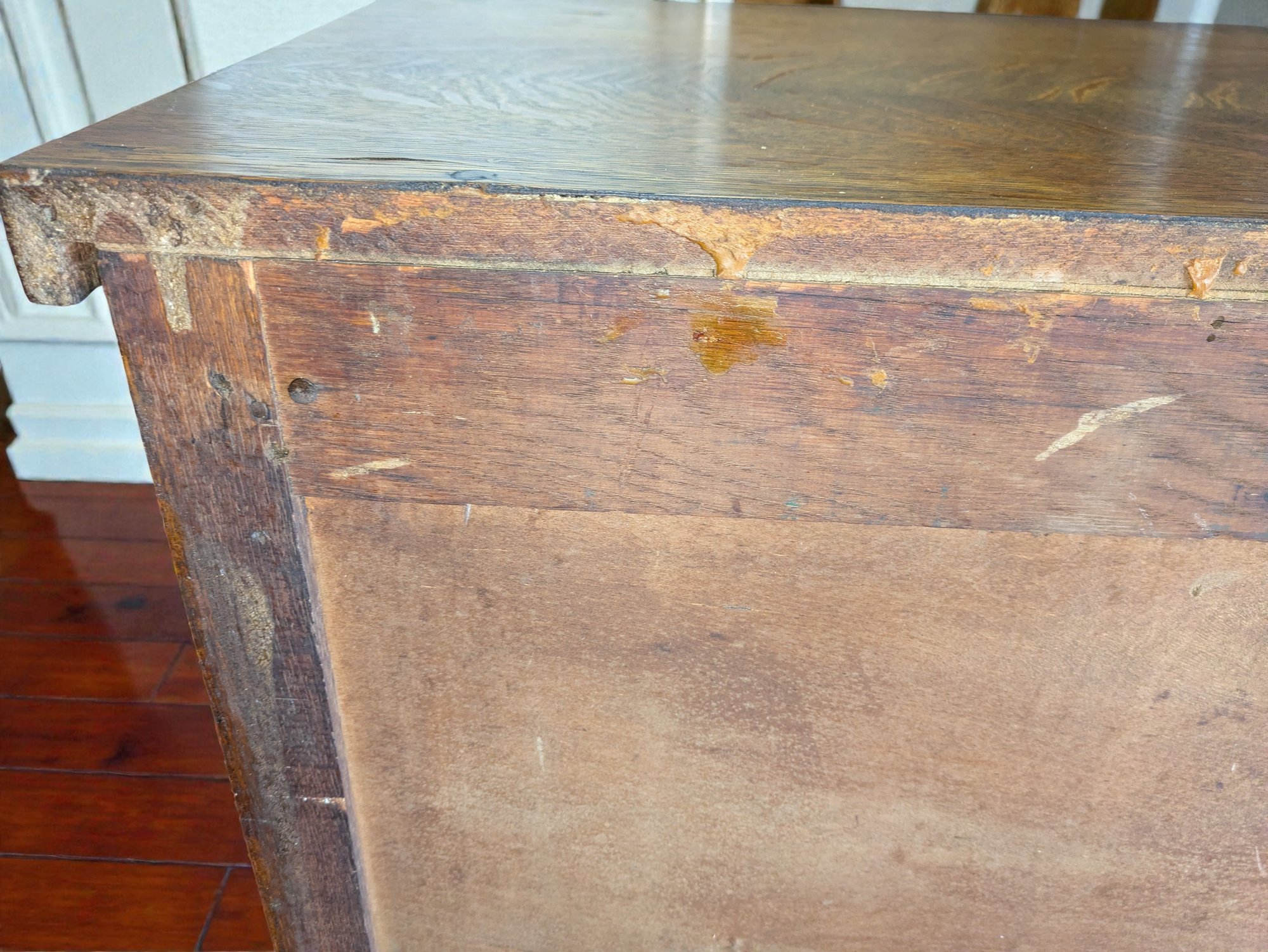 Beautiful detail and design, characterized by its prominent wood grain, curved scrolling, and a configuration of top drawers above a main cabinet space, and castors for mobility. Features wood knobs, a two-door central cabinet flanked by carved decorative panels, three drawers, and a drawer below. Marks and Wear, Consistent with age, movement,t and use. Some warping on the interior shelf (can be reconstructed), inside of drawers show wear and light warpage, consistent with age. Please see all photos as part of the description and condition. 46"W x 39.5"H x 20"D