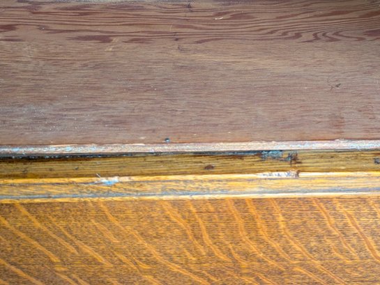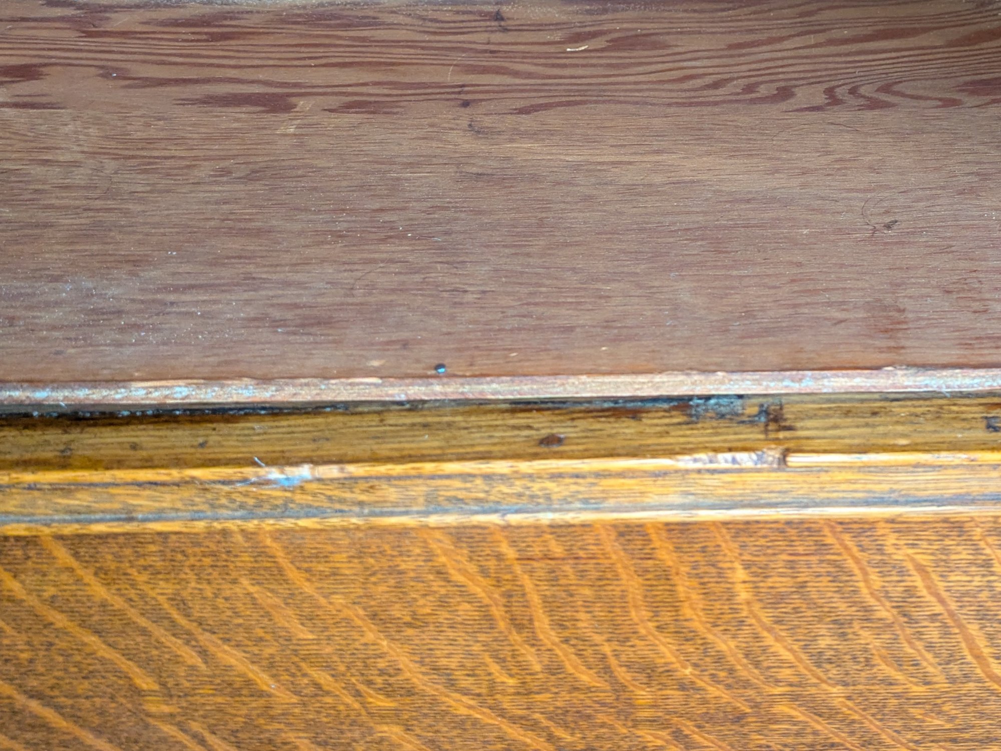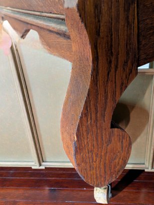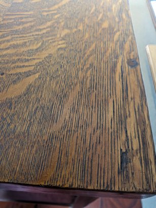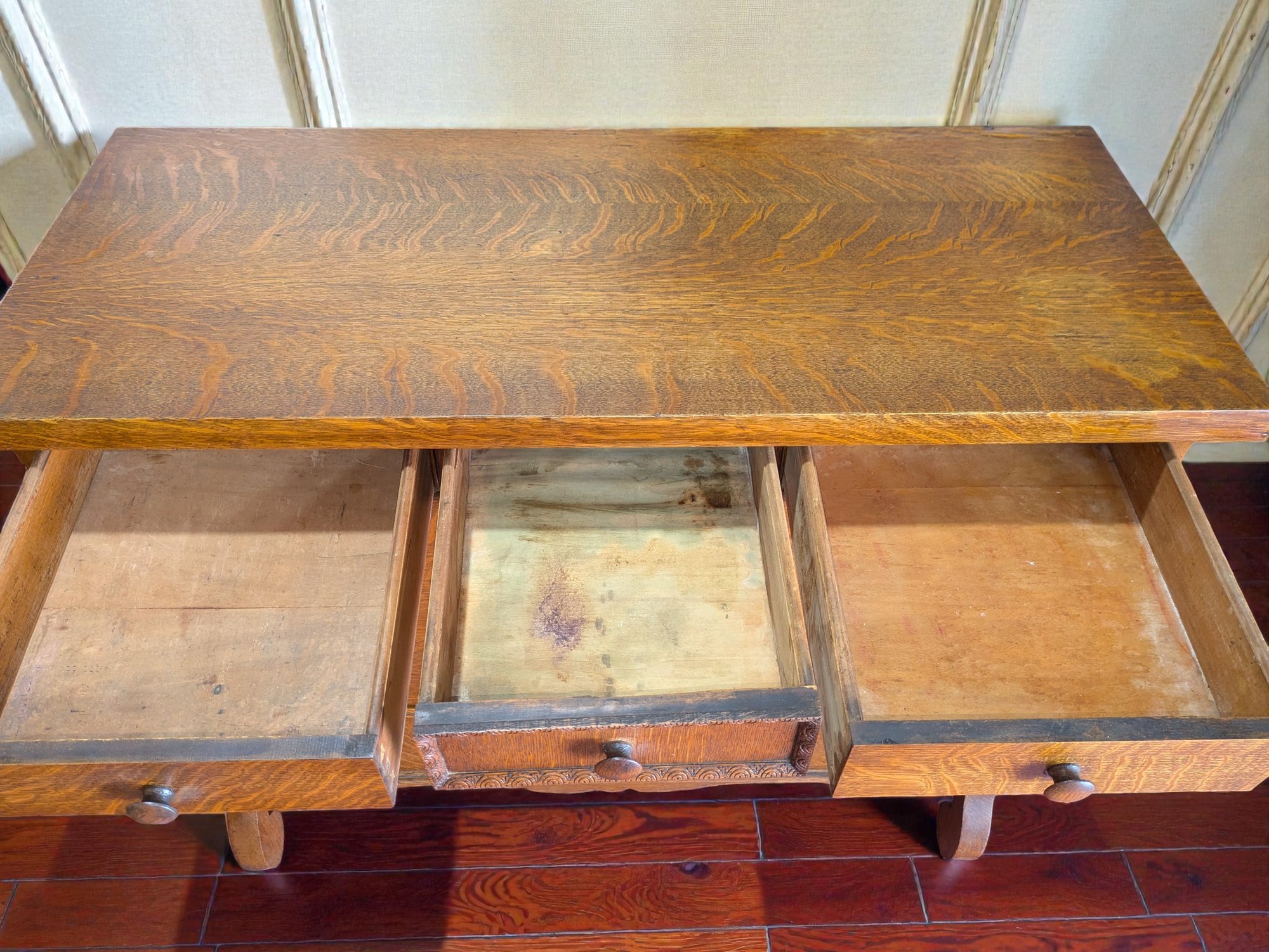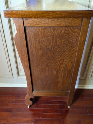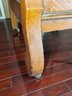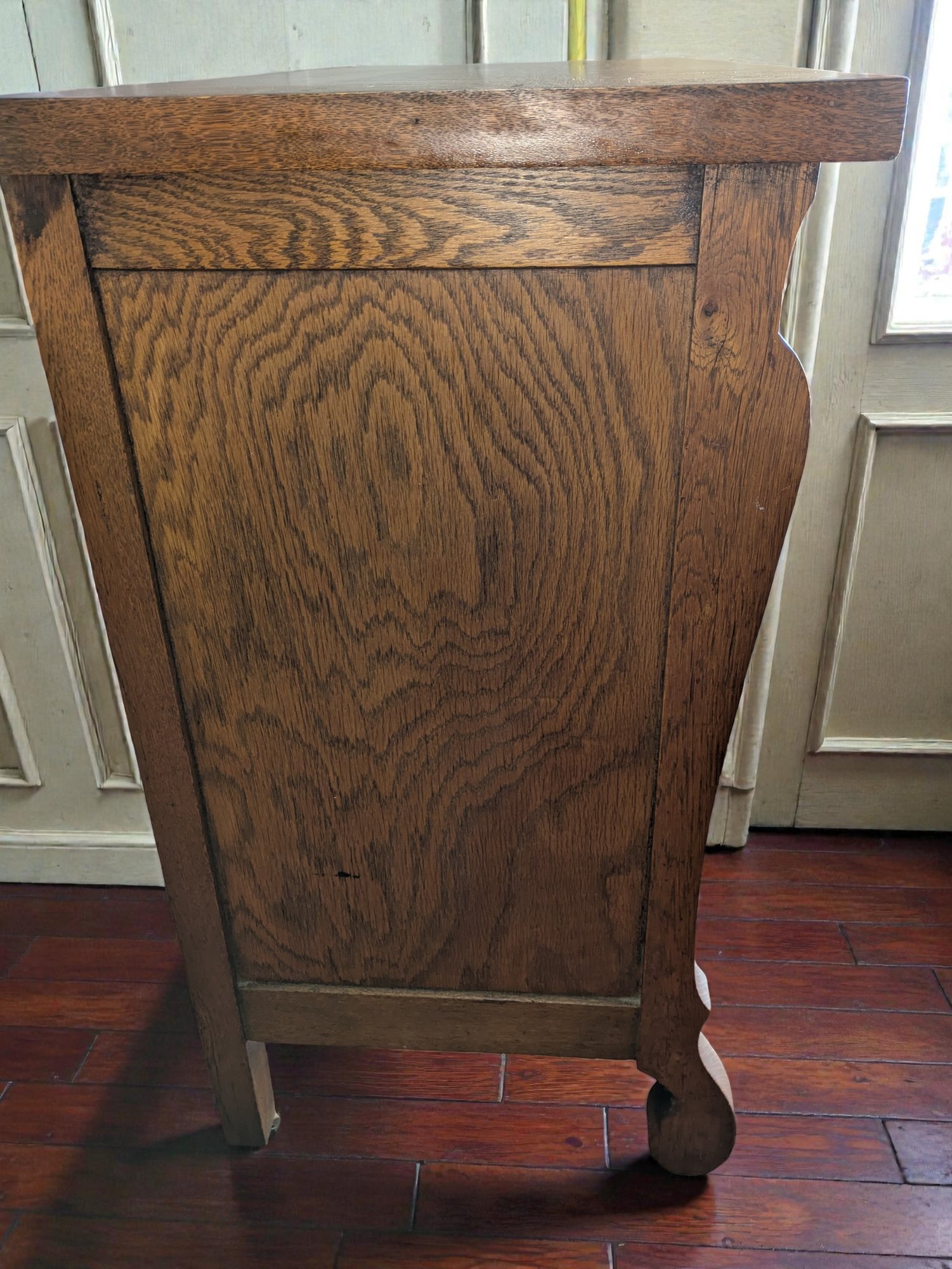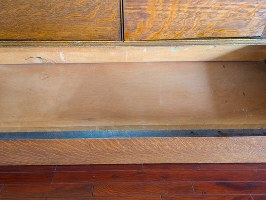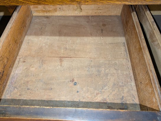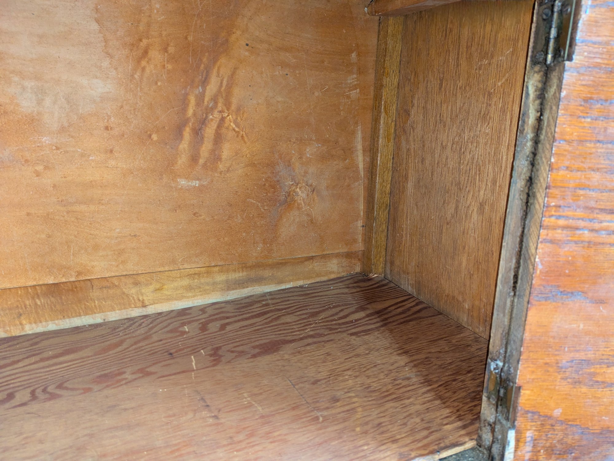 Beautiful detail and design, characterized by its prominent wood grain, curved scrolling, and a configuration of top drawers above a main cabinet space, and castors for mobility. Features wood knobs, a two-door central cabinet flanked by carved decorative panels, three drawers, and a drawer below. Marks and Wear, Consistent with age, movement,t and use. Some warping on the interior shelf (can be reconstructed), inside of drawers show wear and light warpage, consistent with age. Please see all photos as part of the description and condition. 46"W x 39.5"H x 20"D