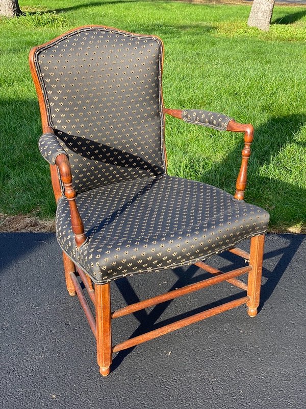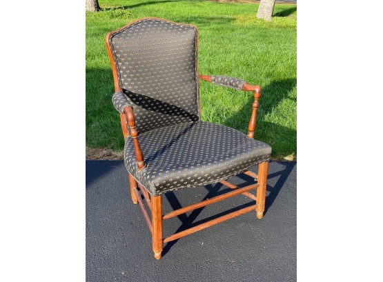 Antique Upholstered Walnut Arm Chair with a curved back and turned arms. The newer upholstery was very well done in black with gold tulips. The exposed rails the back add a lot of interest to this piece making a great choice for an area where it can be seen from the front and the rear. 34h x 25w x 21d