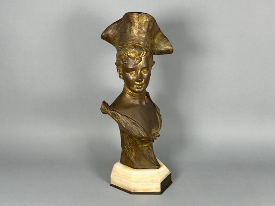 Antique Van Der Straeton Bronze Bust Statue On Marble Base of a woman in a tricorn hat with traces of gilding, inscribed “Societe des Bronzes de Paris” and signed “Von Der Struck”