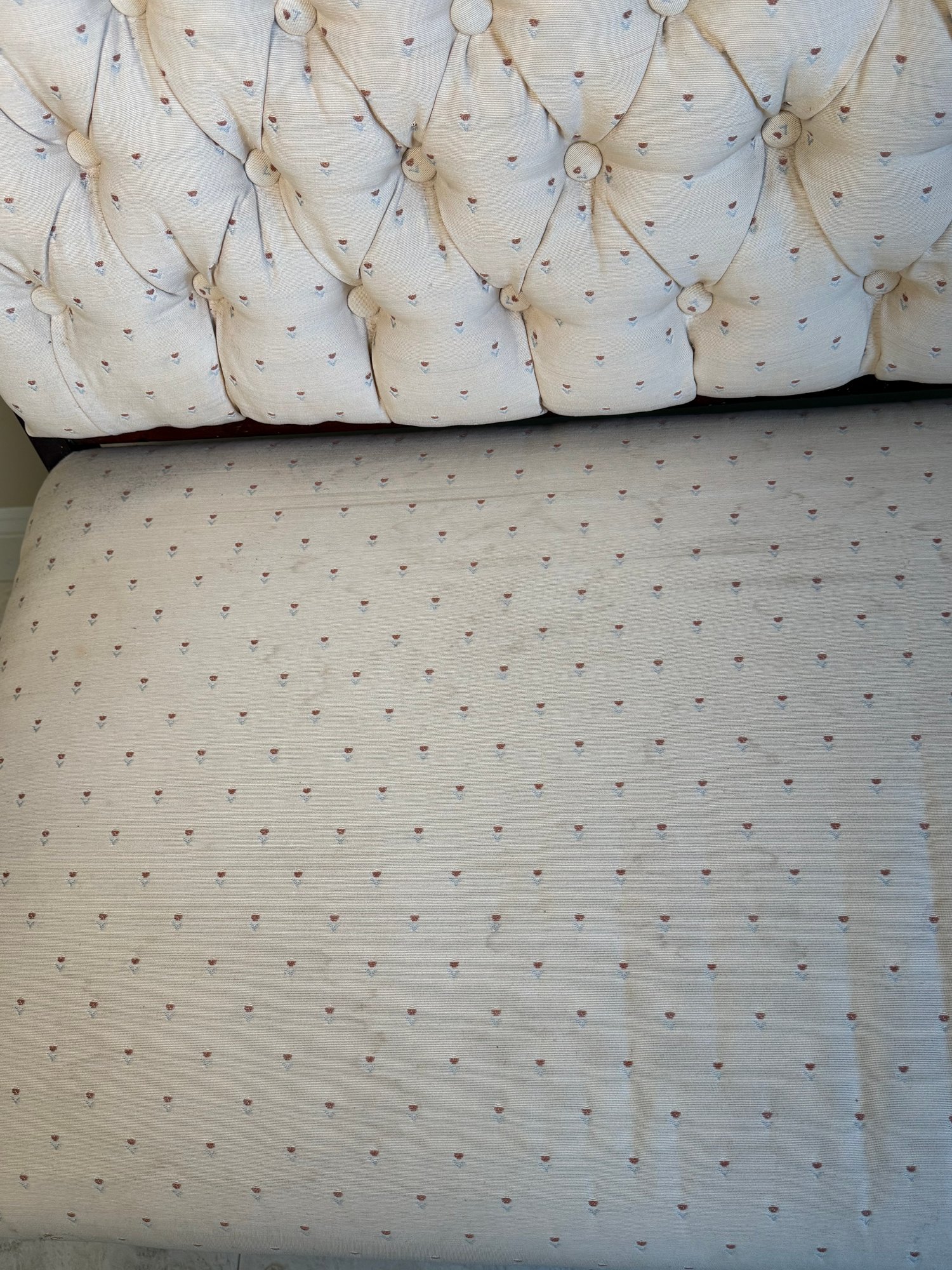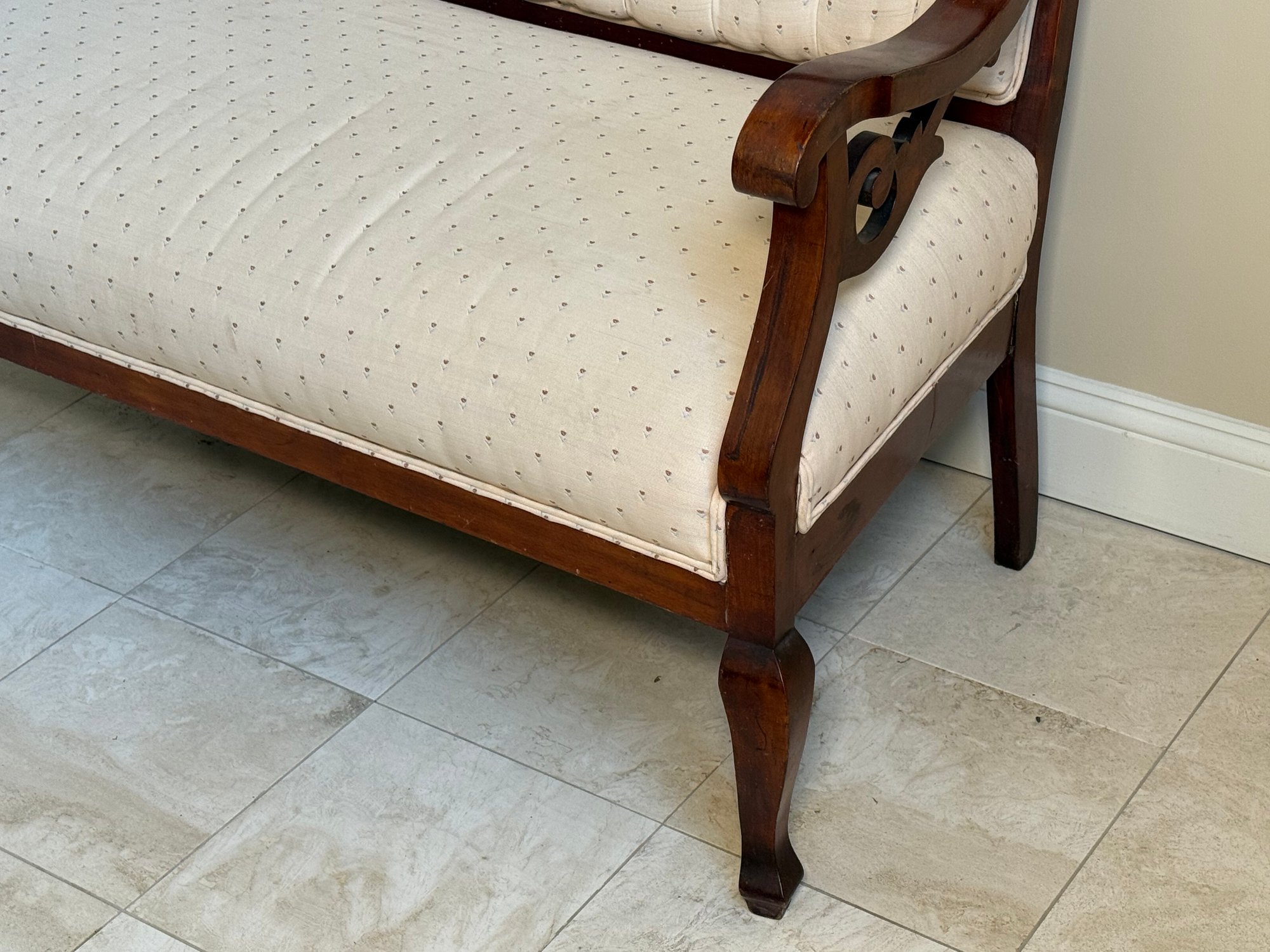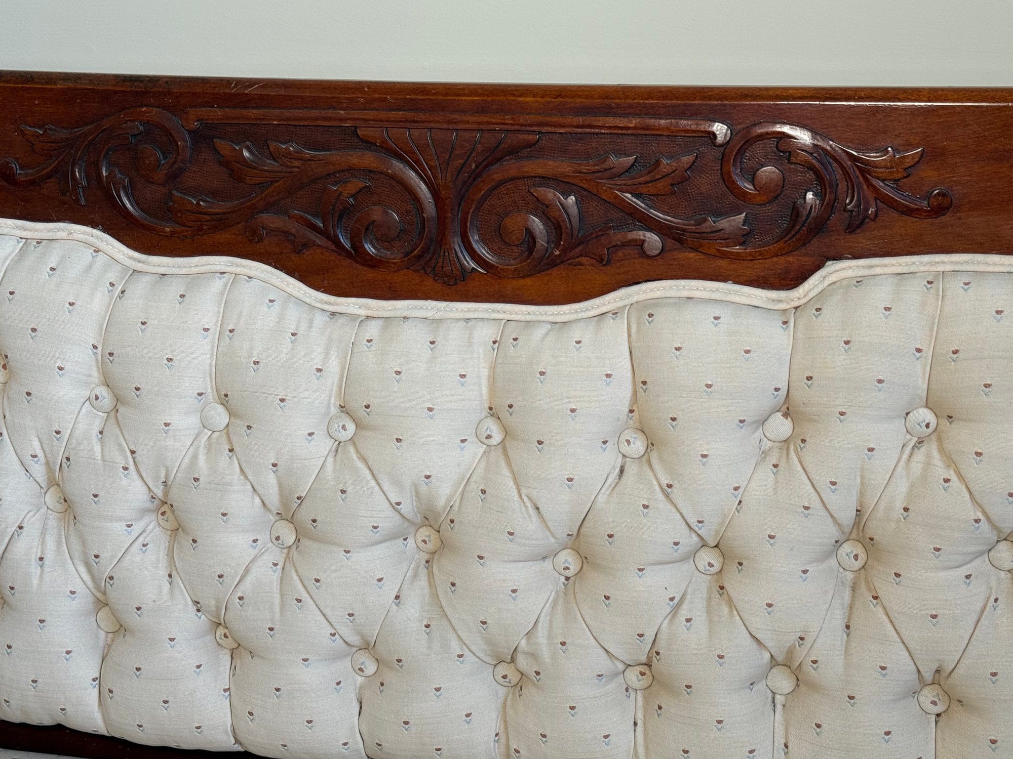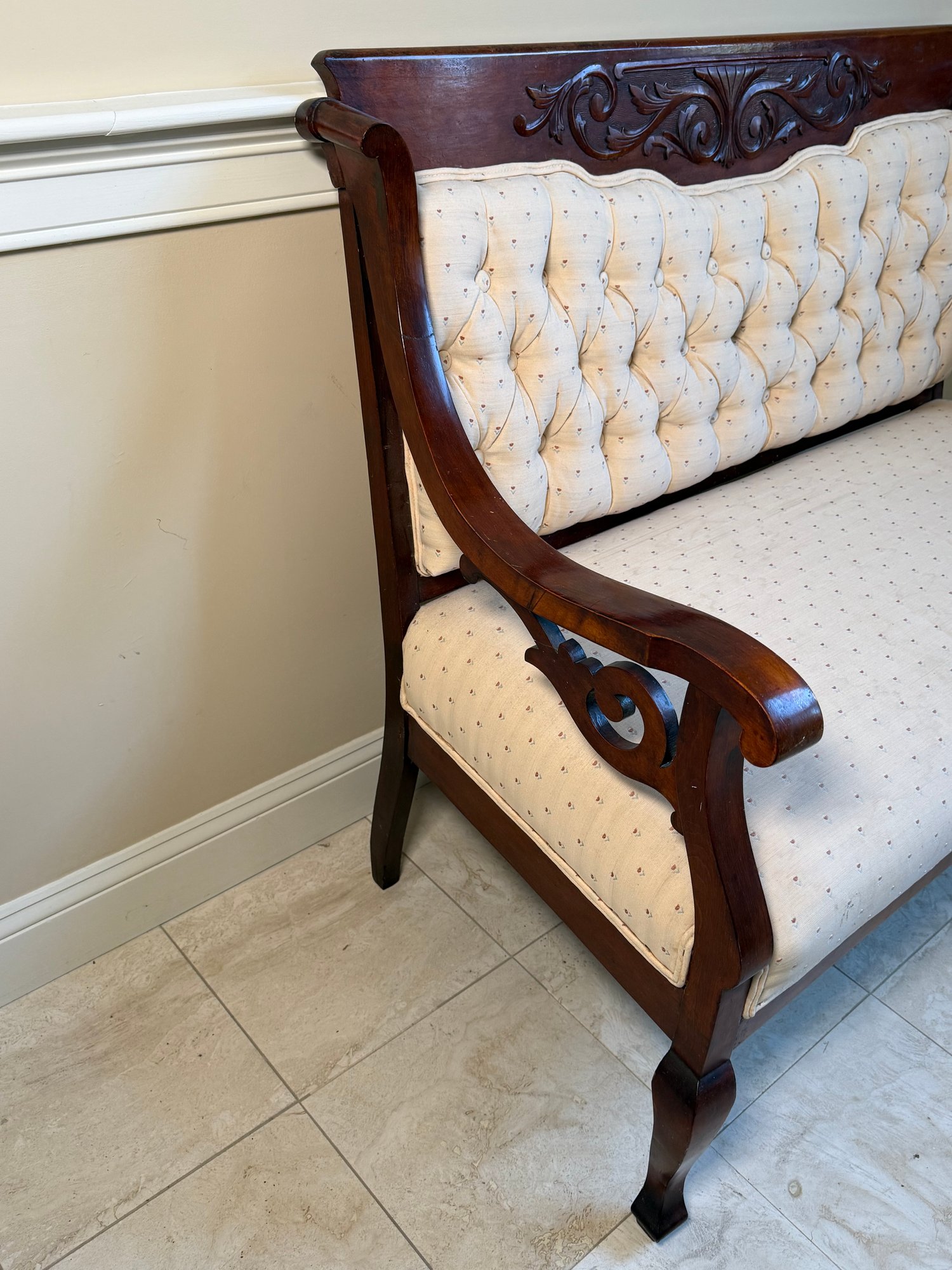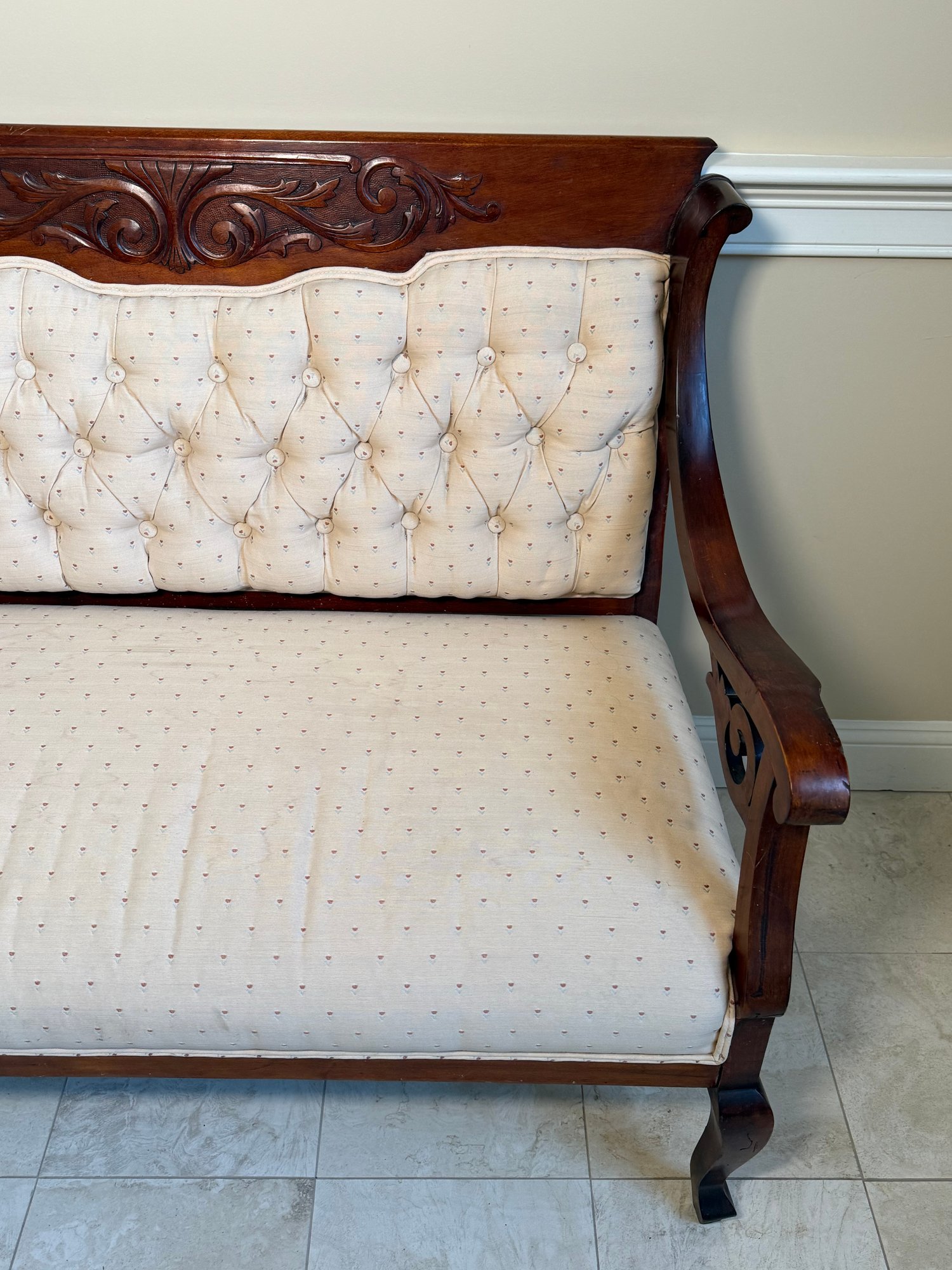 This beautiful antique Victorian settee has a gorgeous carved wood frame with scrolled relief detail. The fabric is a simple cream and floral design.