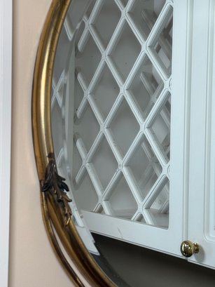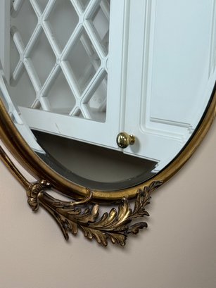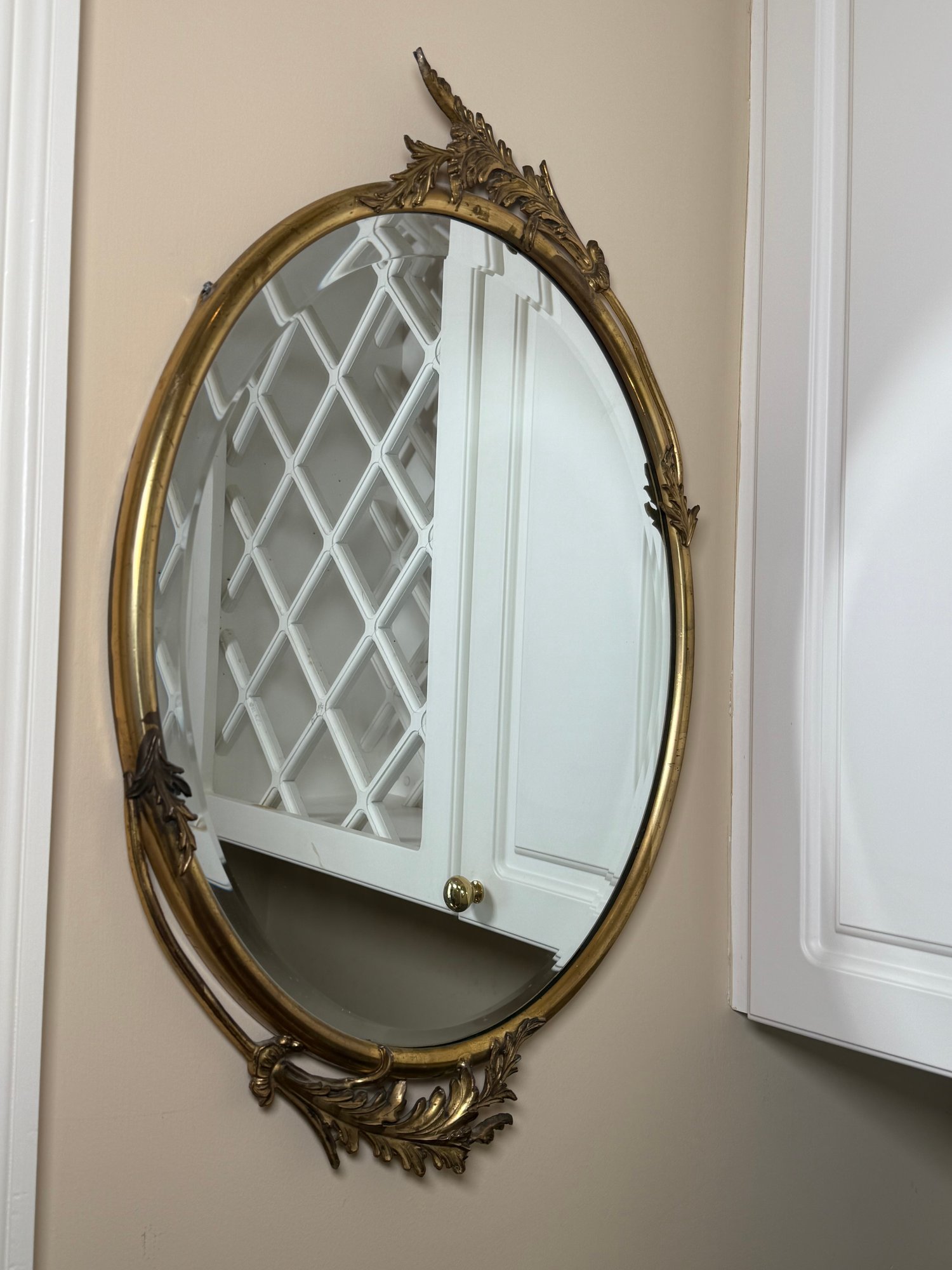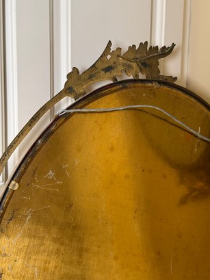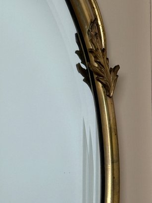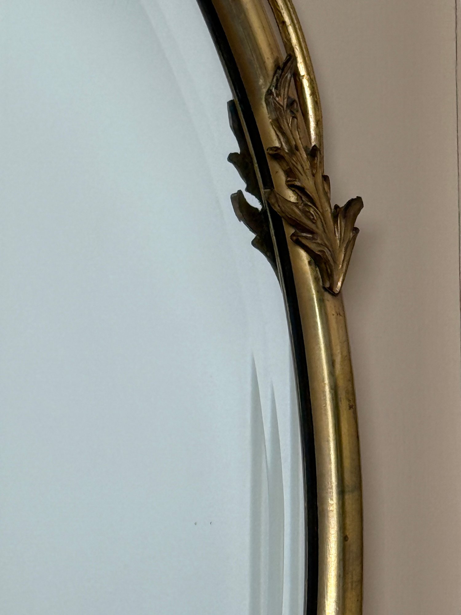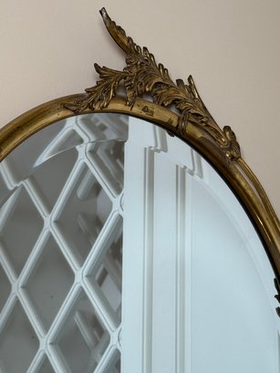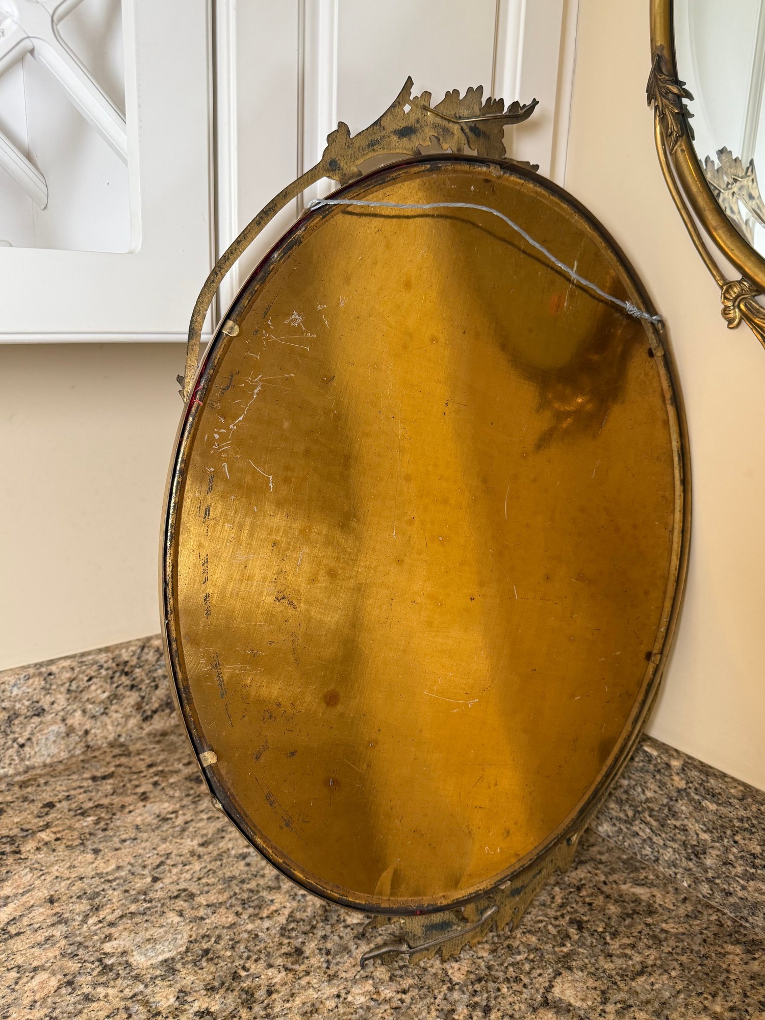 This beautiful antique Victorian mirror is heavy weighted and quality made with gilded floral detail and a metal back. It has a beveled mirror.