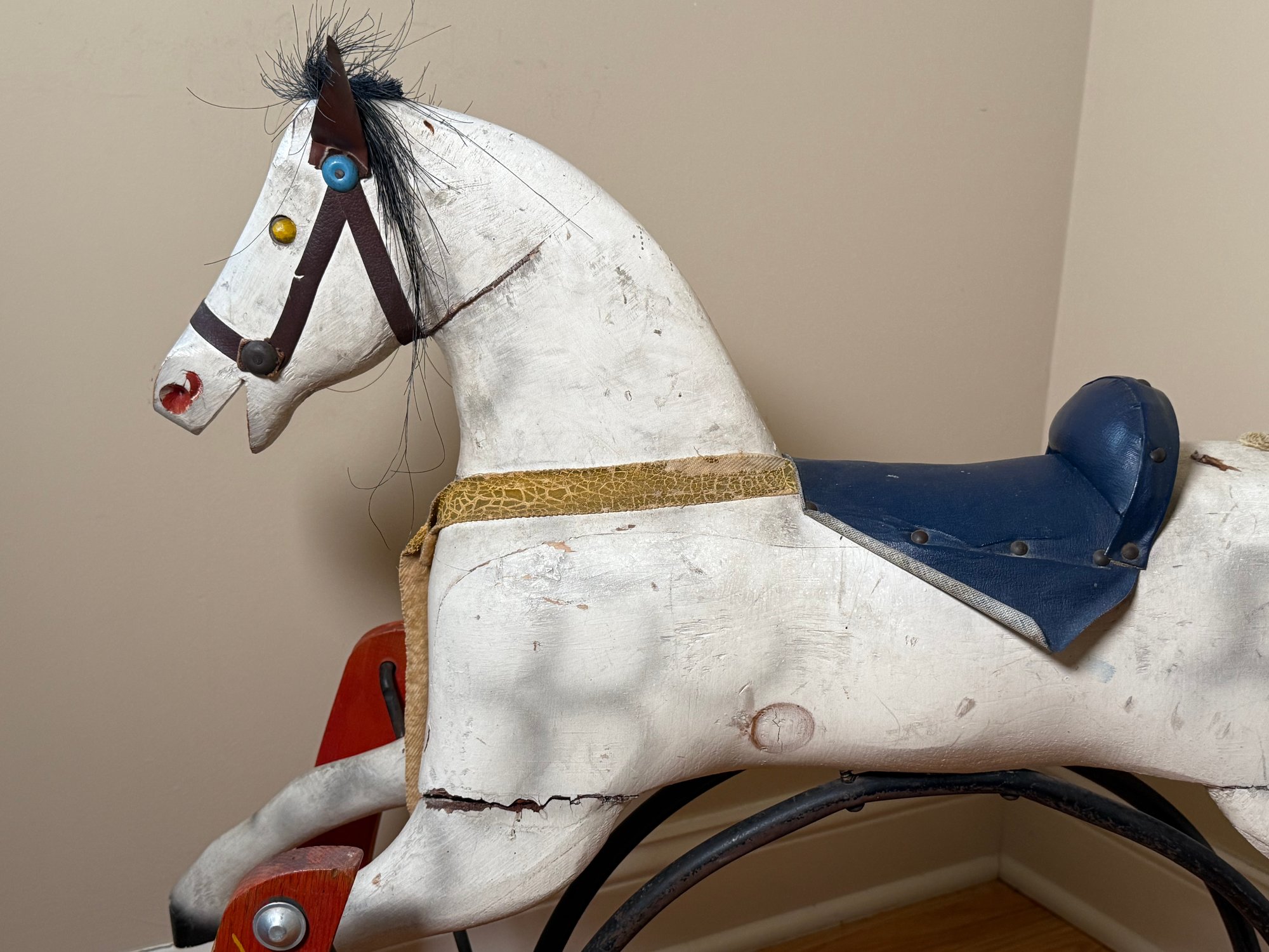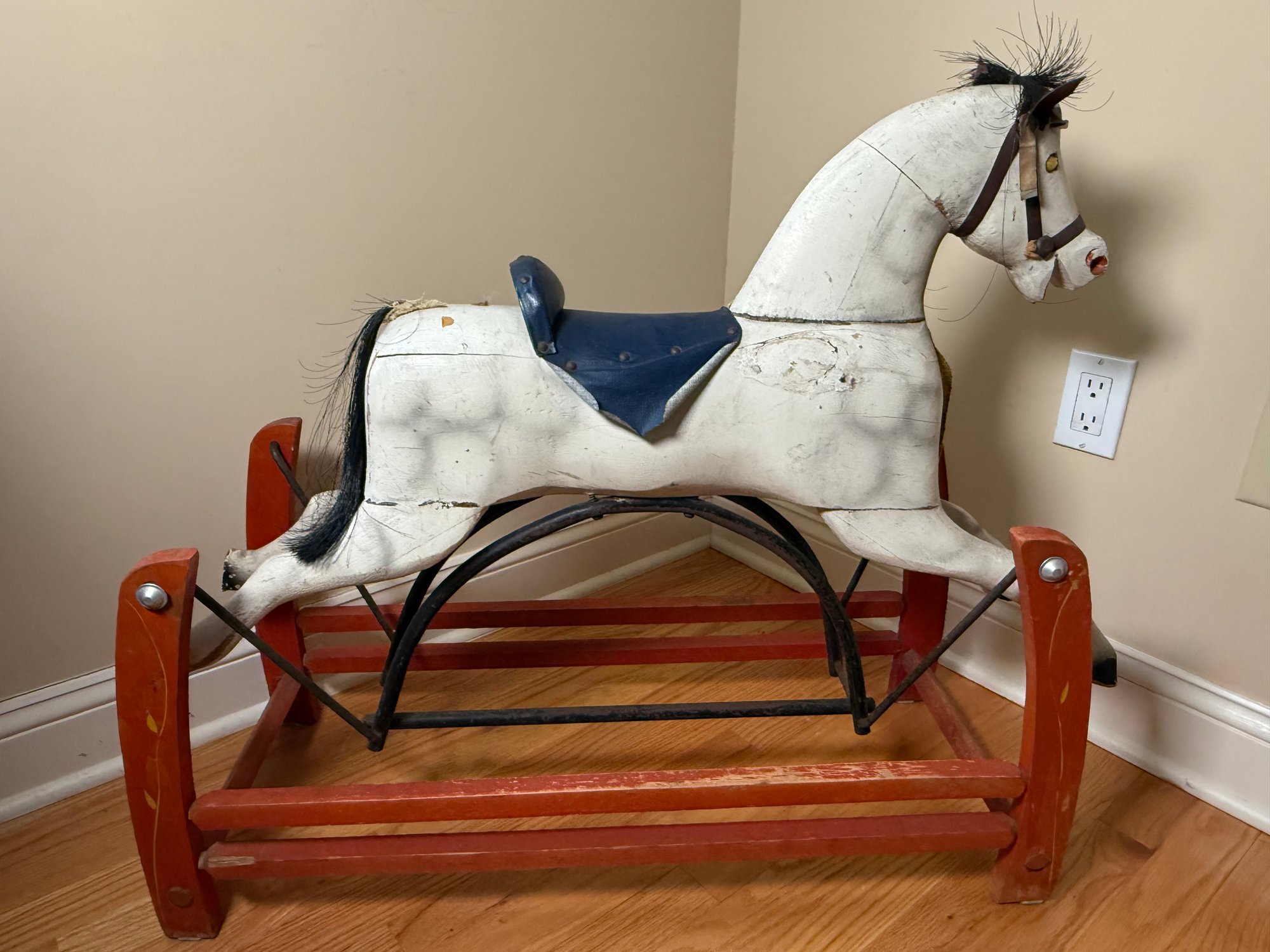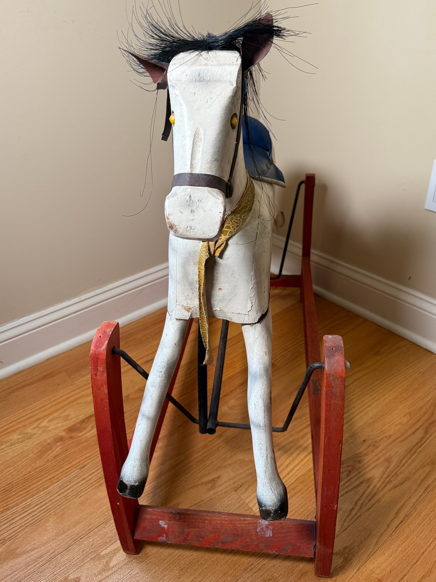 A Hand-carved wooden rocking horse with a gliding base, featuring mane and tail. Made of wood with cast iron and leather straps. This was designed for children to ride, the glider base allows for a smooth, back-and-forth motion. Although now it’s best for display.