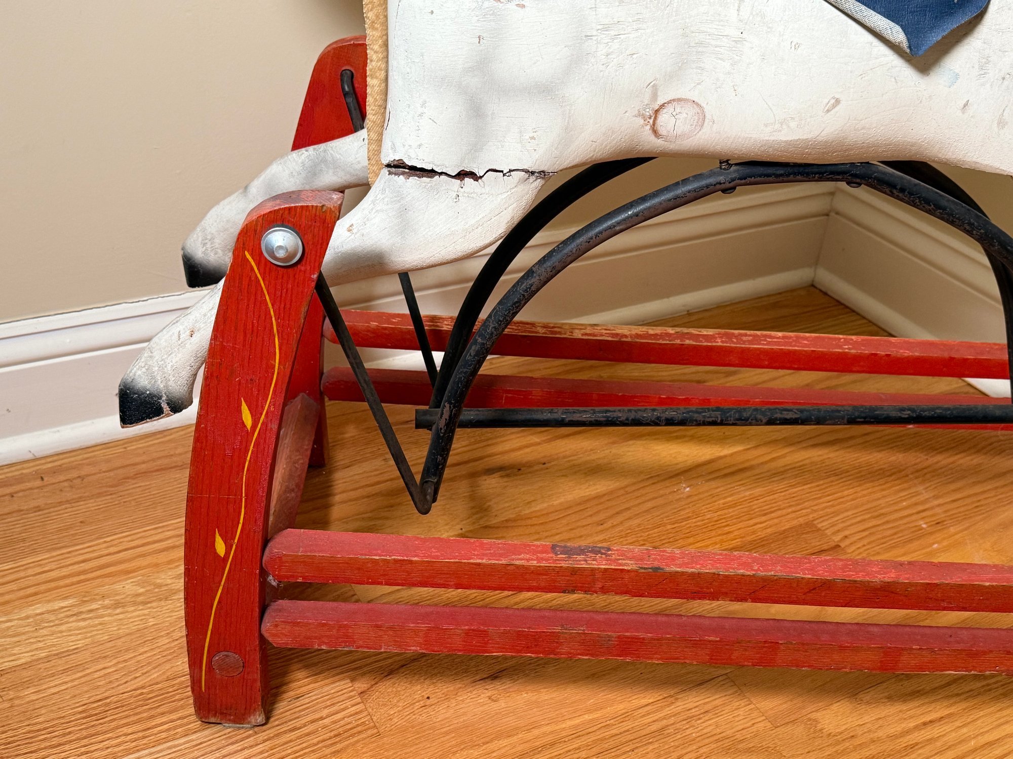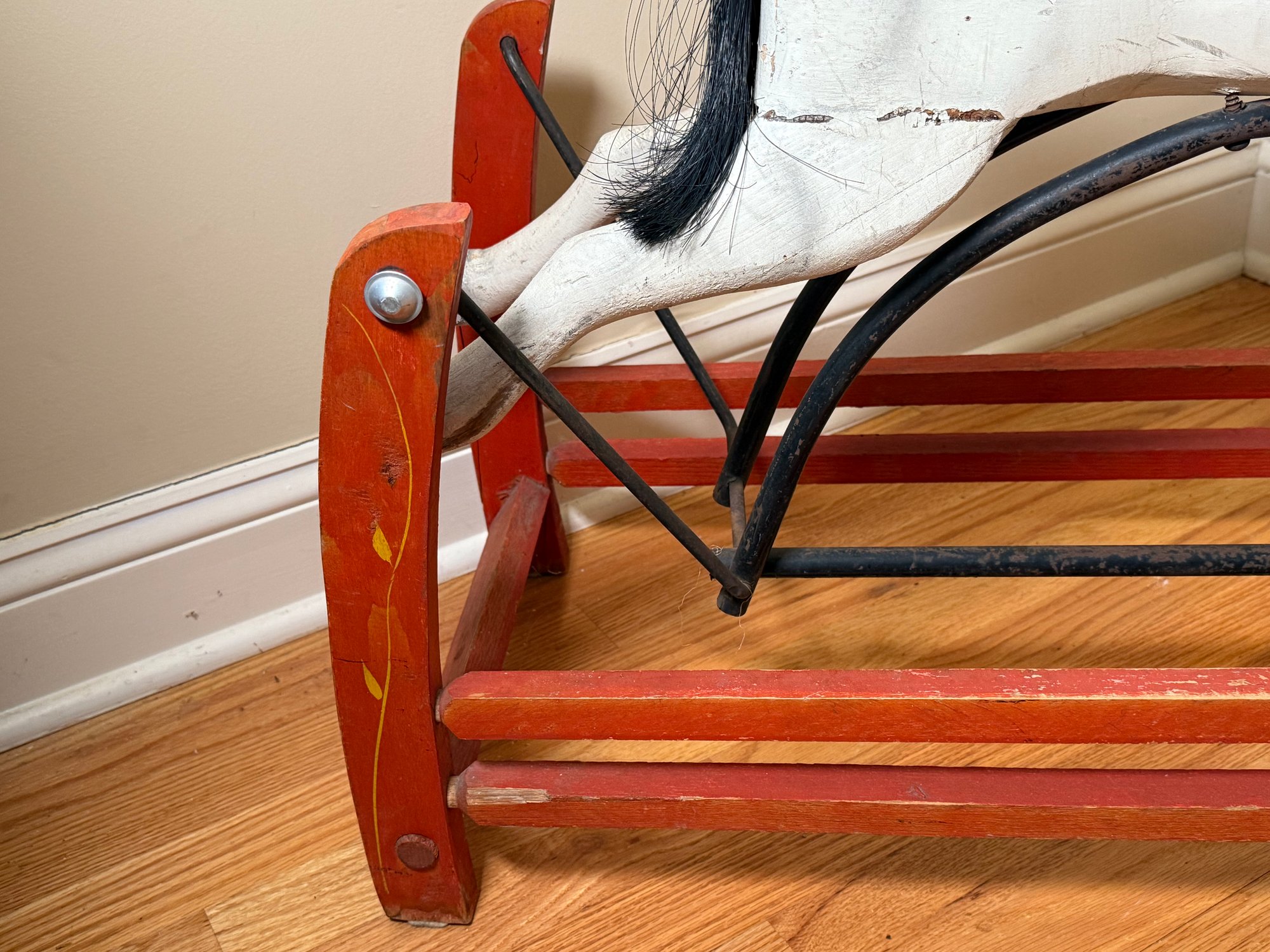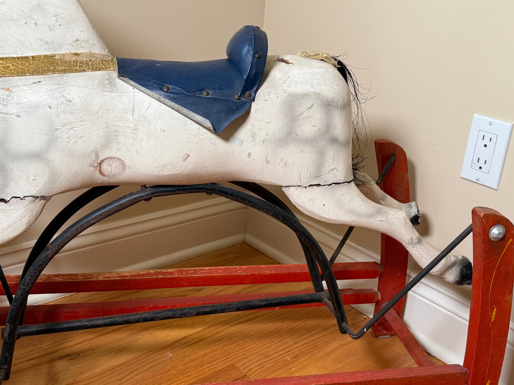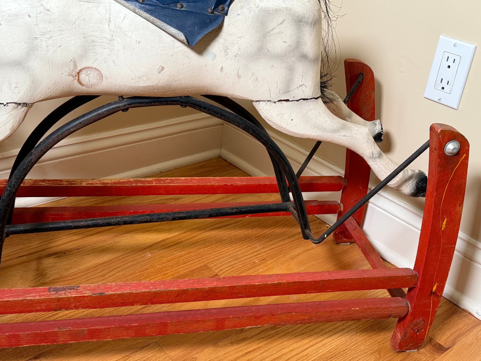 A Hand-carved wooden rocking horse with a gliding base, featuring mane and tail. Made of wood with cast iron and leather straps. This was designed for children to ride, the glider base allows for a smooth, back-and-forth motion. Although now it’s best for display.
