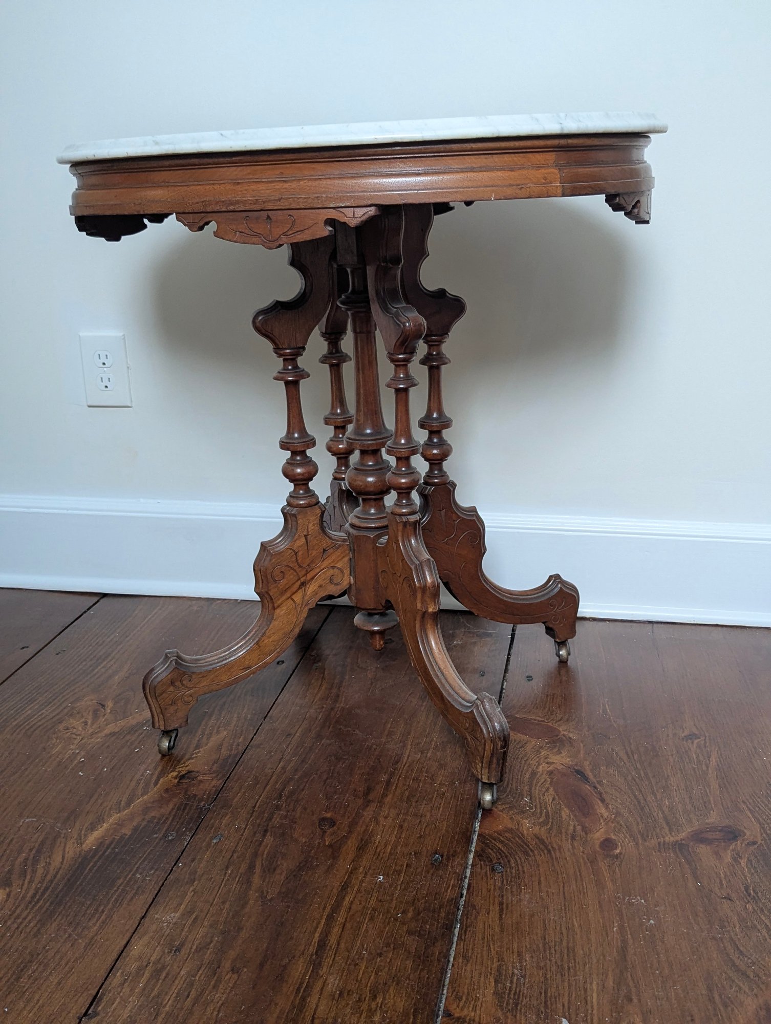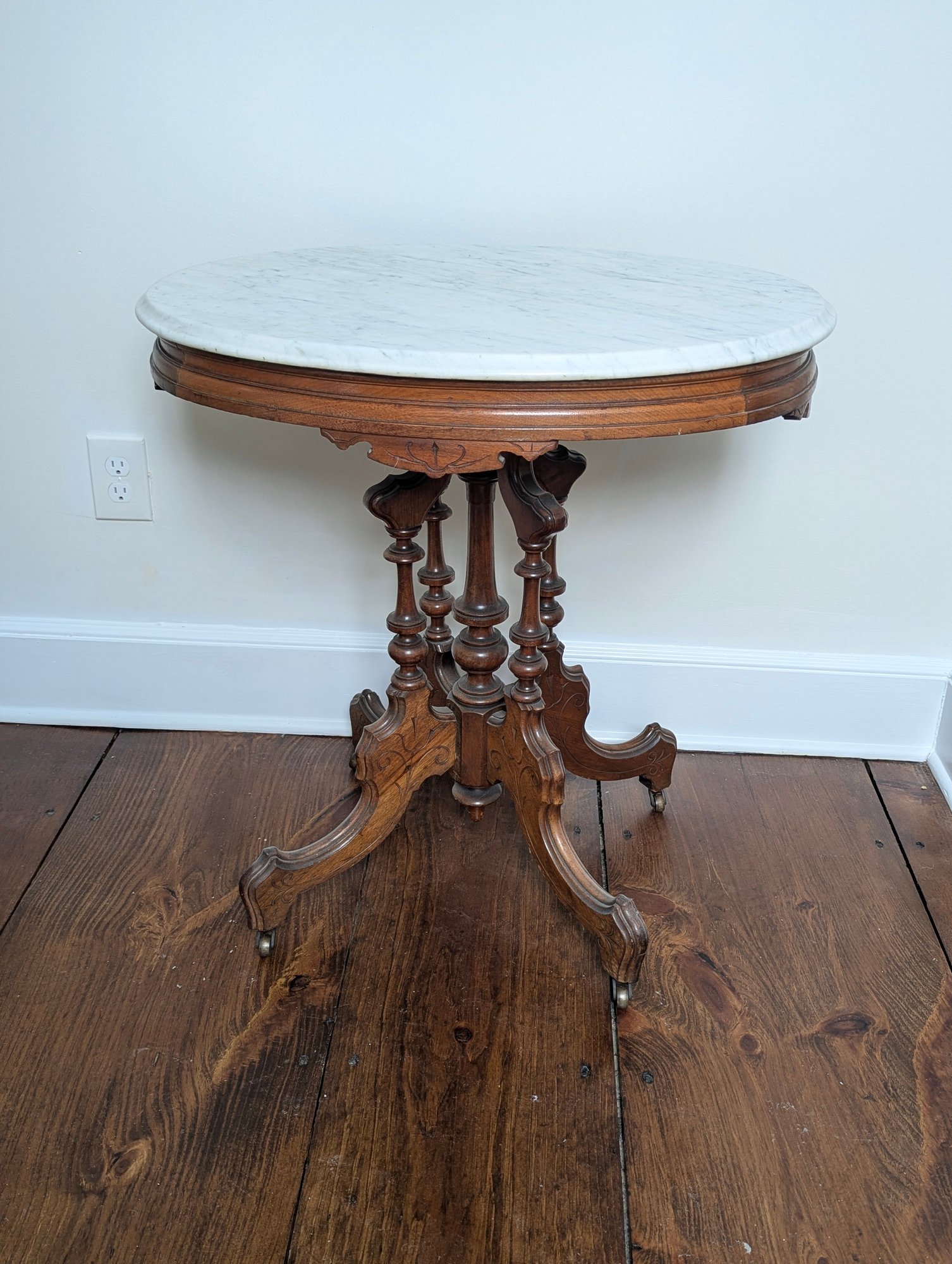 The table includes carved scroll-form legs, four banded column supports, and a central urn-form turned finial. Very Well made.