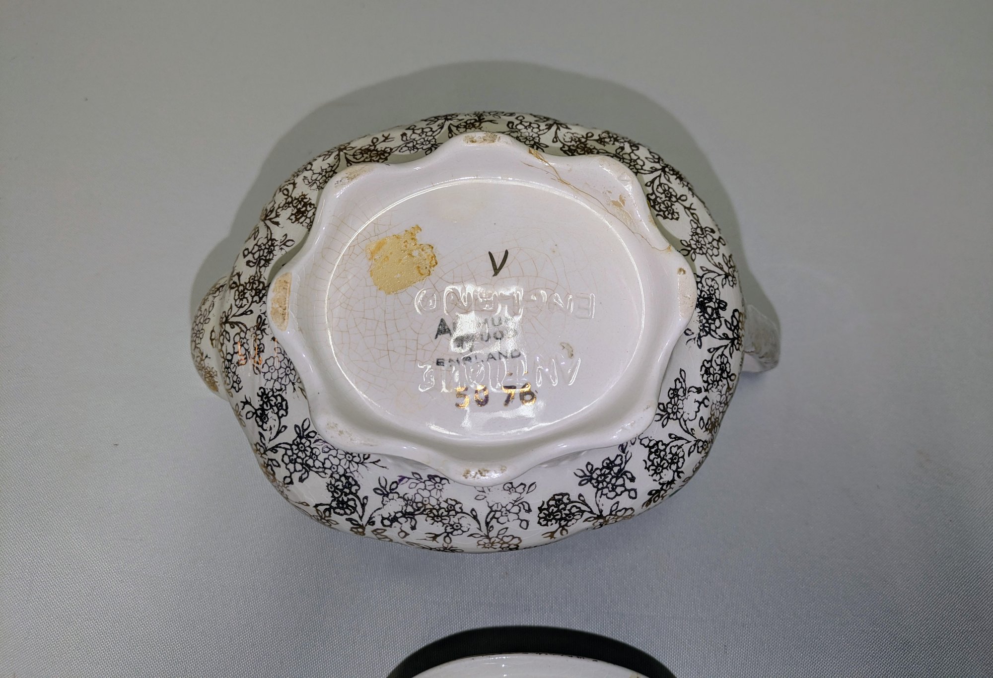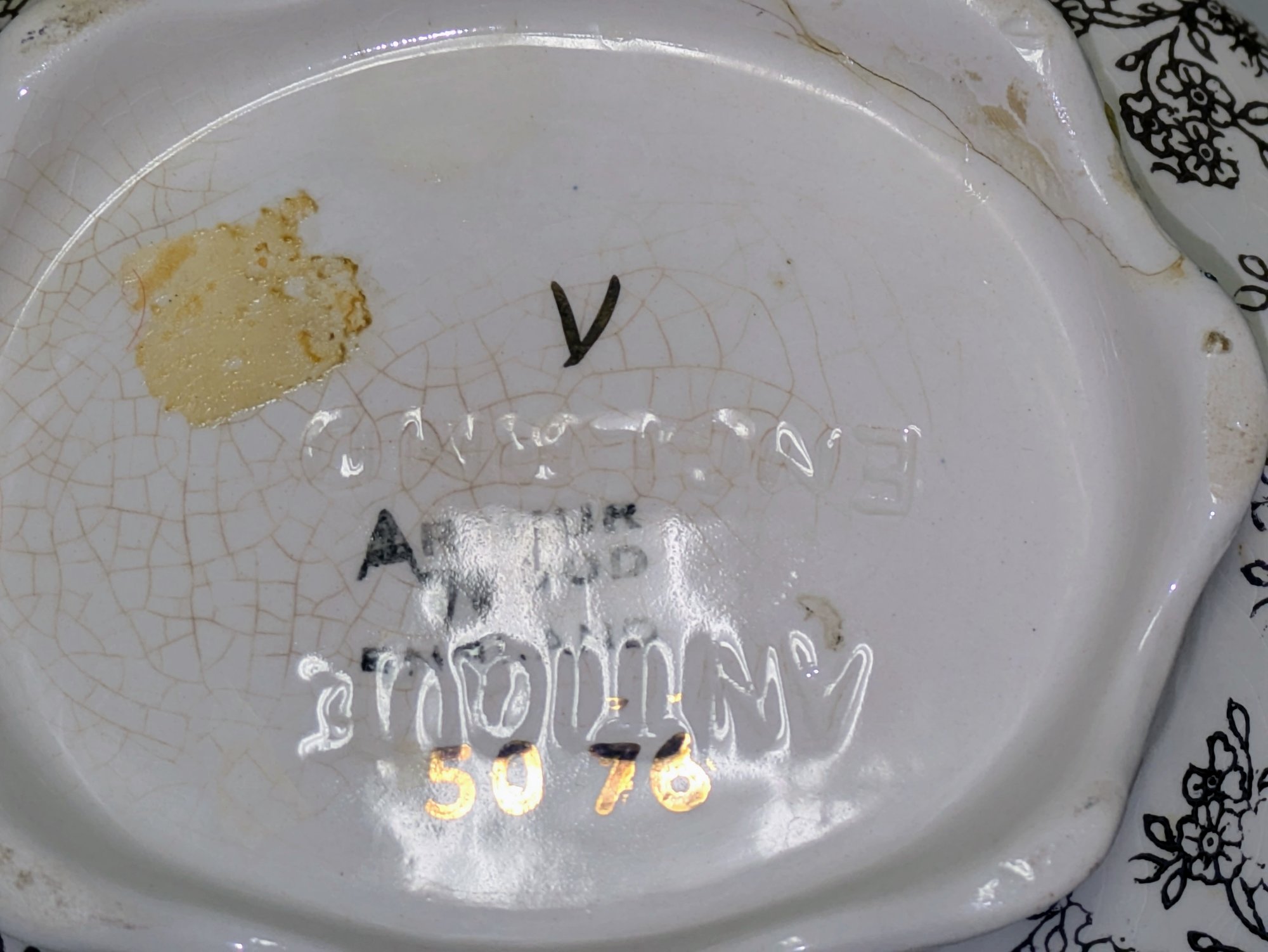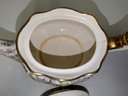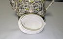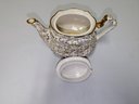 featuring a distinctive all-over gold stamp pattern with small yellow or pink flowers. The body has a scalloped design and sits on small feet. Some natural crazing, a couple of stress cracks on the top inside rim, and discoloration inside. Overall, Very Good Antique/Vintage Condition. Please see all photos as part of the description and condition. 6"H (with lid) x 6" Diam. x 9" (handle to spout)