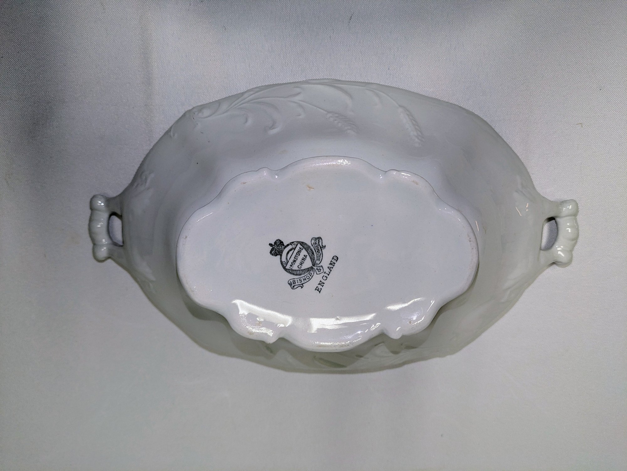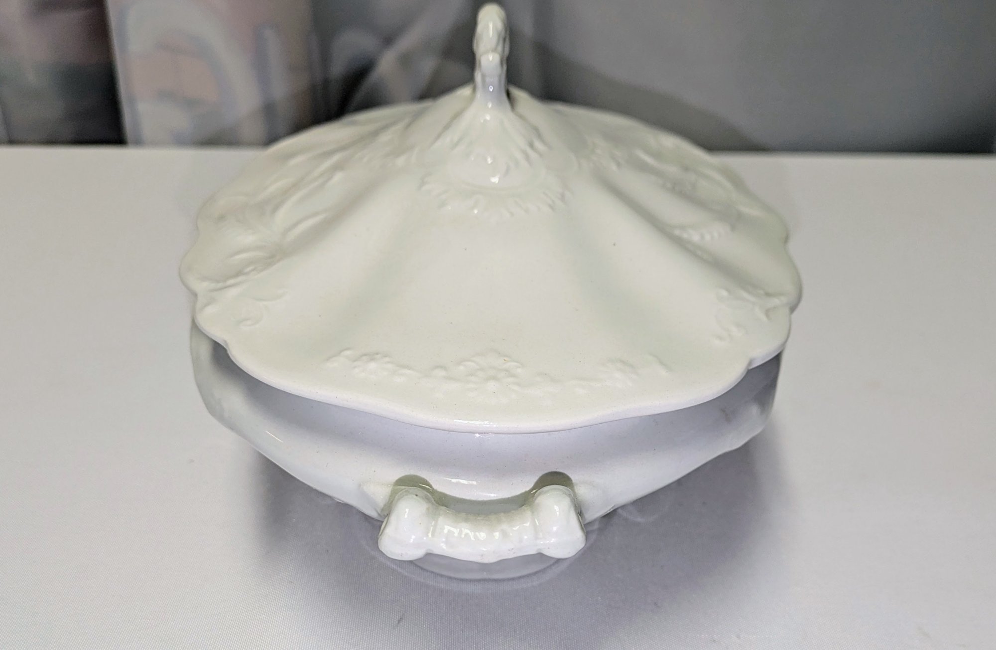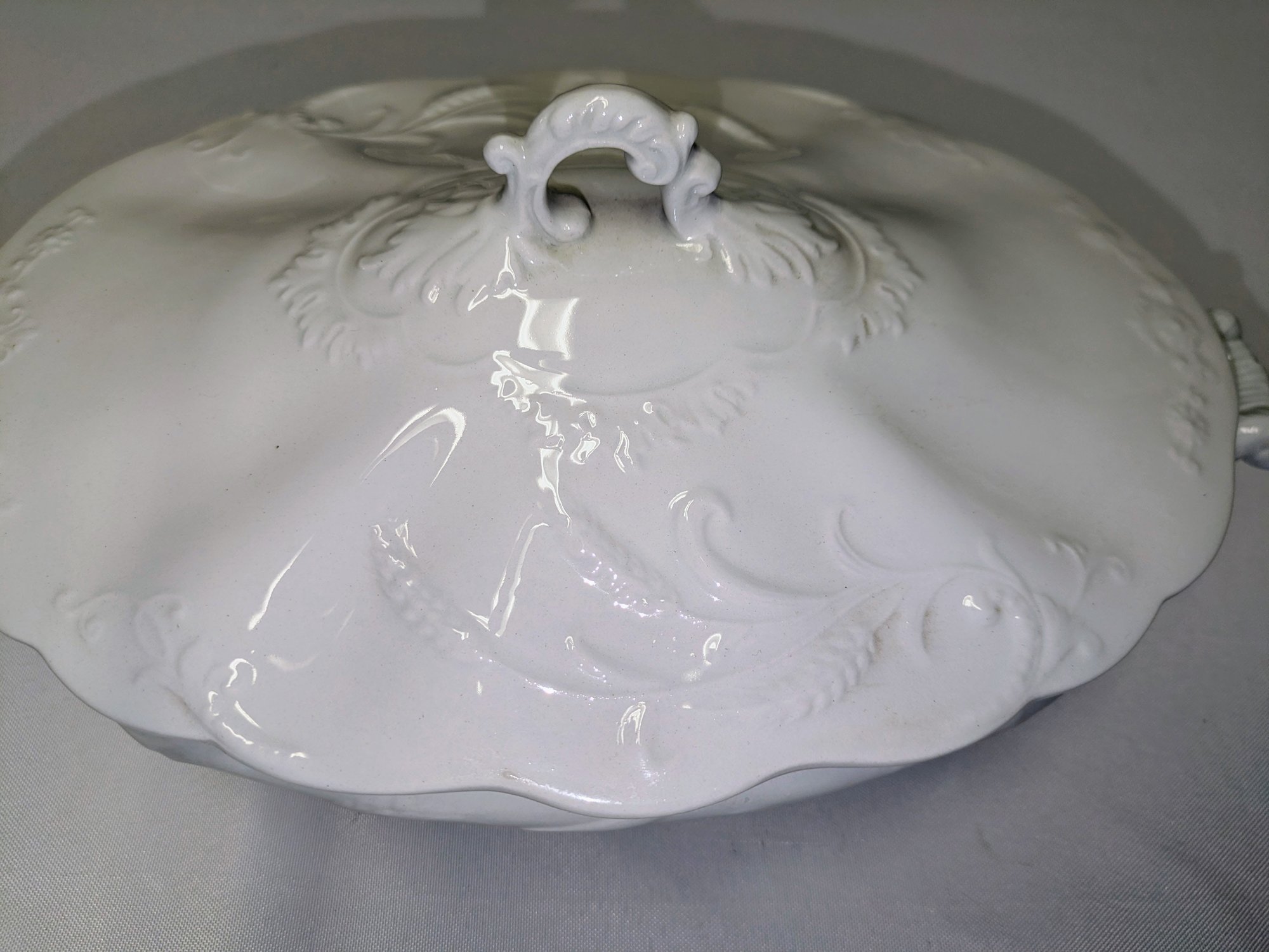 Antique/Vintage Bishop & Stonner, Ironstone, China Covered Oval Serving Bowl. Stunning all-white oval covered serving dish with a raised floral design pattern and two side handles. Some light marks are consistent with age and use. Overall, Excellent/Very Good Antique/Vintage Condition. Please see all photos as part of the description and condition. 6"H (with cover) x 4"H (without cover) x 7.5" x 12.5" (handle to handle)