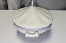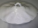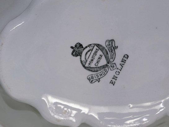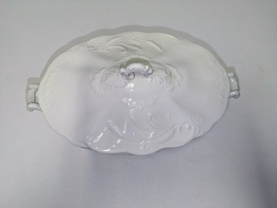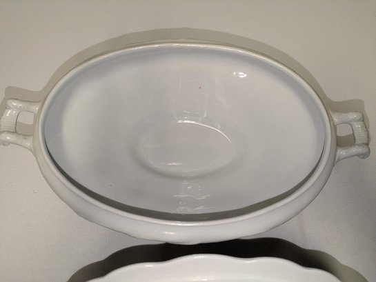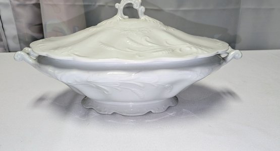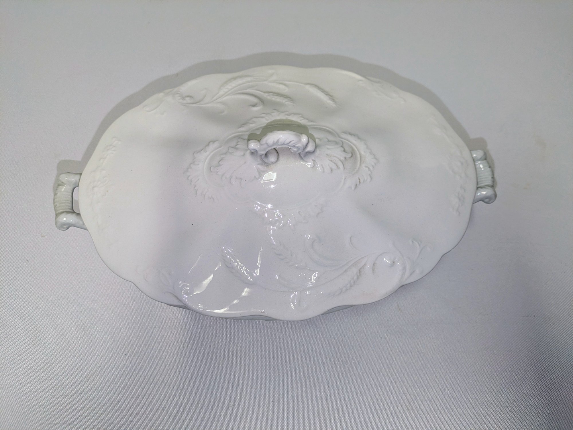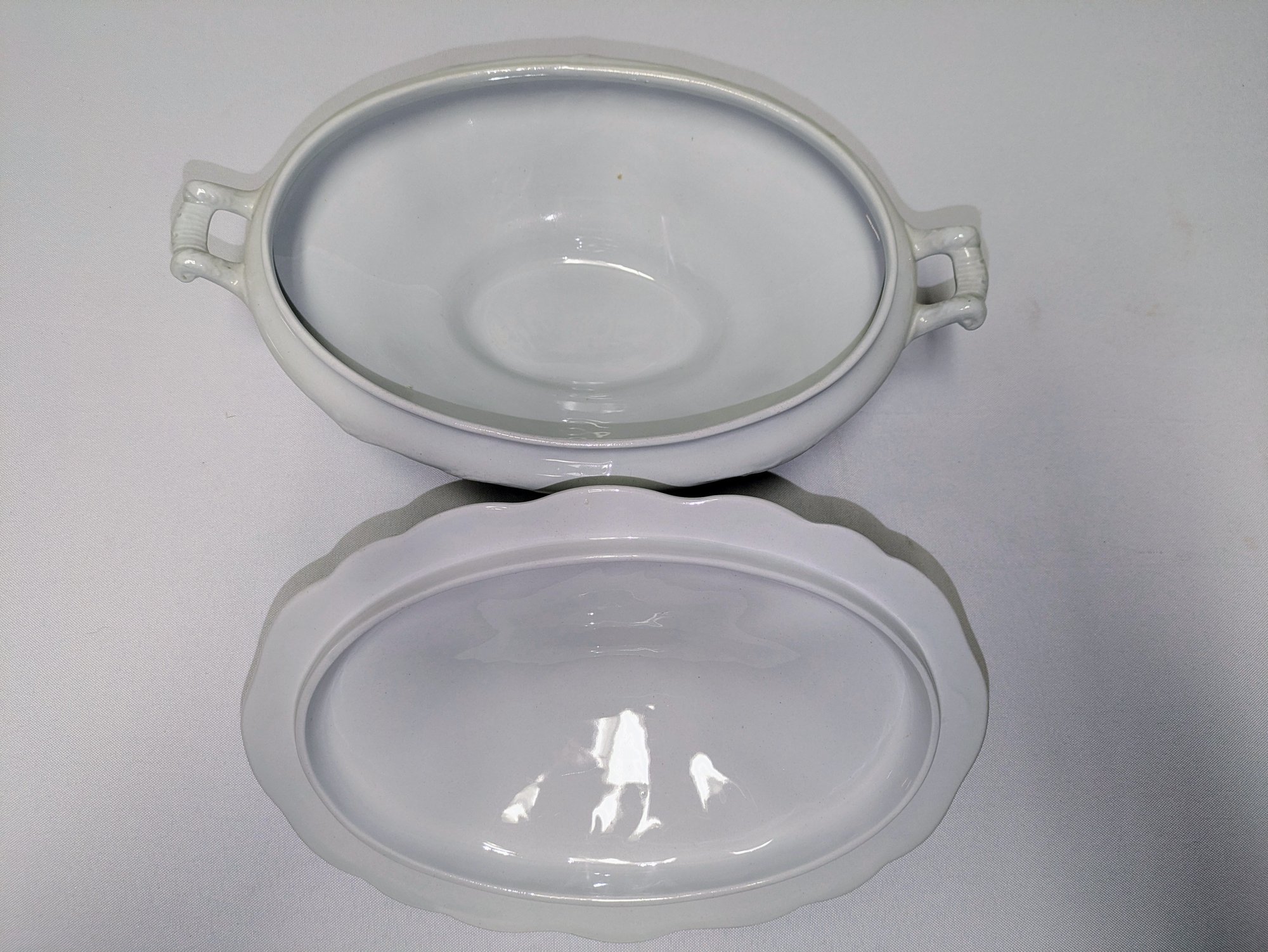 Antique/Vintage Bishop & Stonner, Ironstone, China Covered Oval Serving Bowl. Stunning all-white oval covered serving dish with a raised floral design pattern and two side handles. Some light marks are consistent with age and use. Overall, Excellent/Very Good Antique/Vintage Condition. Please see all photos as part of the description and condition. 6"H (with cover) x 4"H (without cover) x 7.5" x 12.5" (handle to handle)