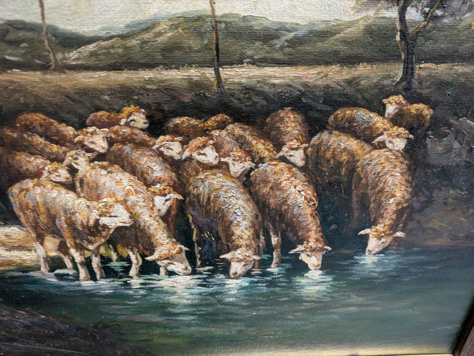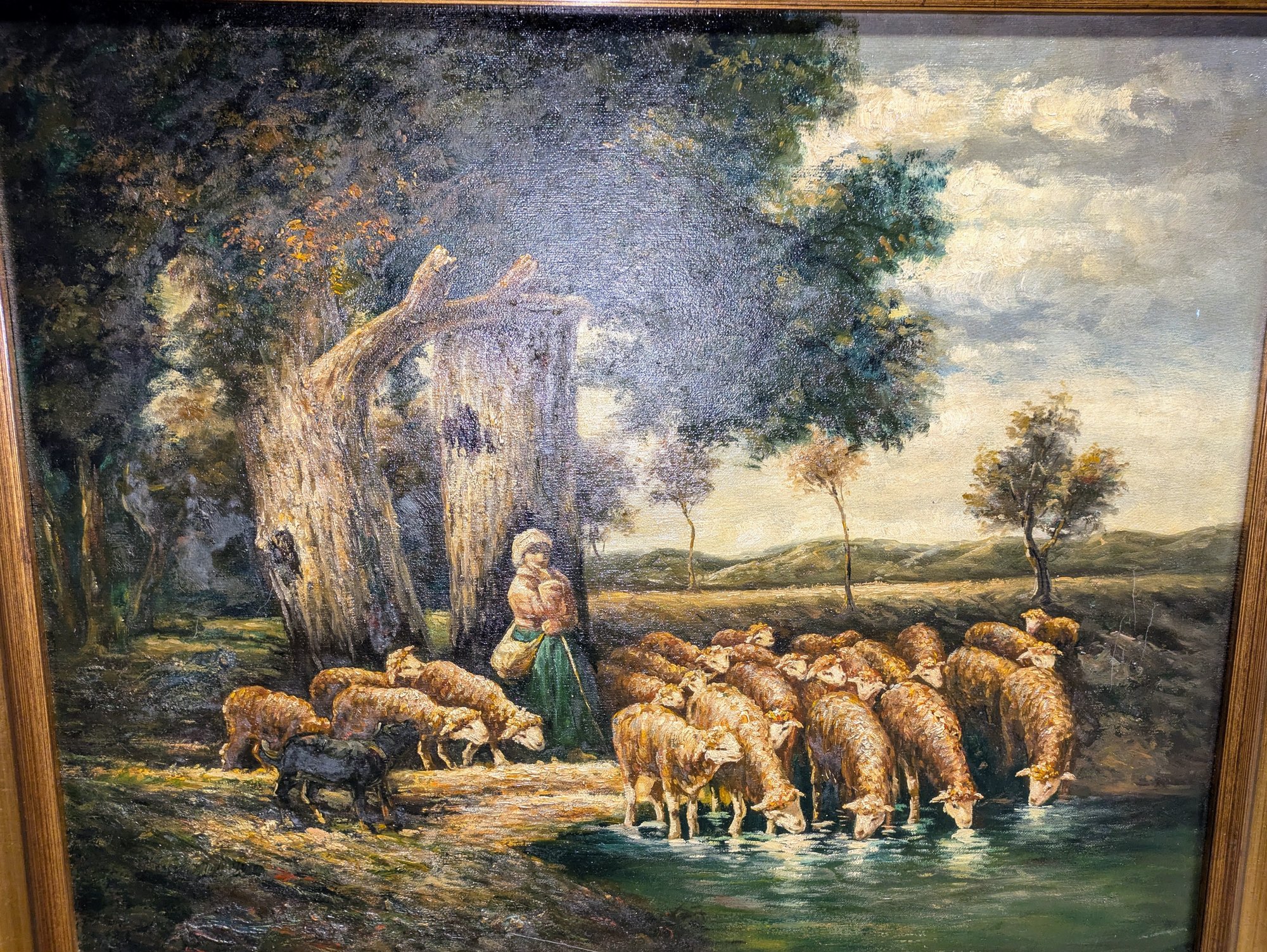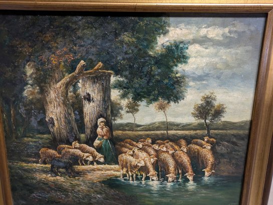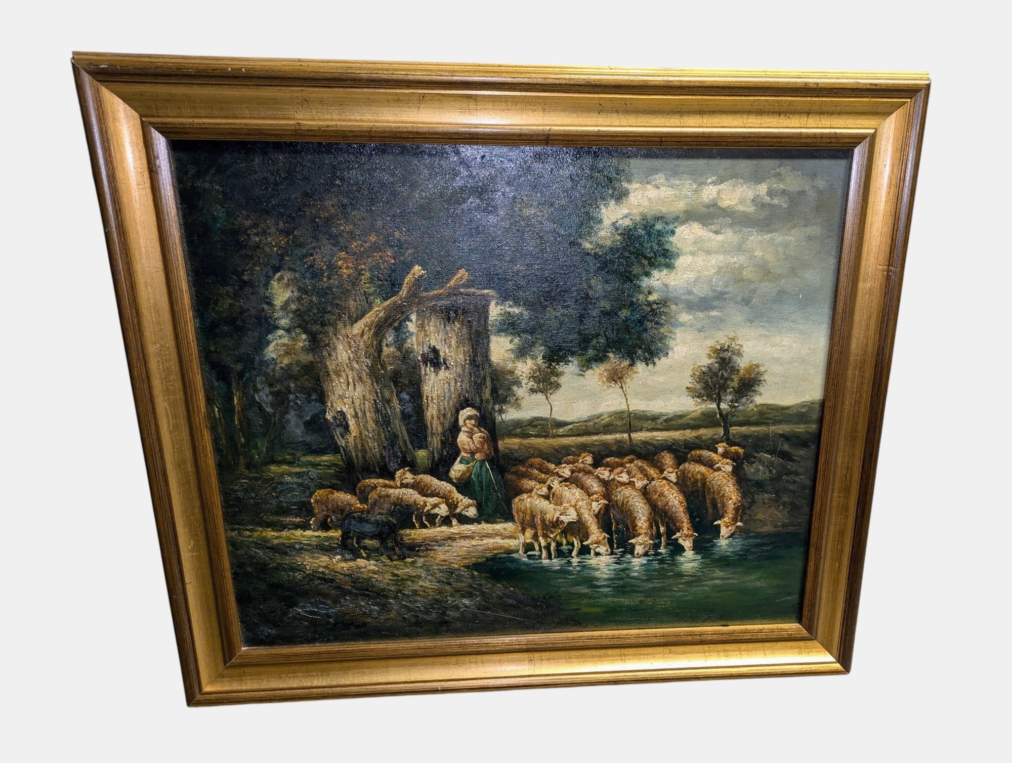 The style and subject matter are heavily influenced by 19th-century French artists like Charles-Émile Jacque. Depicts a standing shepherdess by a tree and sheep drinking from a pool, under large oak trees. Framed in a beautiful double-gilded gold frame made of wood and acrylic. There are some chips on the frame, but the painting is in excellent condition. Please see all photos as part of the description and condition. 6"H x 9.5" x 13.5"