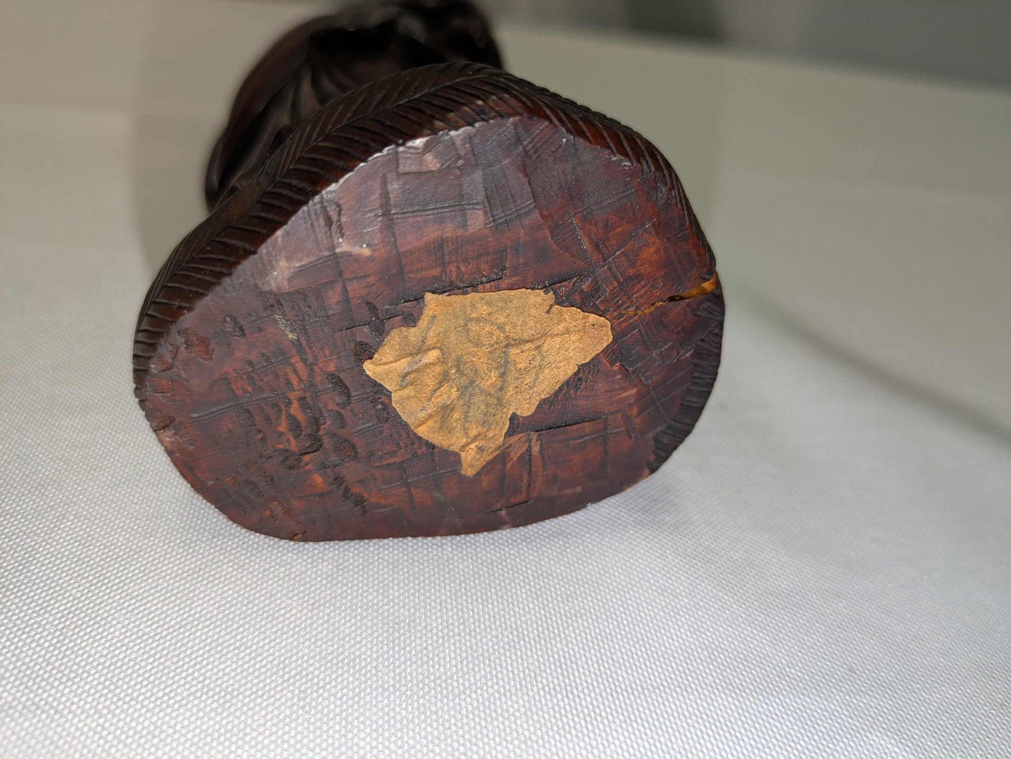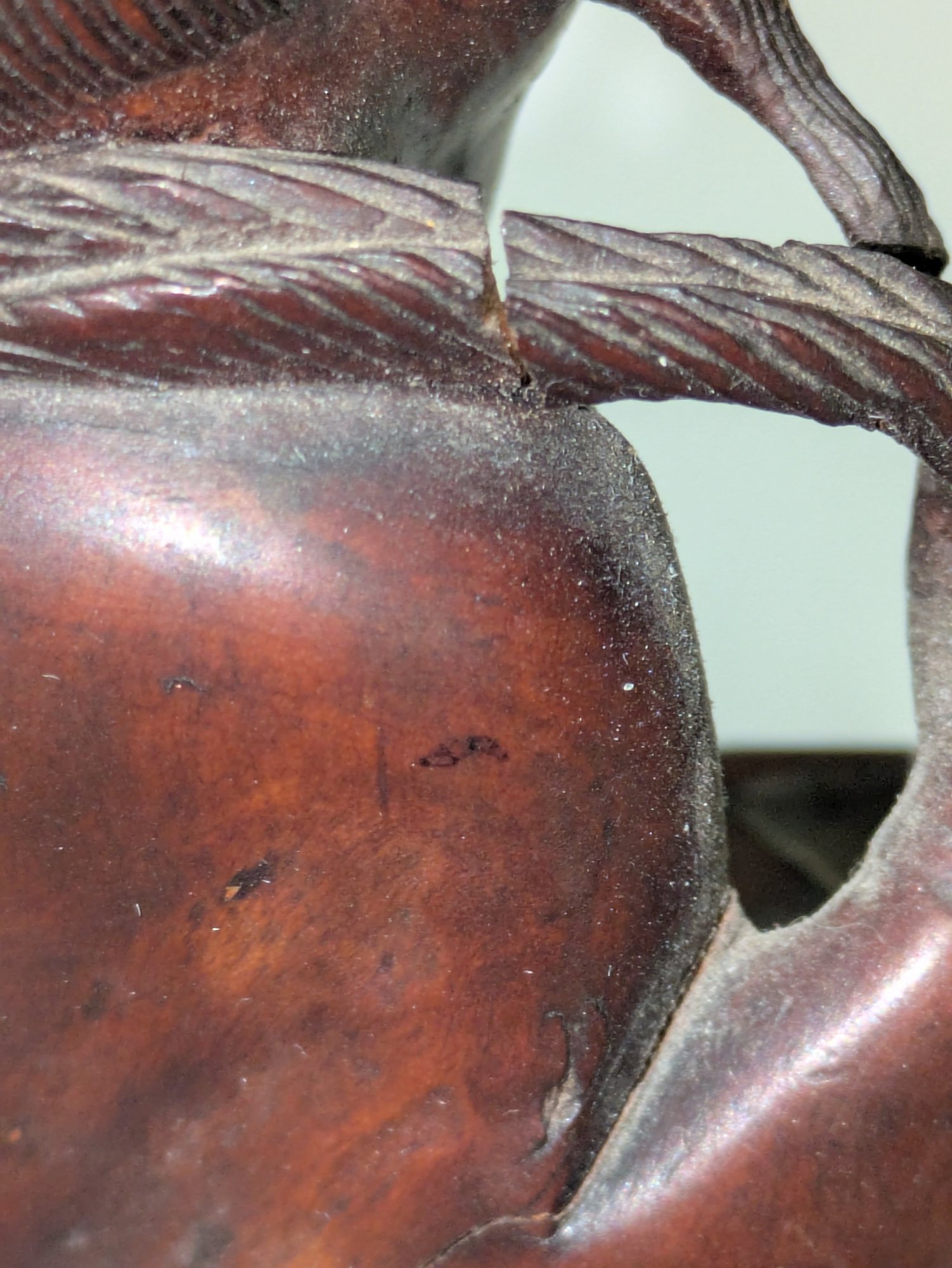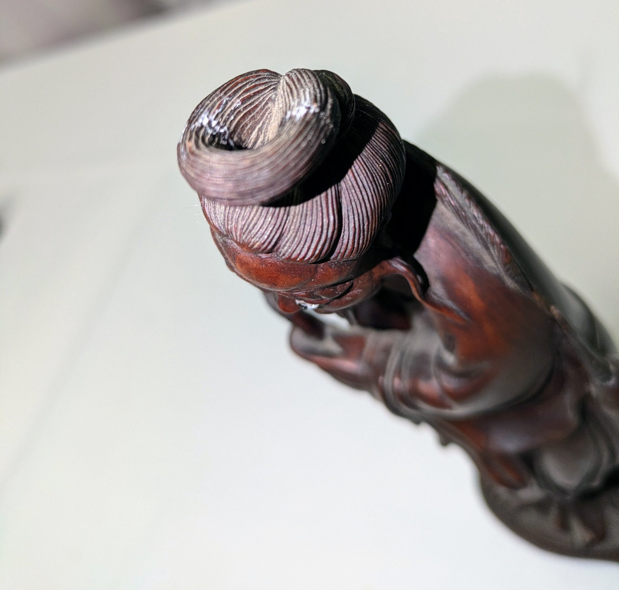 Great detailing and design. Some light marks and normal wear, consistent with age and use. The hair on the top has been reglued at some point, and there is a small crack in the rope near the shoulder (see photos), all consistent with age and movement. Please see all photos as part of the description and condition. 8"H