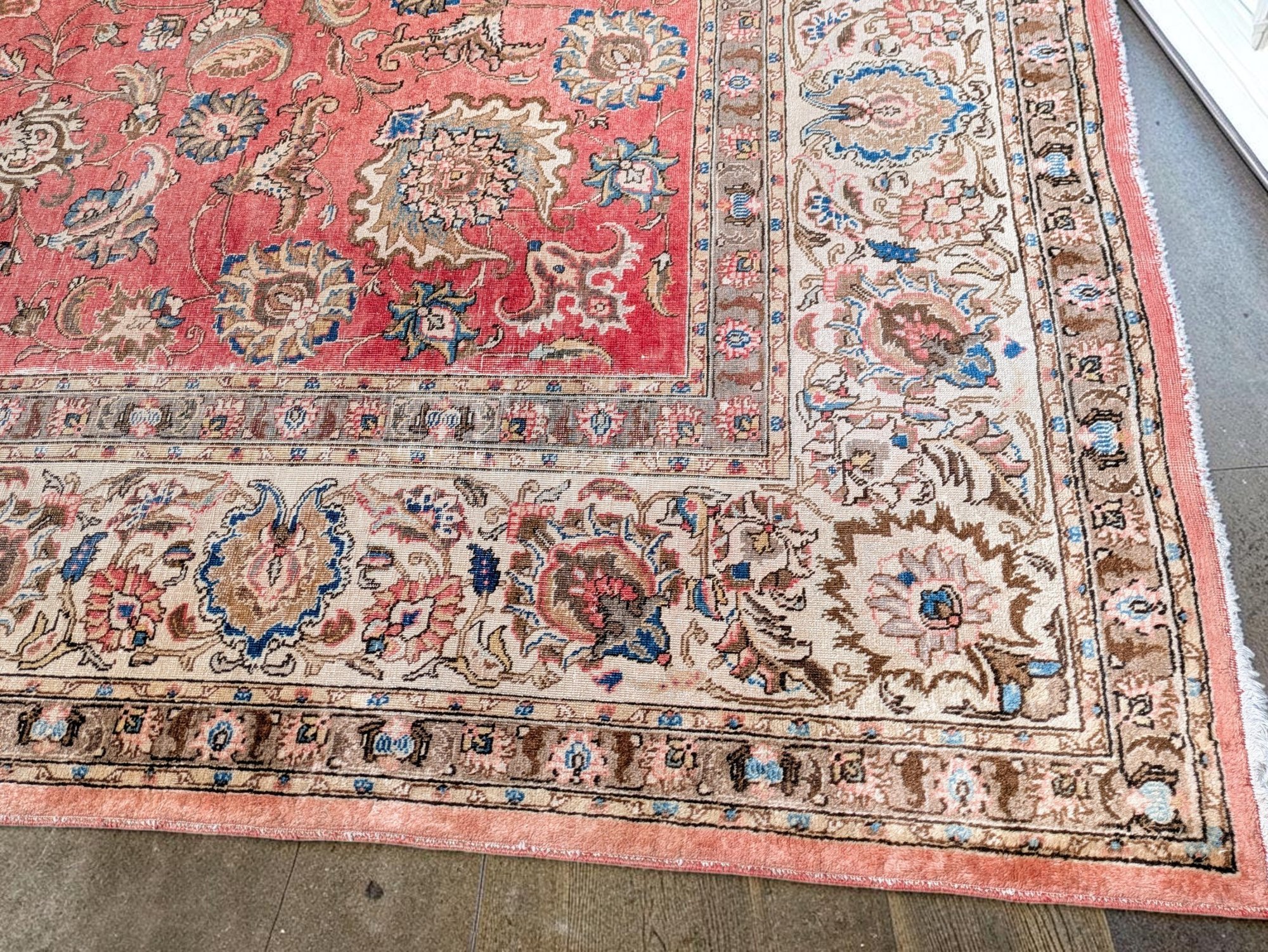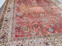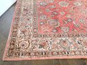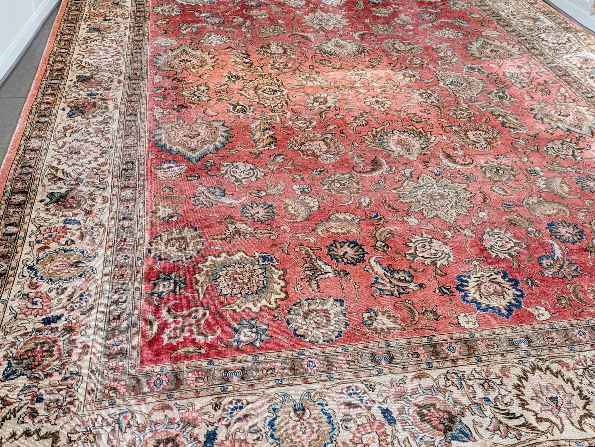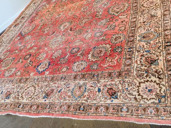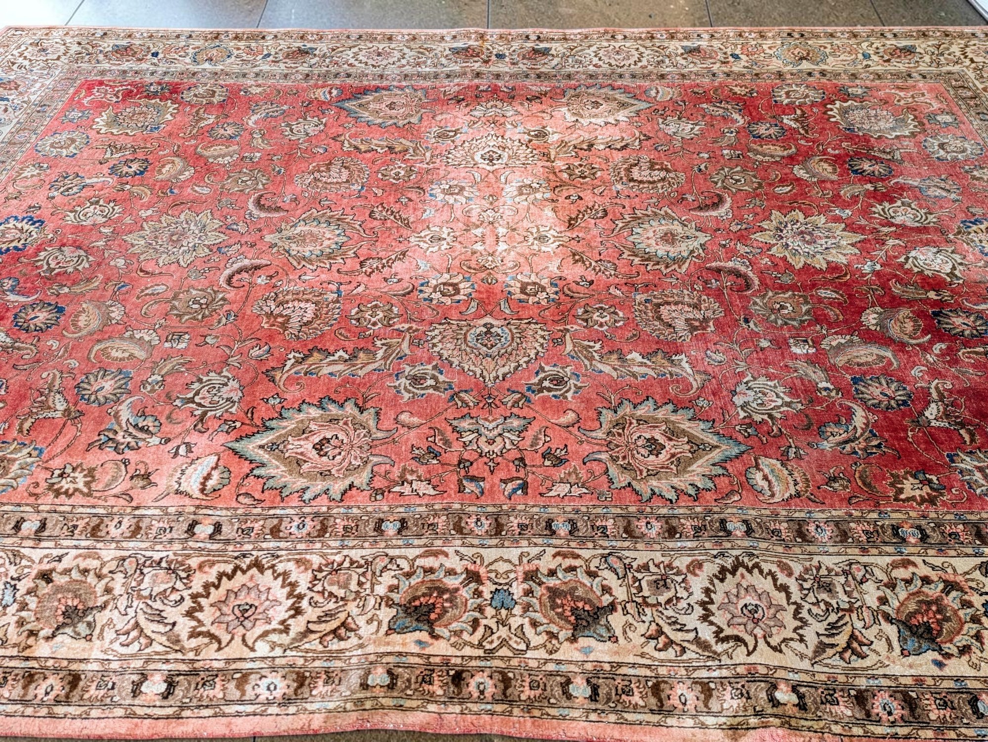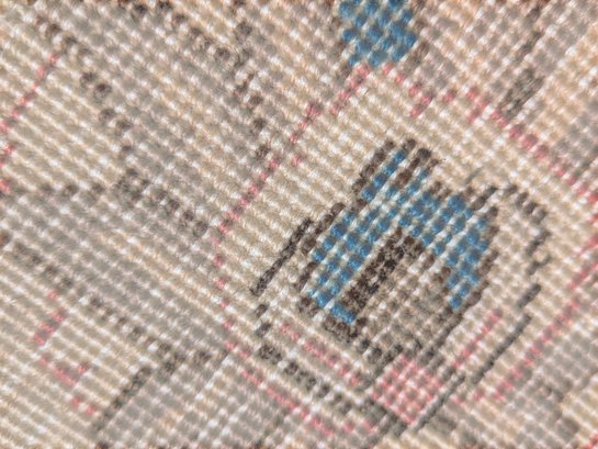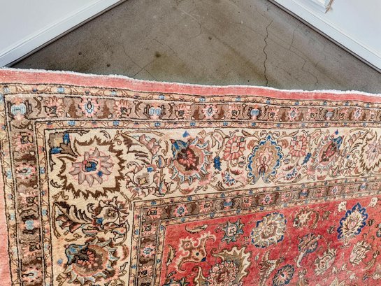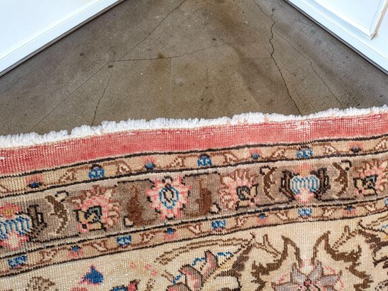Features a traditional floral medallion pattern in red, beige, and blue tones. Shows wear and fading areas, consistent with age, use, and placement in the home. Still in Pretty Good Condition for its Age. Please see all photos as part of the description and condition.